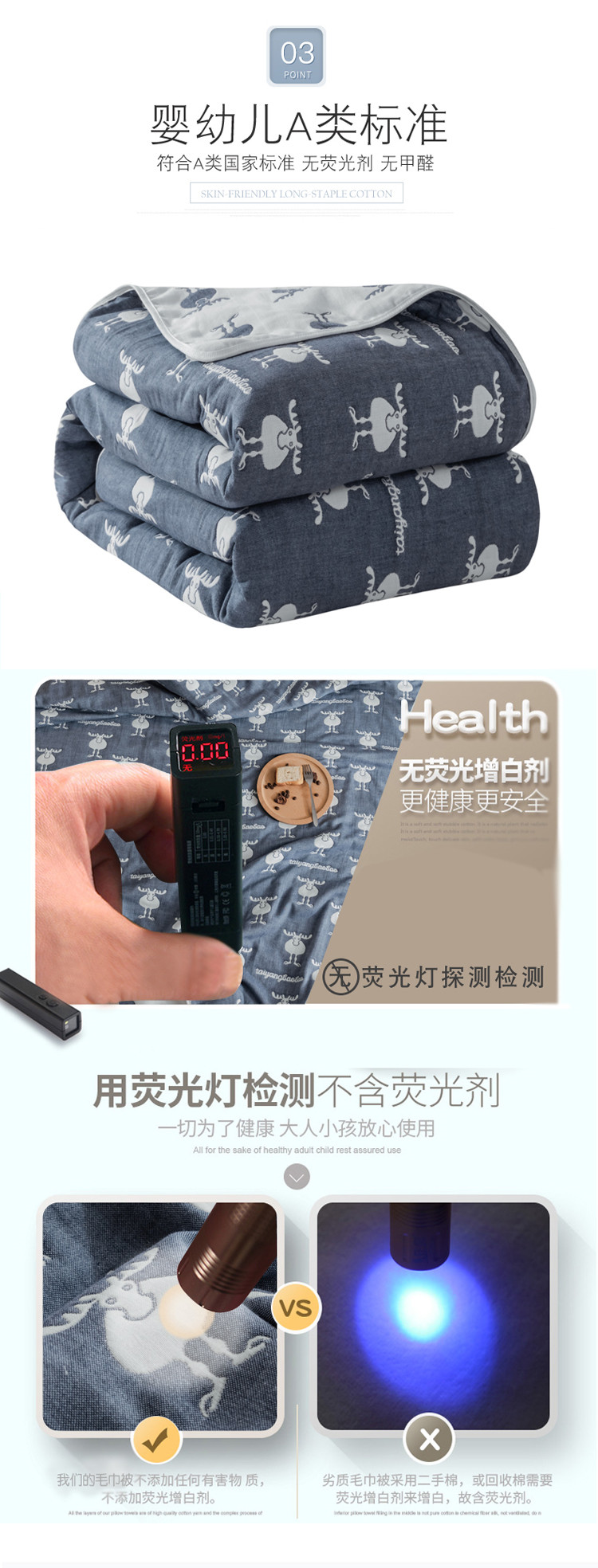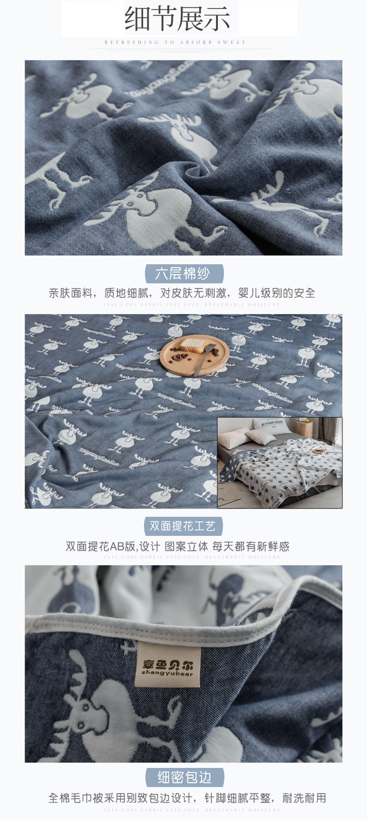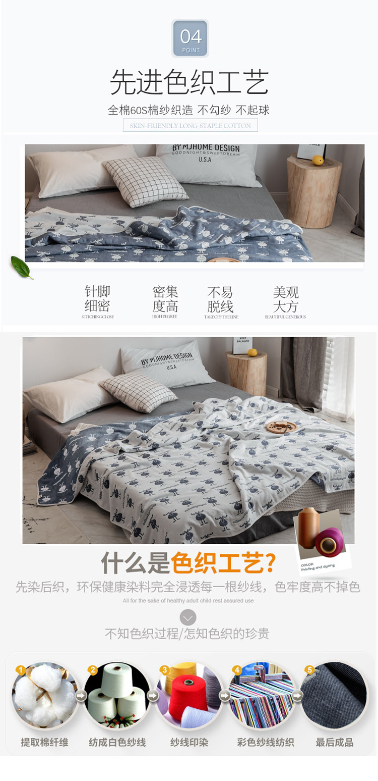 商品名称:朴尔家纺 六层全棉纱布毛巾被 麋鹿蓝