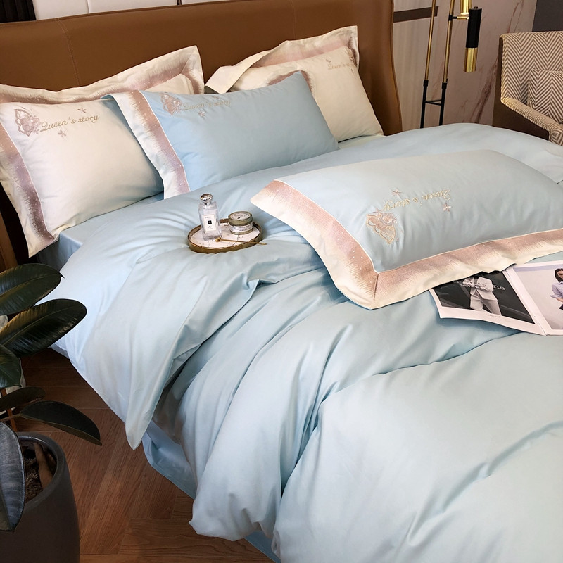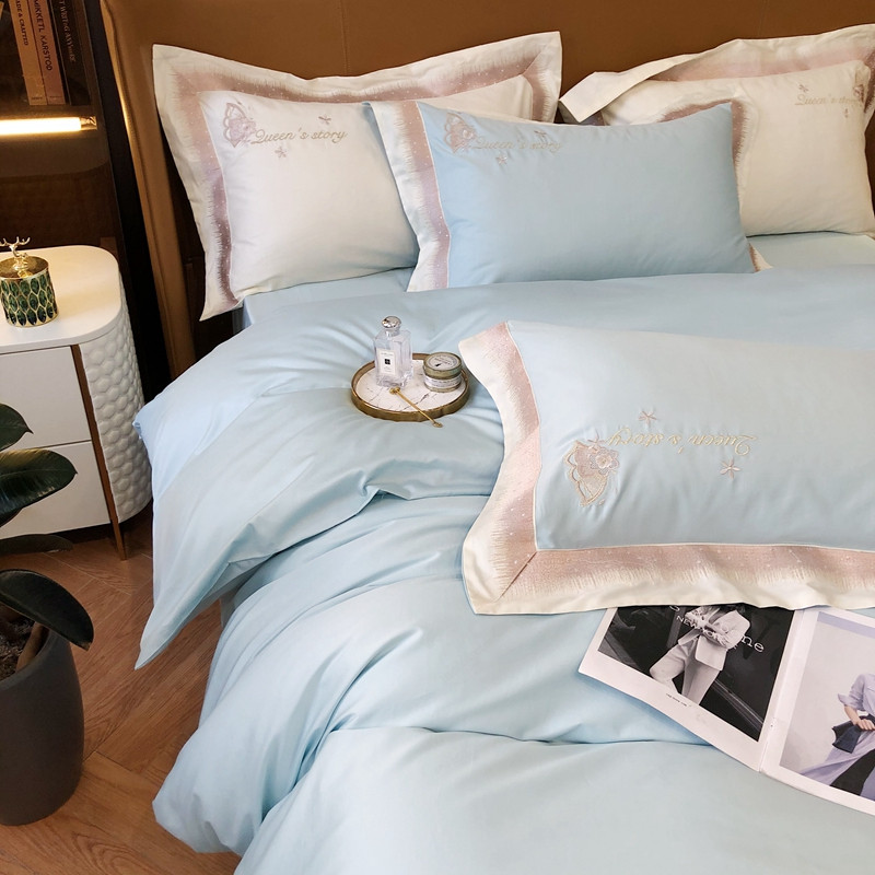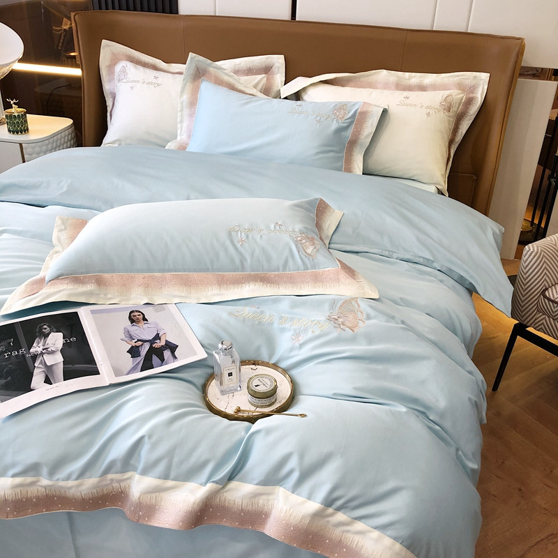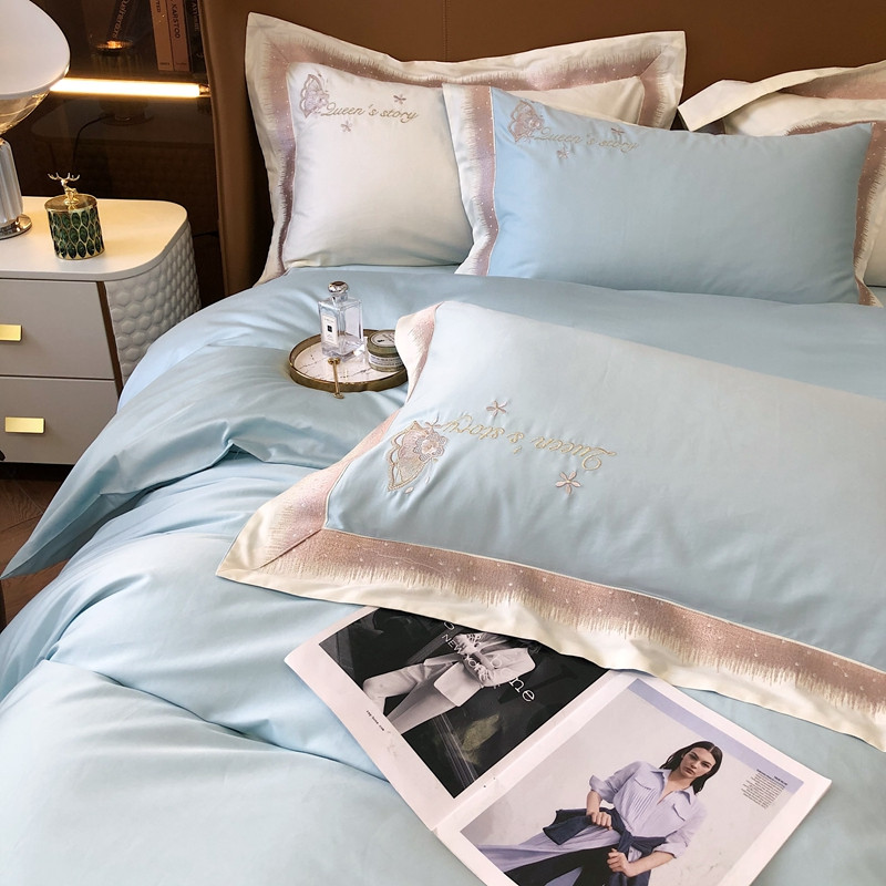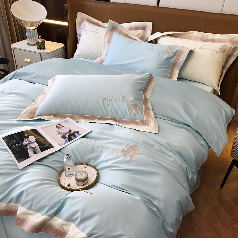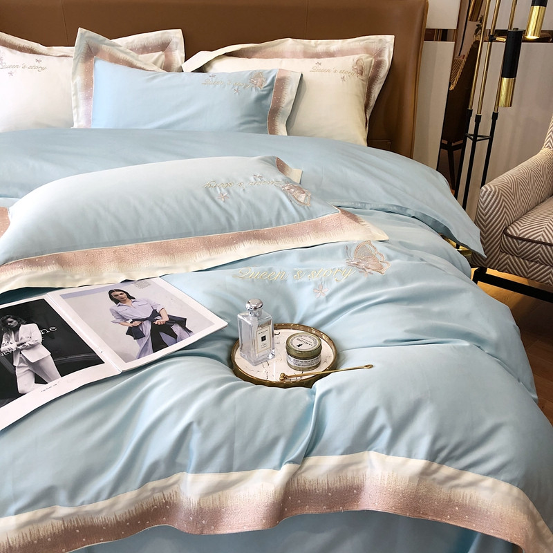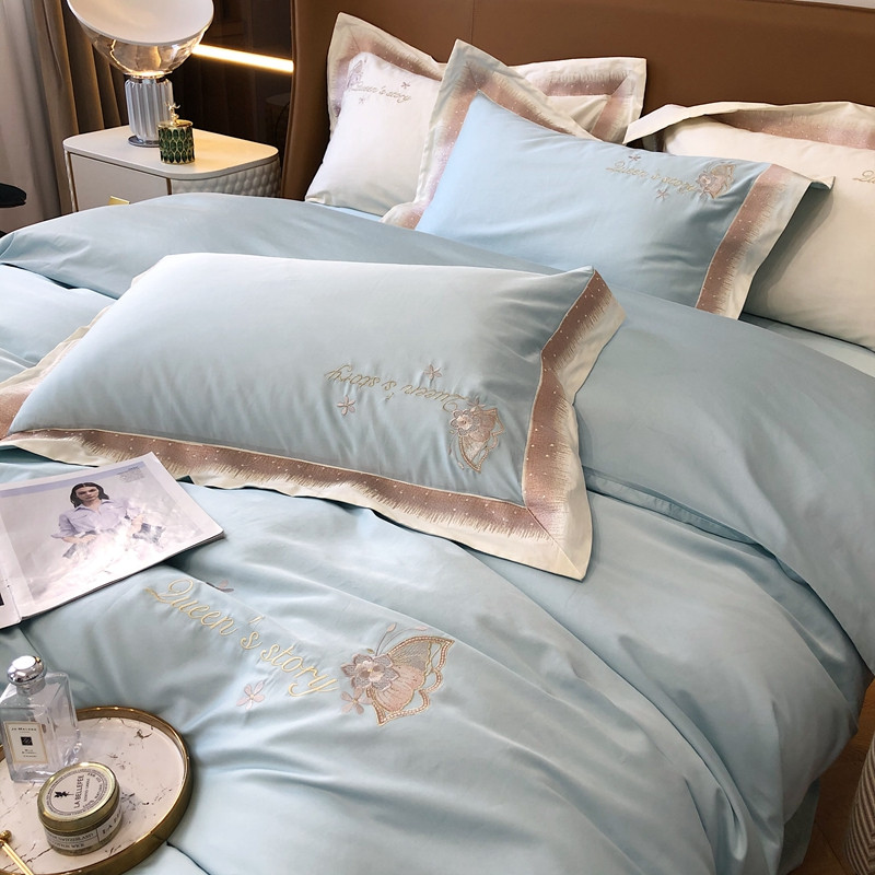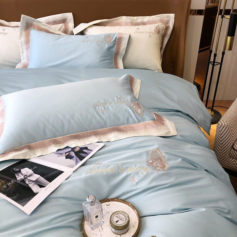 商品名称:馨蕊2021秋冬新品100支澳棉四件套高定系列 蝶恋-湖水蓝