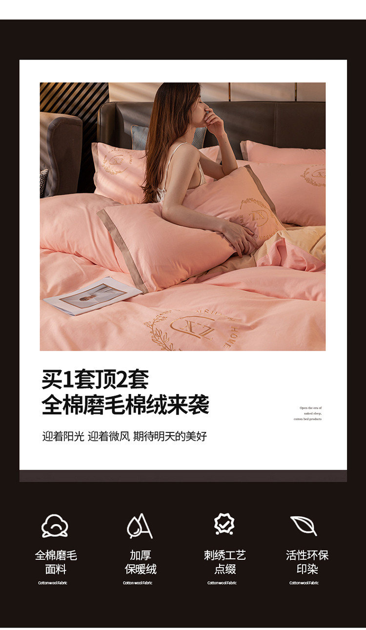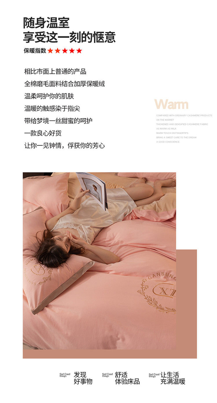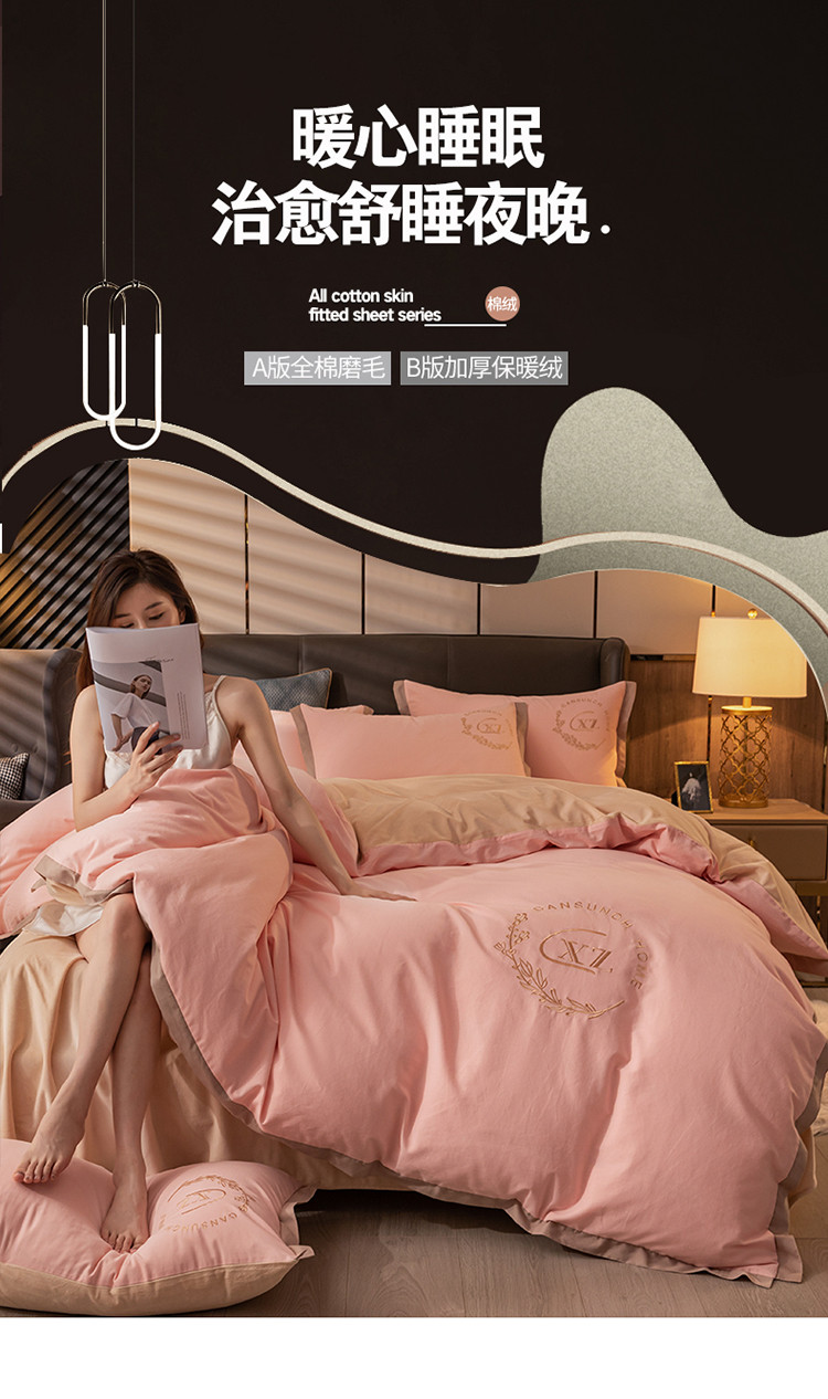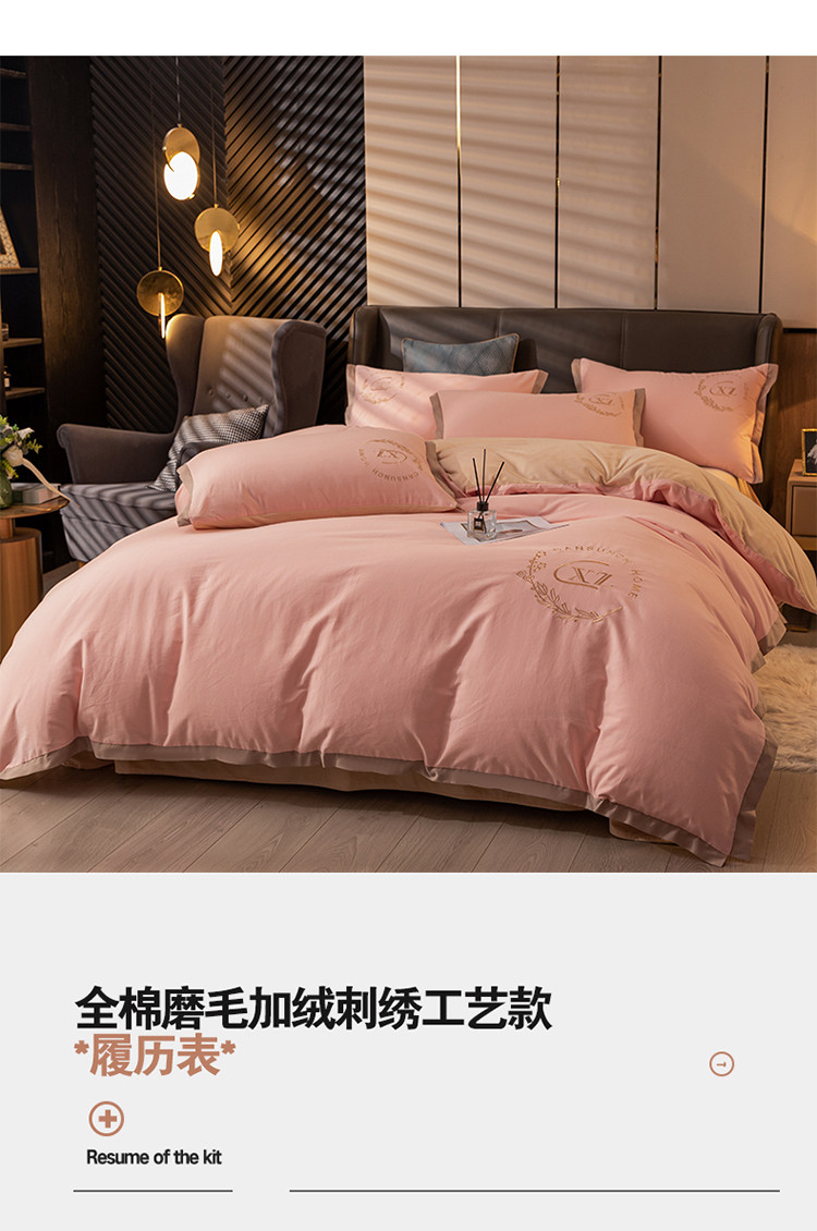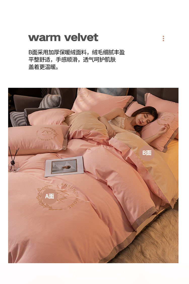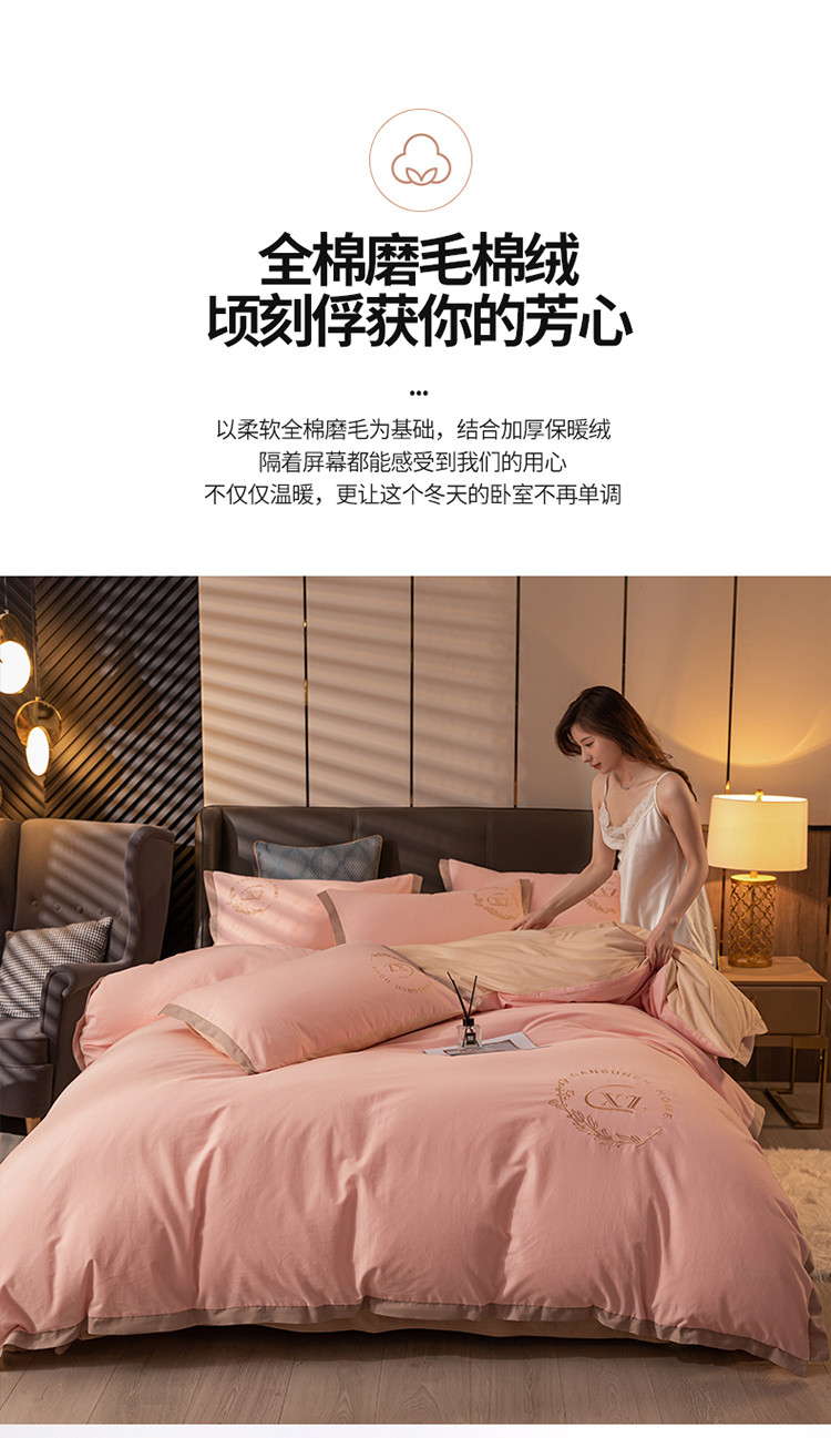 商品名称:蓝米卡夫 2024冬季升级款保暖全棉磨毛牛奶绒刺绣四件套 玫瑰粉