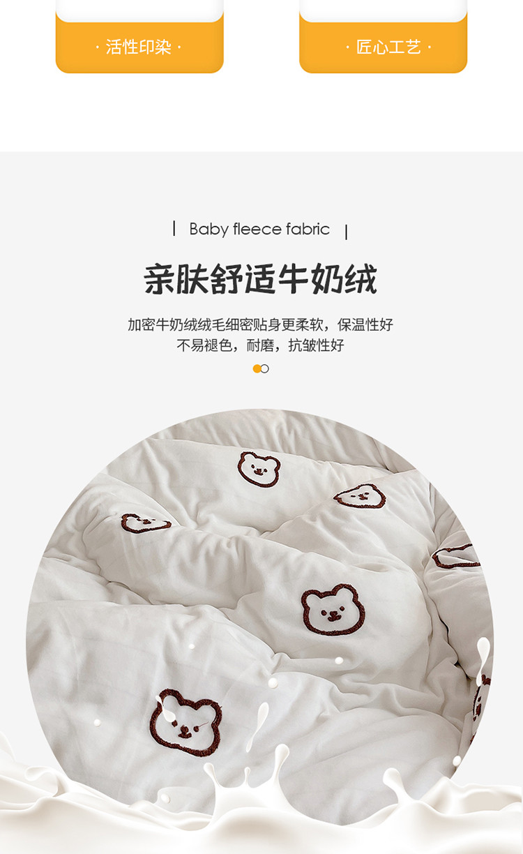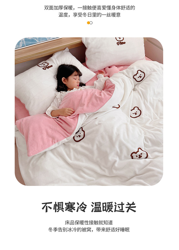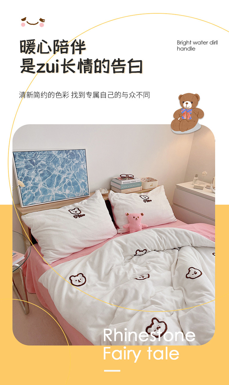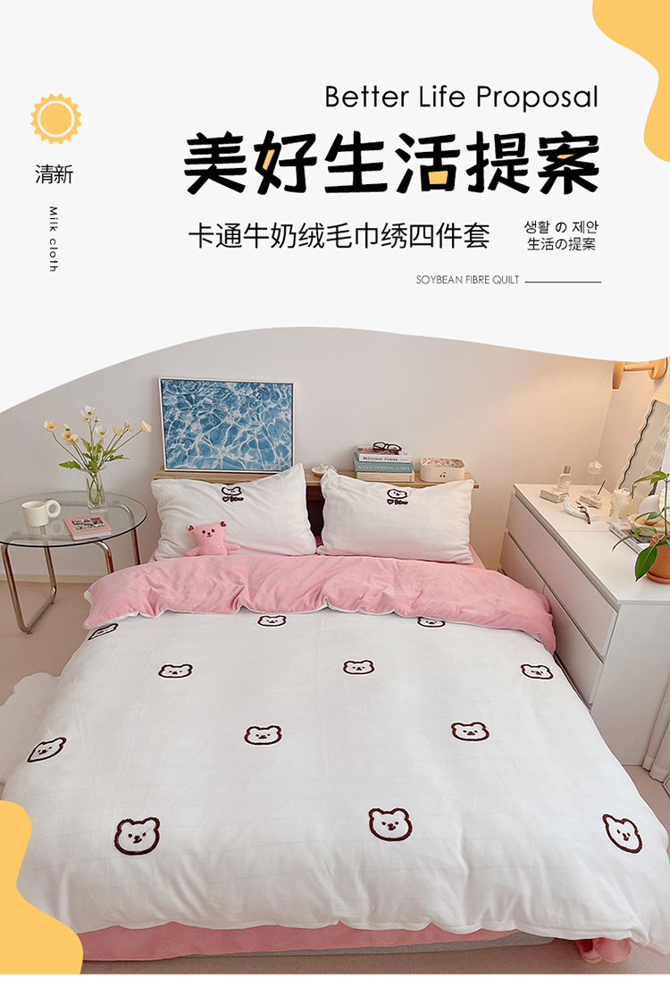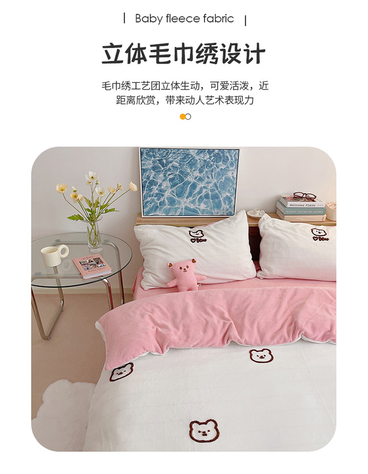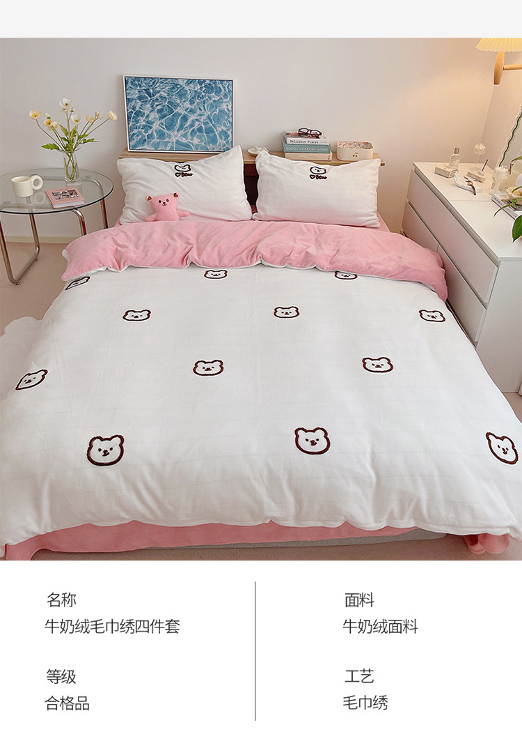 商品名称:雅居纺 2022新款牛奶绒毛巾绣四件套拍摄风格1 可爱熊-白粉