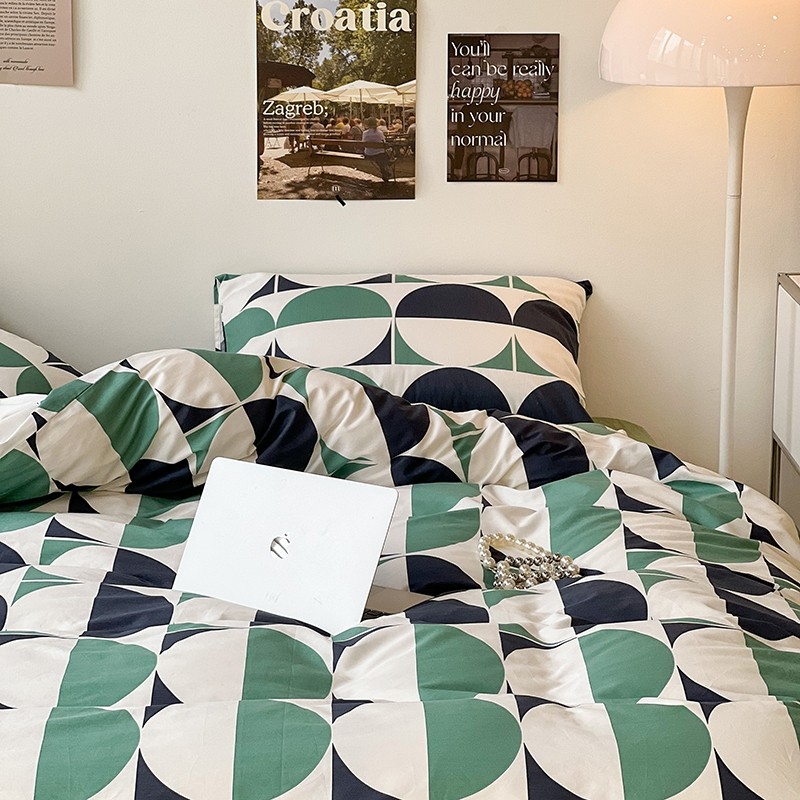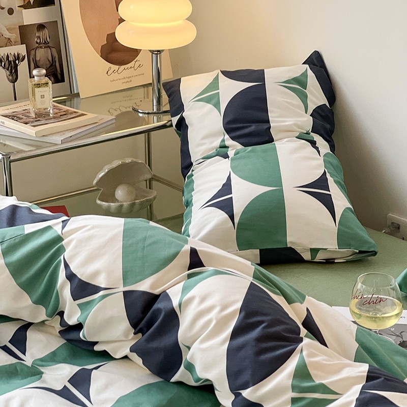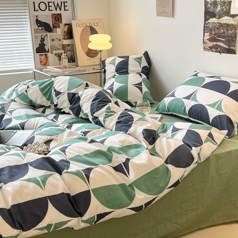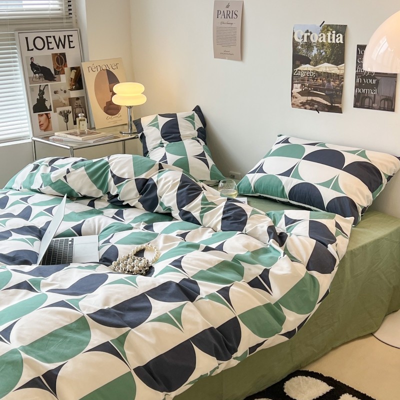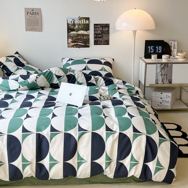 商品名称:昔可家纺 2022新款简约几何北欧风全棉四件套 绿色拼接圈