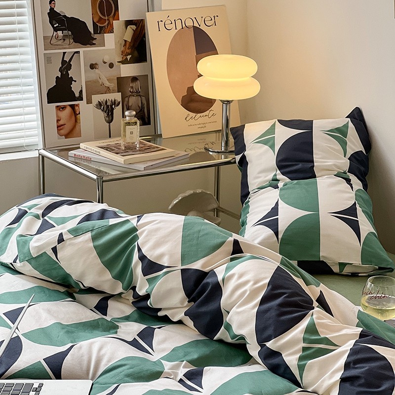 昔可家纺 2022新款简约几何北欧风全棉四件套 绿色拼接圈