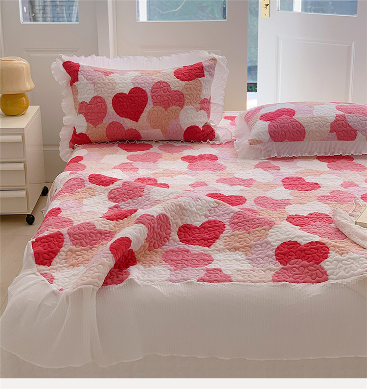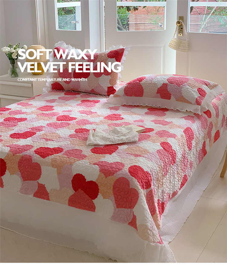 桃子ins韩版亲肤加厚牛奶绒雪纺花边床盖三件套 心心相印