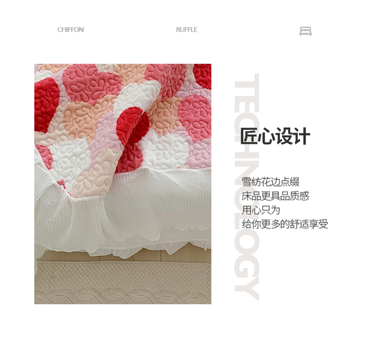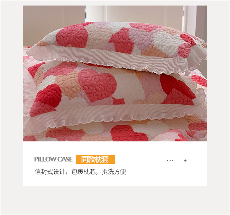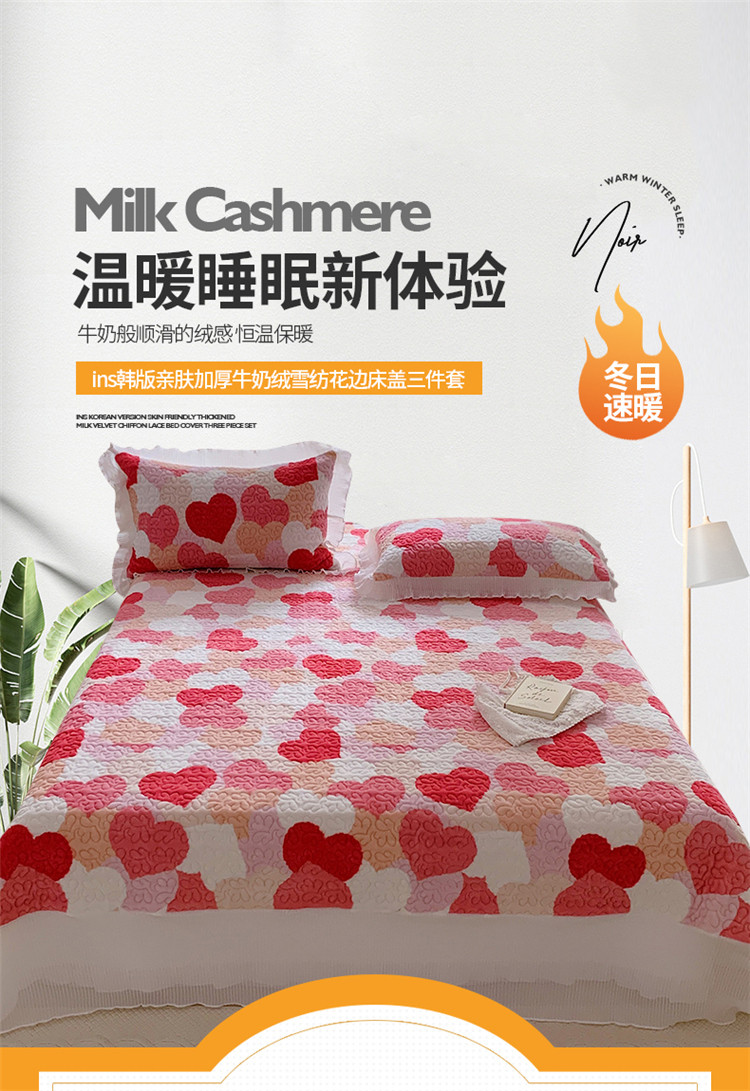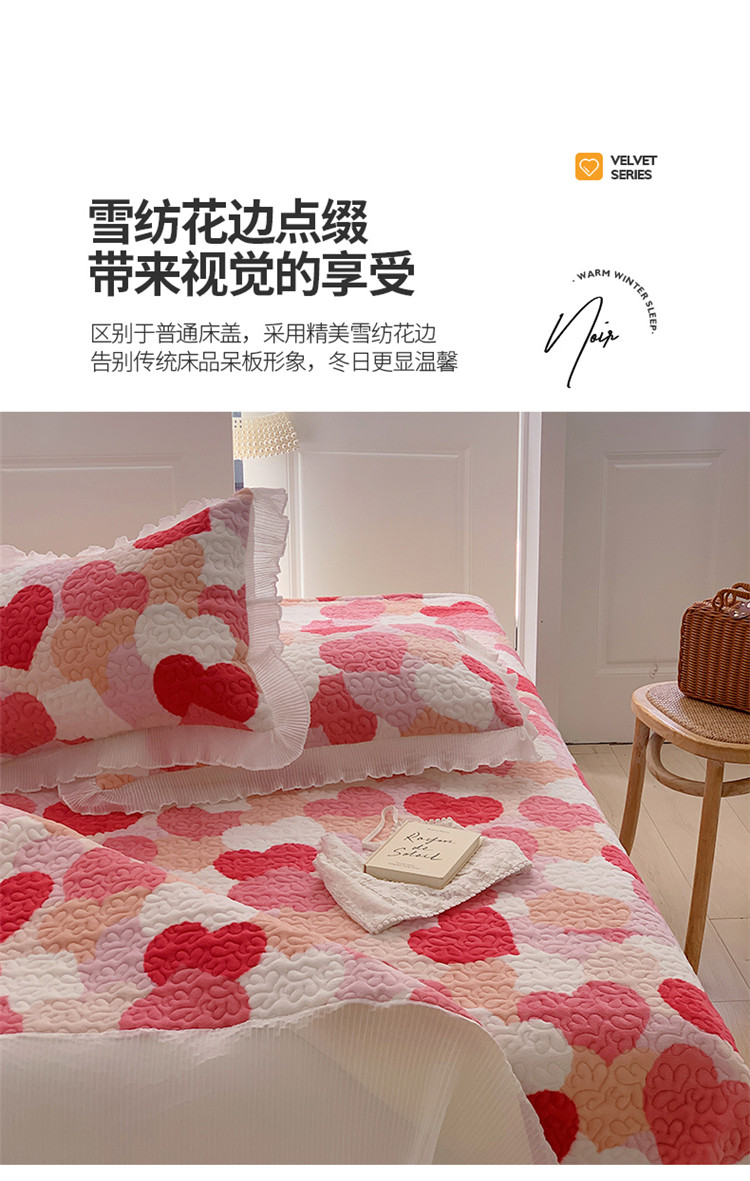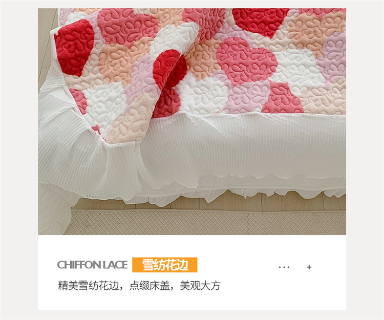 商品名称:桃子ins韩版亲肤加厚牛奶绒雪纺花边床盖三件套 心心相印