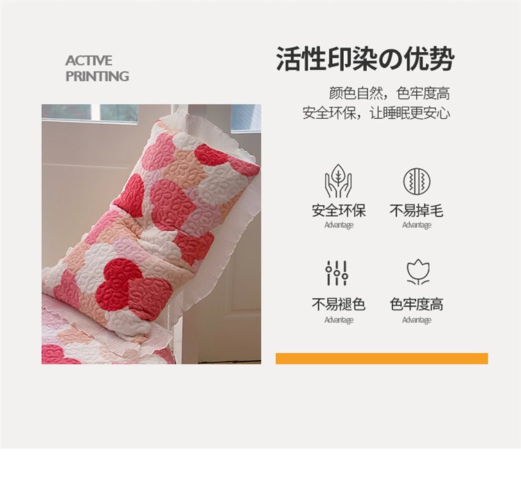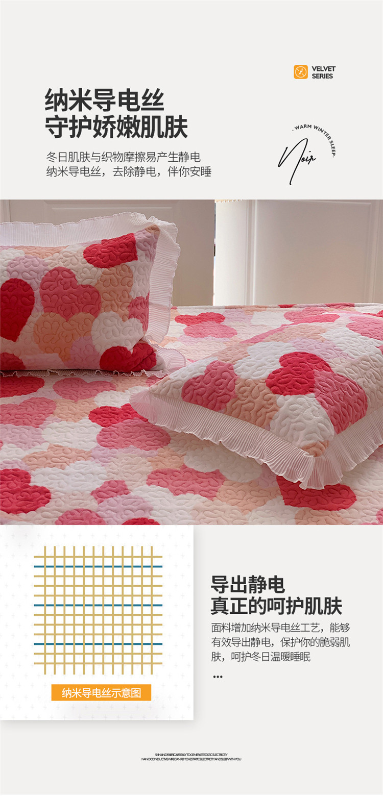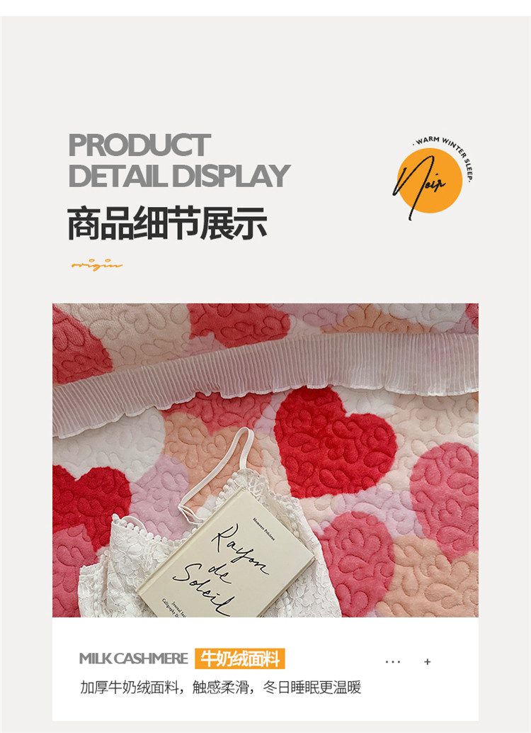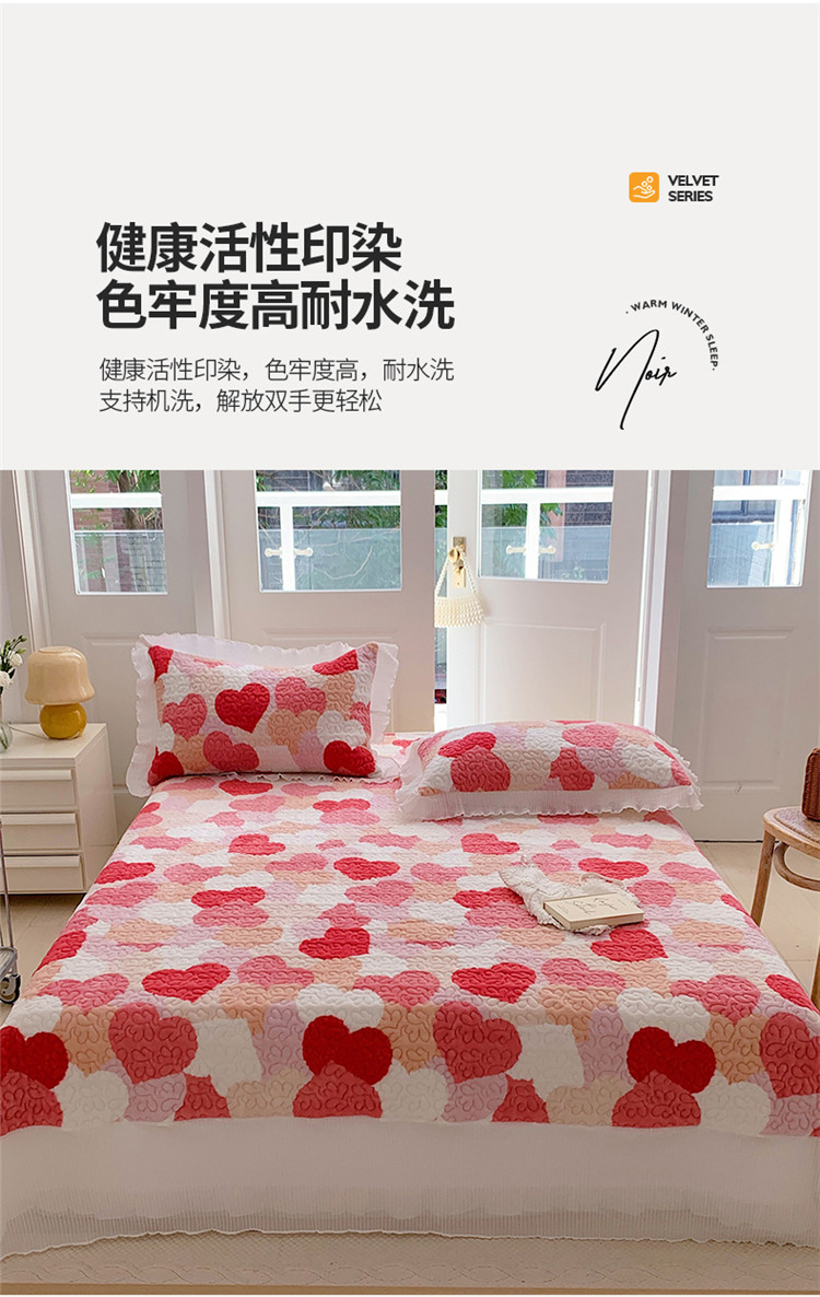 商品名称:桃子ins韩版亲肤加厚牛奶绒雪纺花边床盖三件套 心心相印