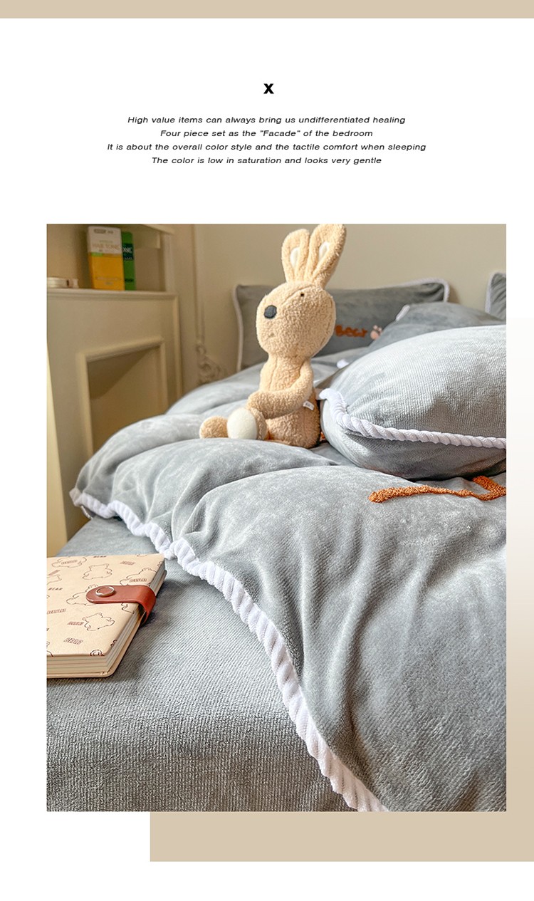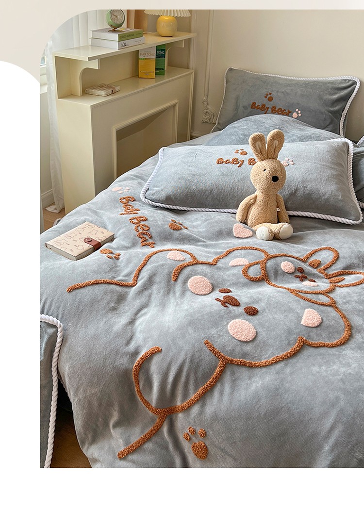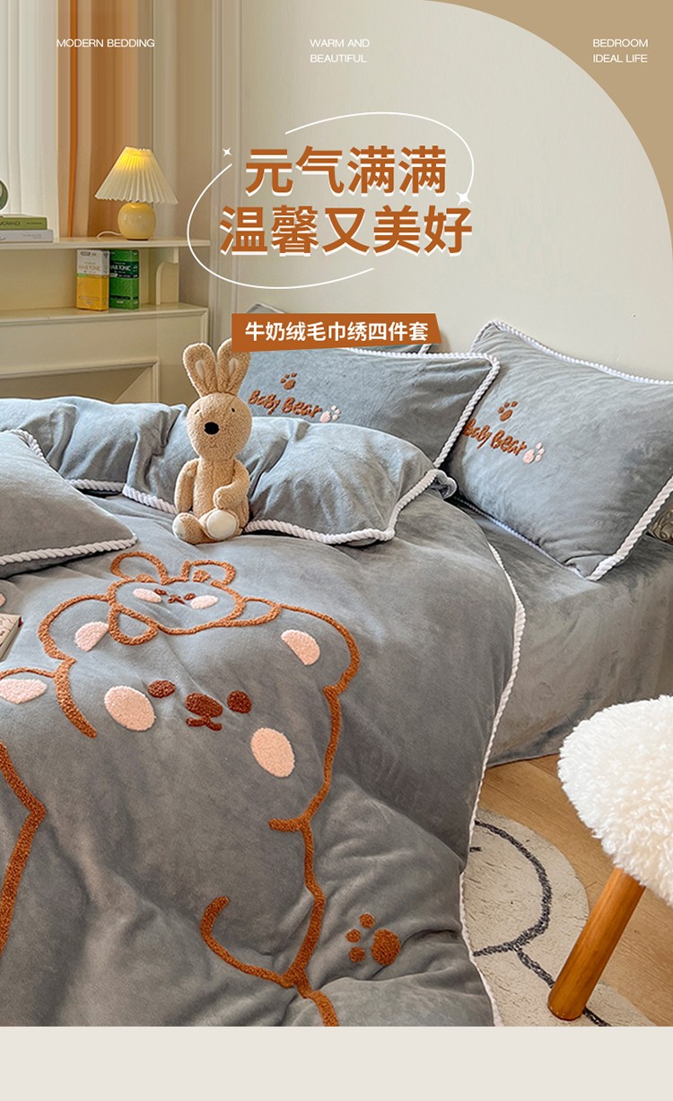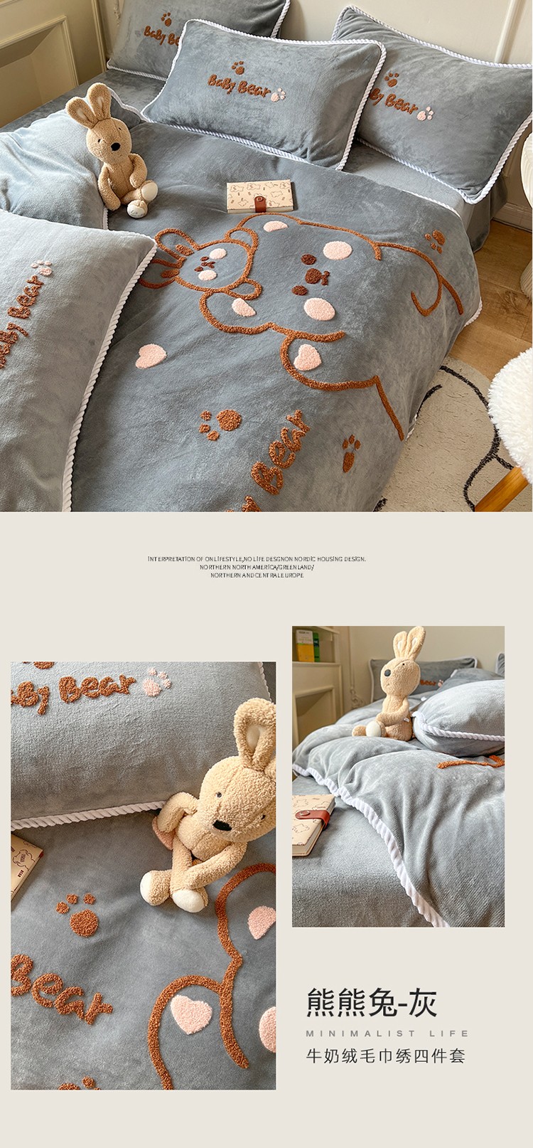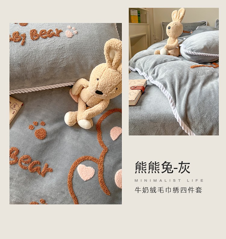 芯贝儿 新款加厚保暖雕花牛奶绒毛巾绣花宝宝法莱绒四件套 熊熊兔-灰