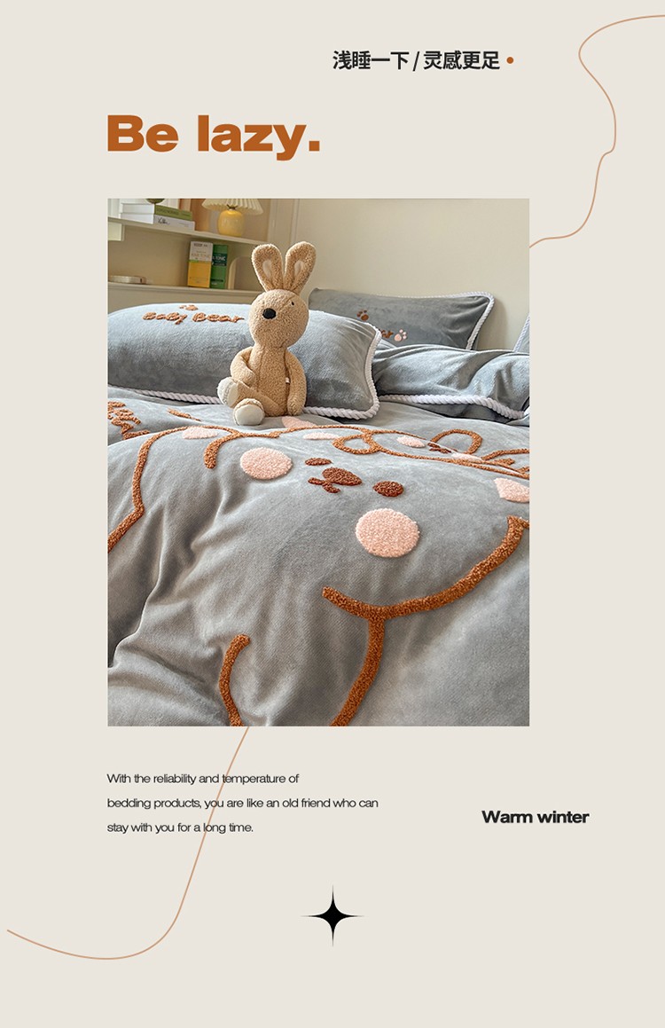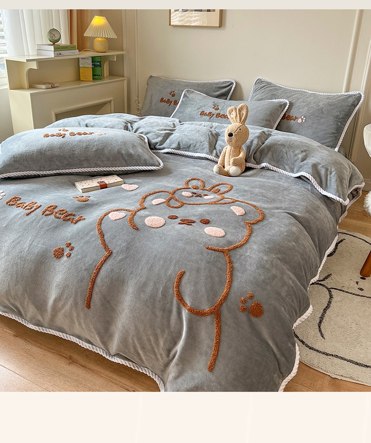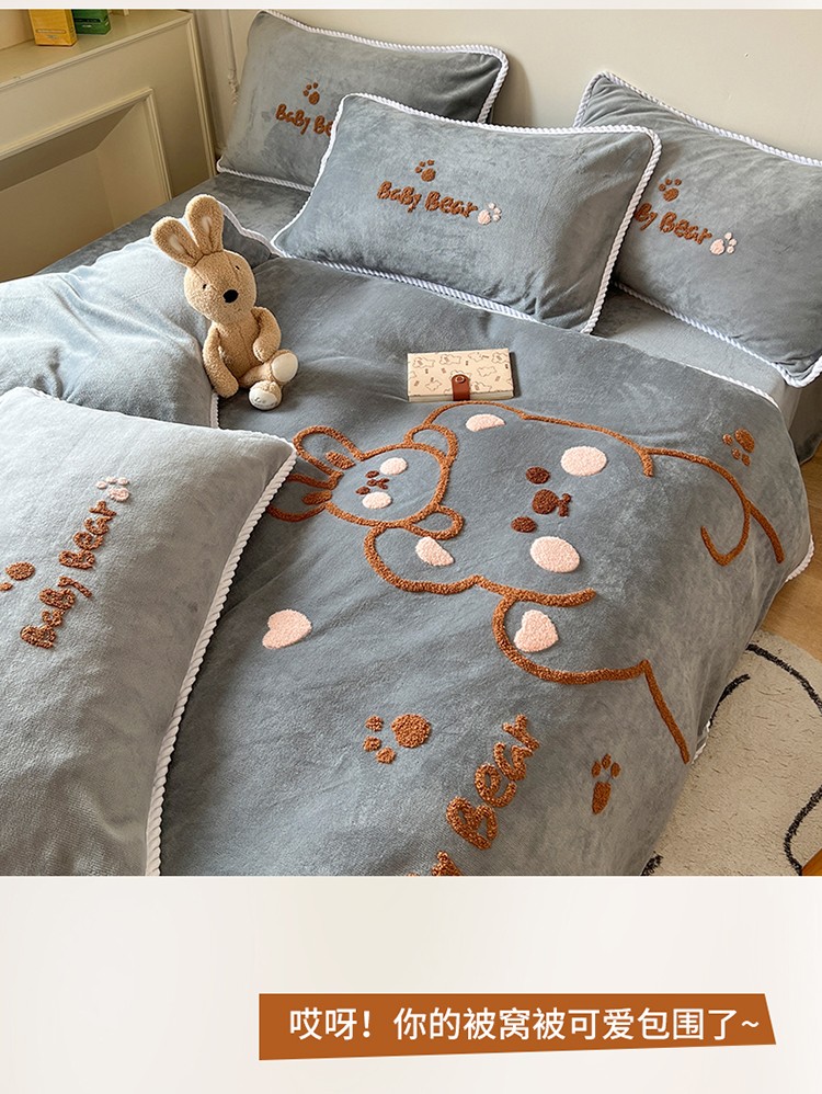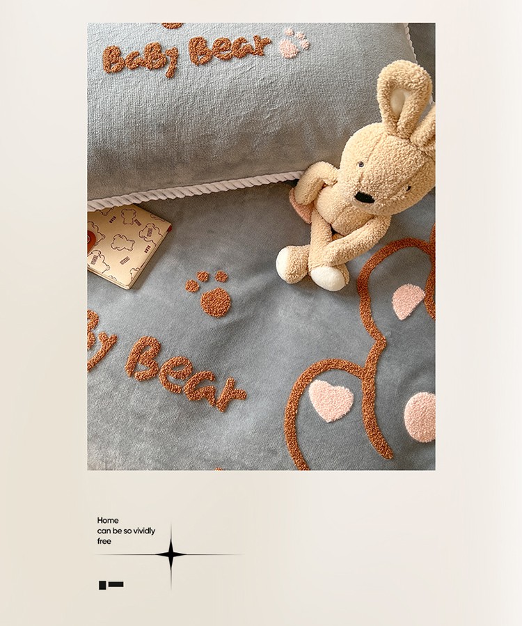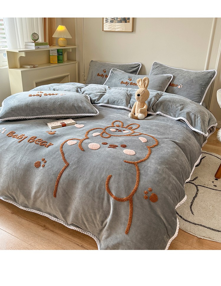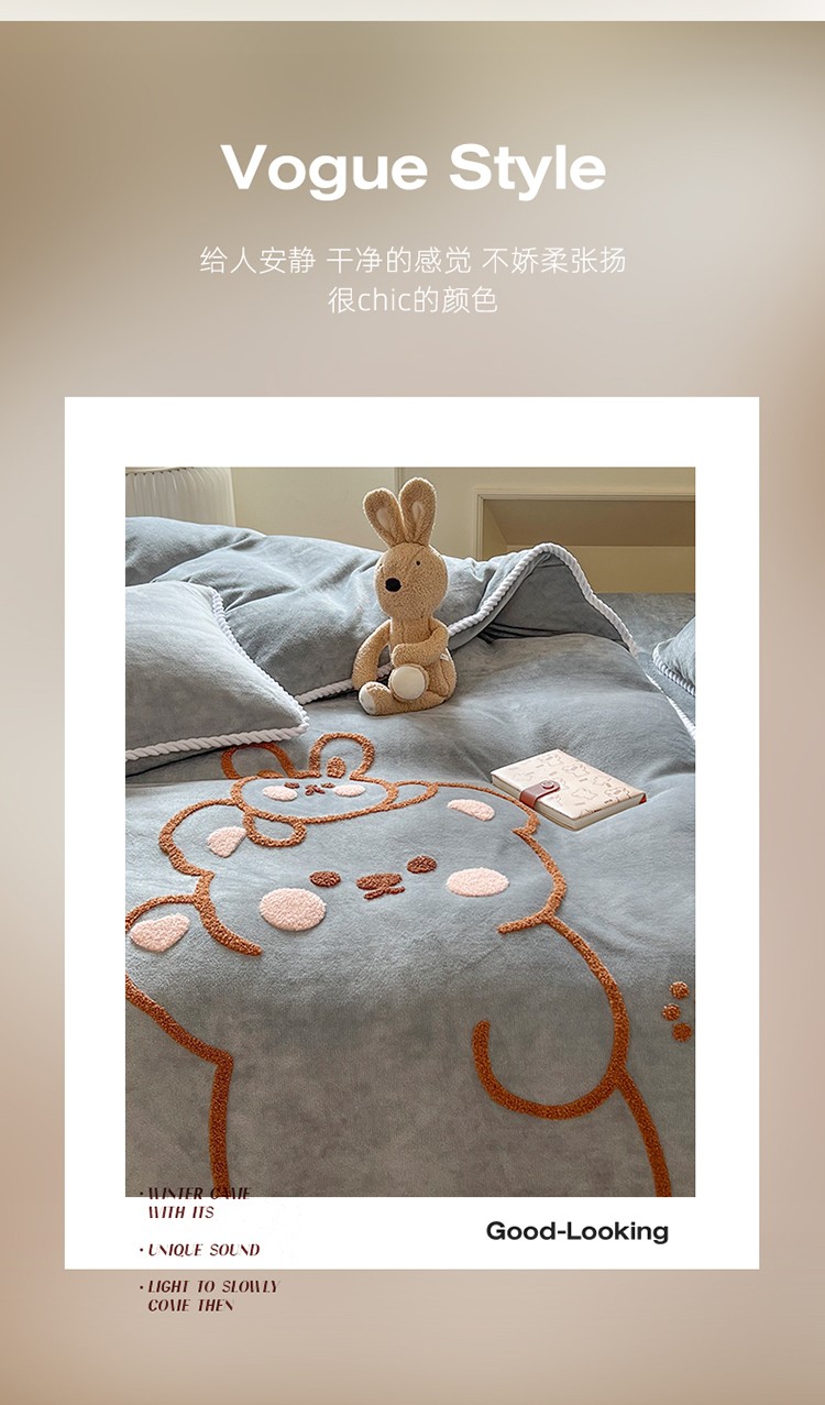芯贝儿 新款加厚保暖雕花牛奶绒毛巾绣花宝宝法莱绒四件套 熊熊兔-灰