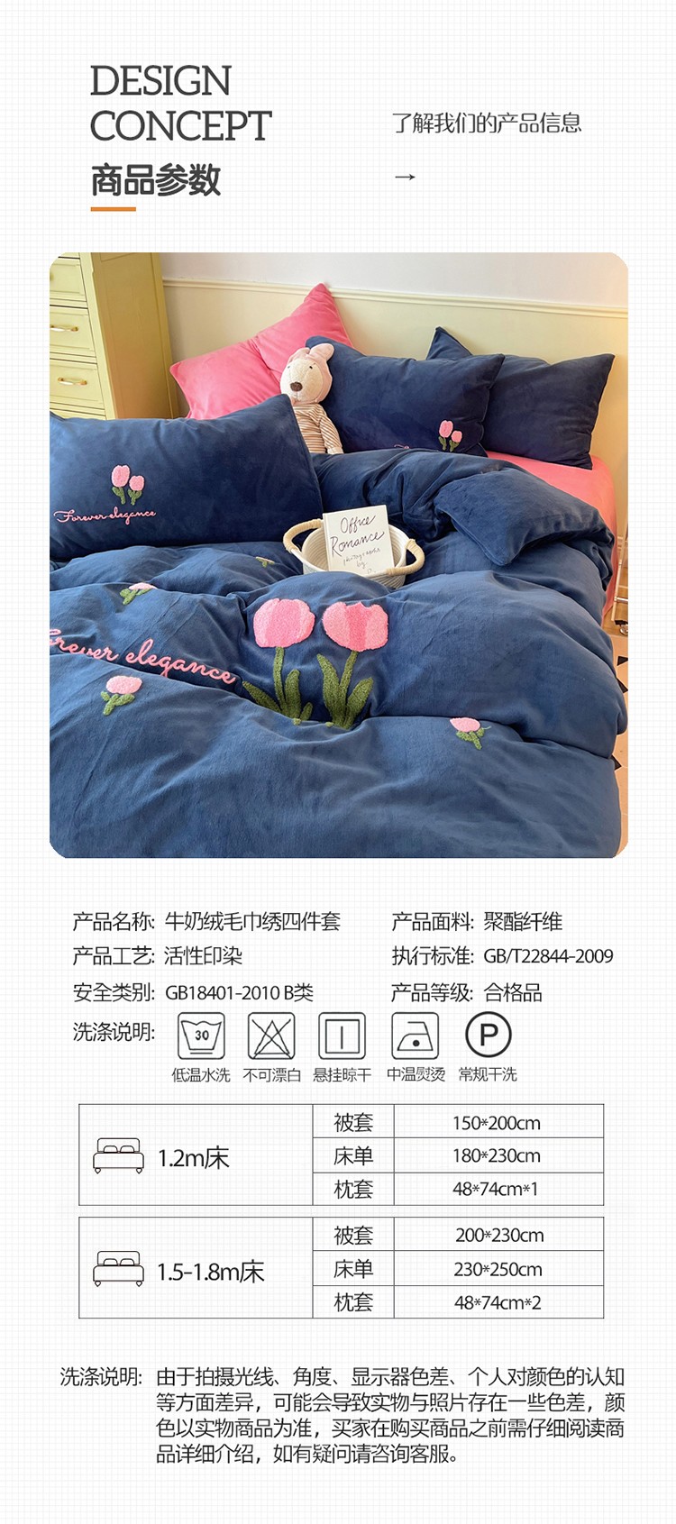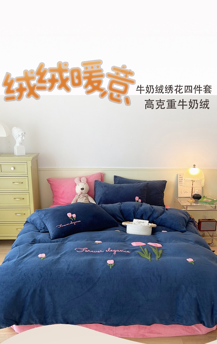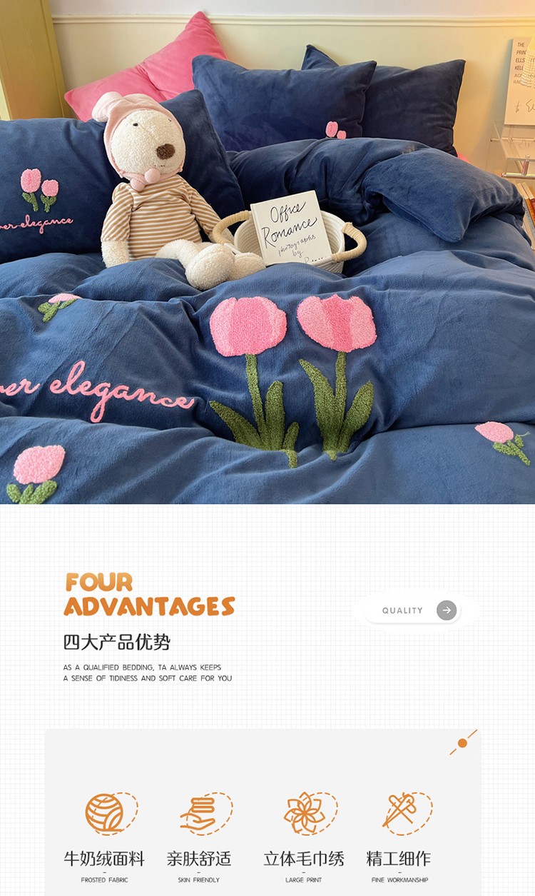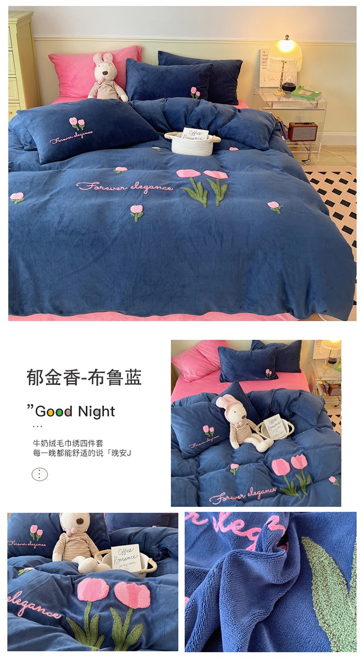 三朵2022新款牛奶绒绣花四件套 郁金香布鲁蓝