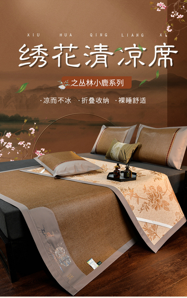 小牛席业 2023新款丛林小鹿绣花清凉席 浅咖