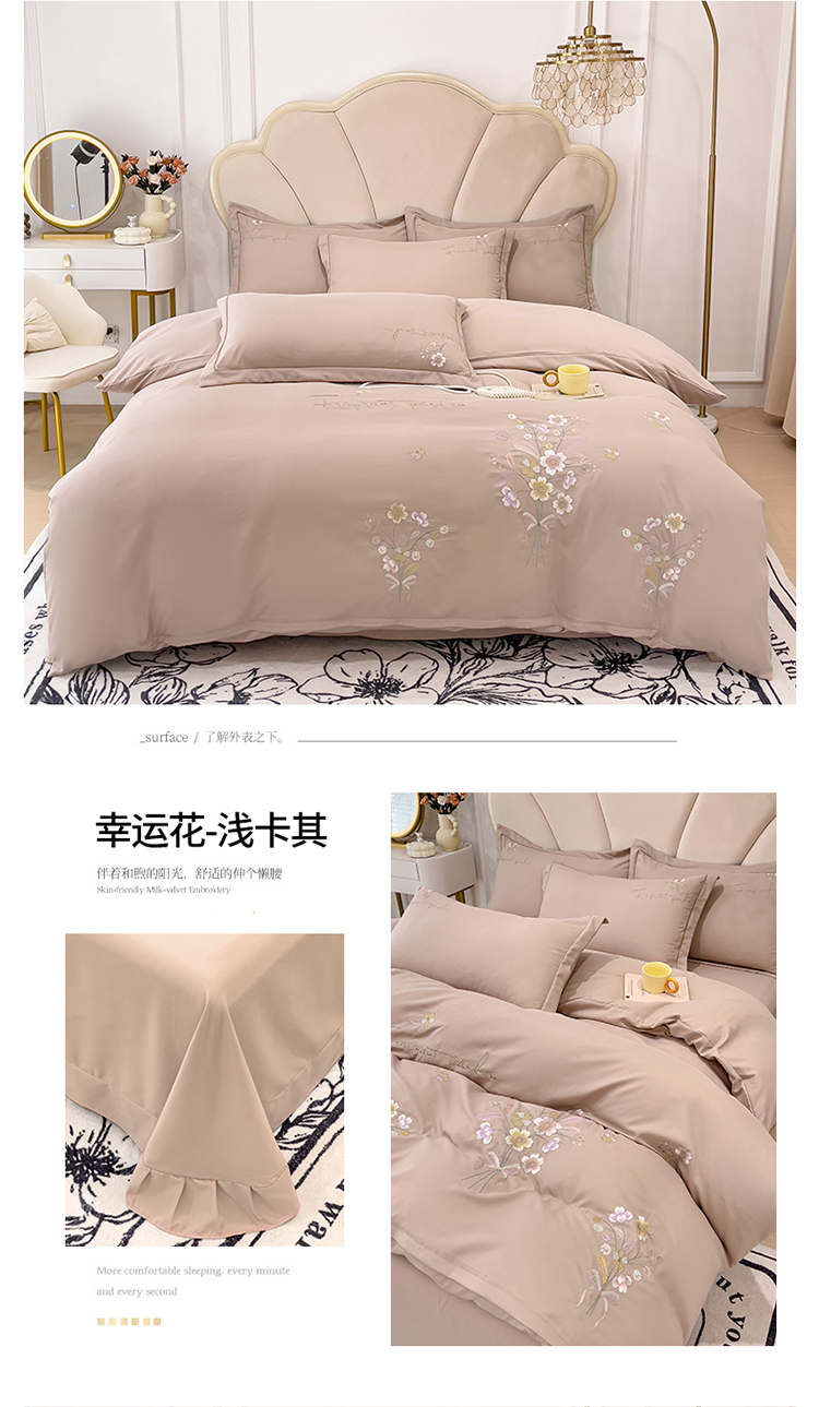 商品名称:金米诺 2024新款水洗磨毛刺绣四件套 幸运花-浅卡其