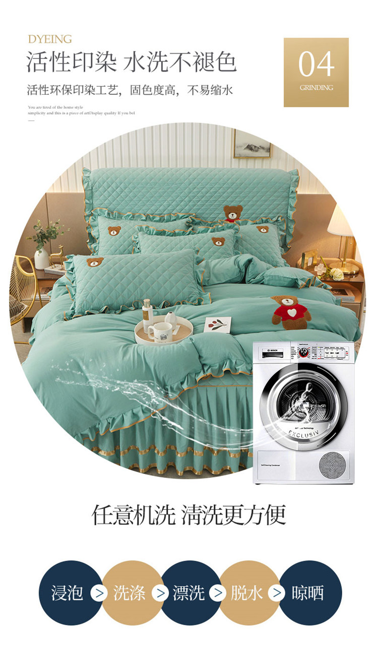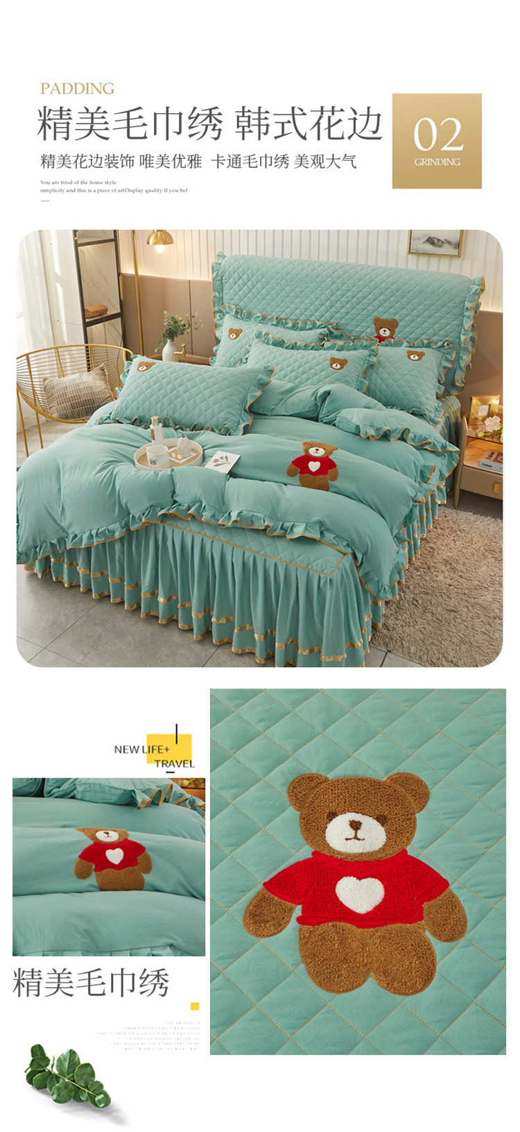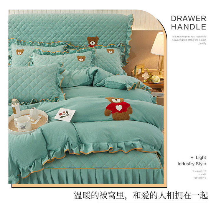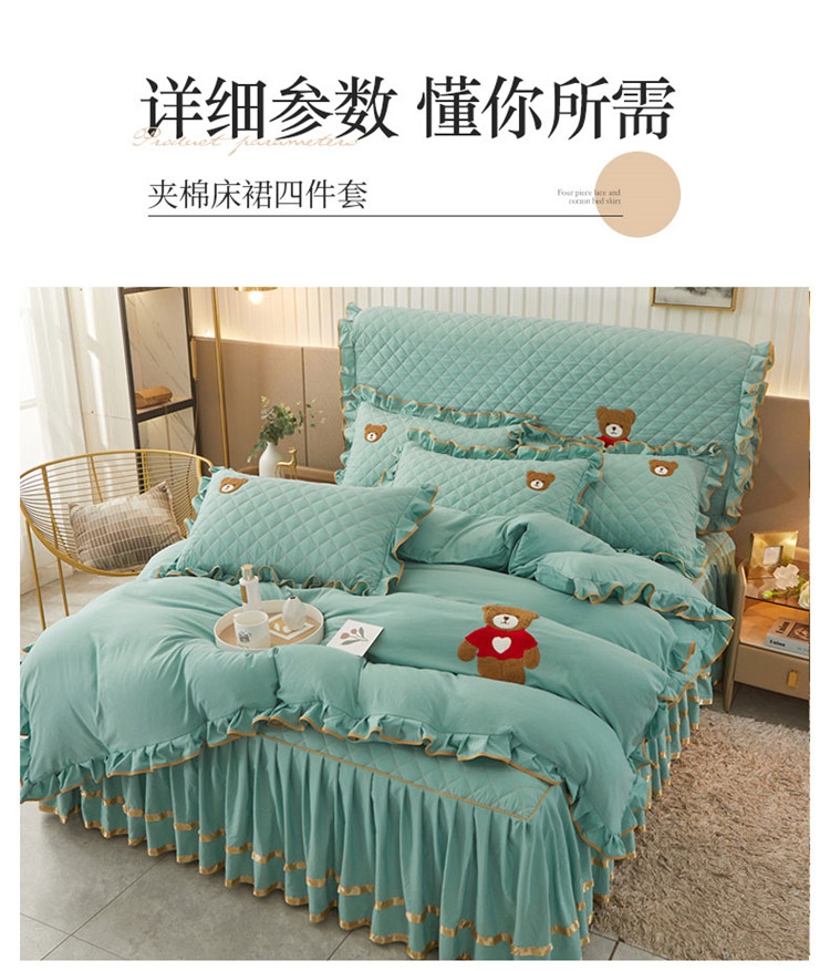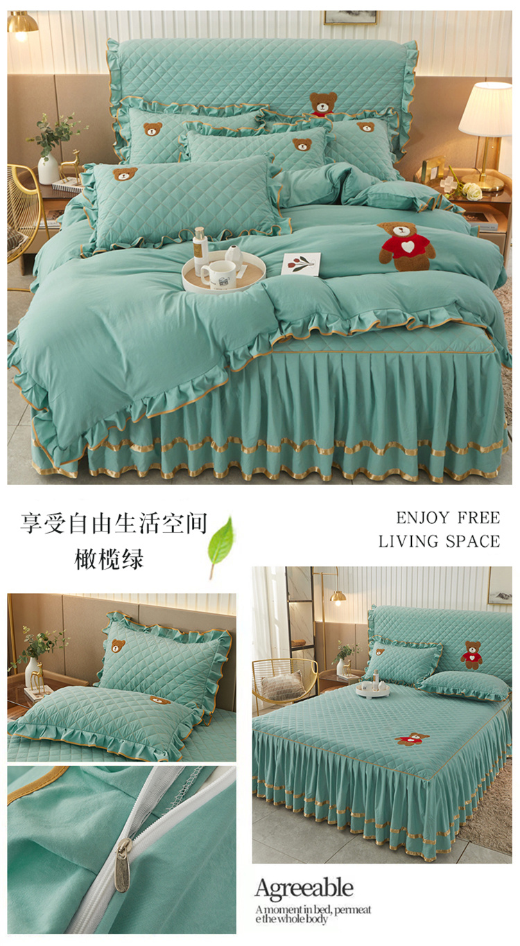 当前位置: 91家纺网 > 商品网购 > 床品套件 > 四件套 > 水洗棉四件套 > 屹成家纺 2024年水洗棉毛巾绣款床裙四件套 橄榄绿