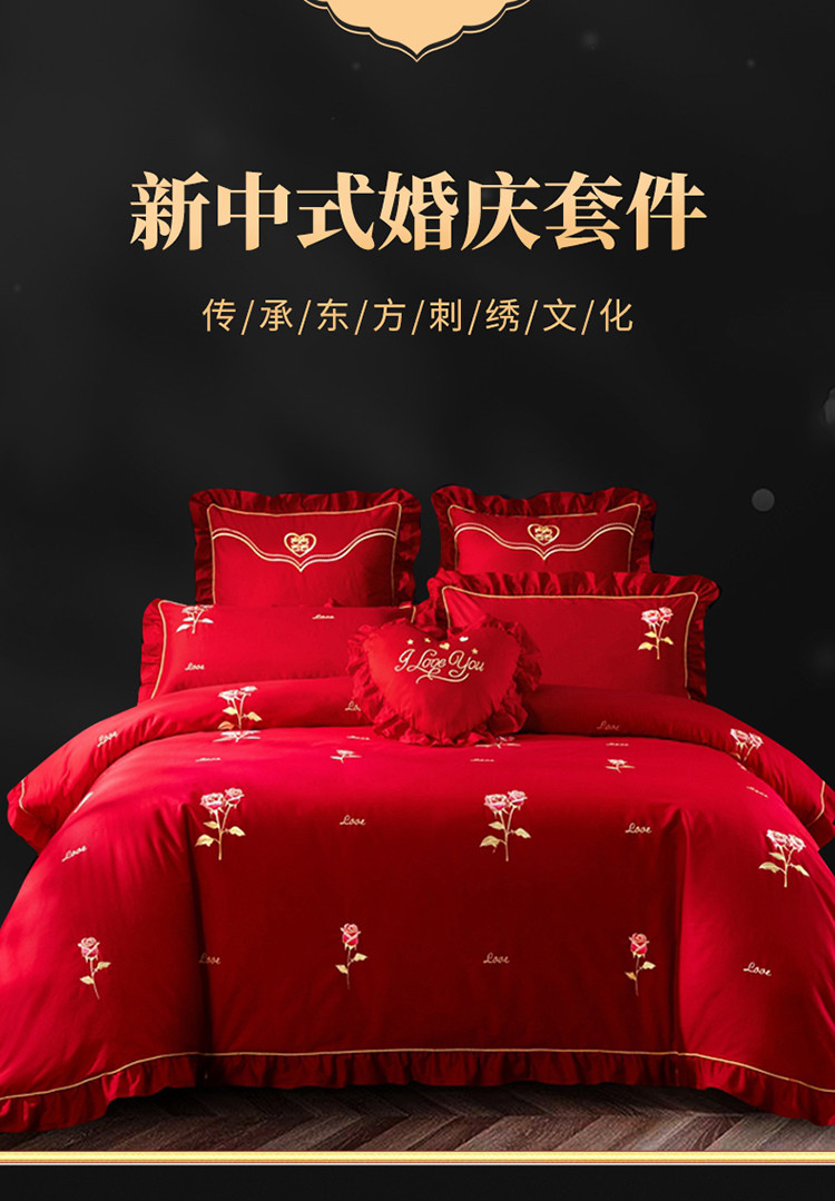 慕她婚庆四件套大红色大花结婚全棉纯棉刺绣花多件套直播 玫瑰蜜语