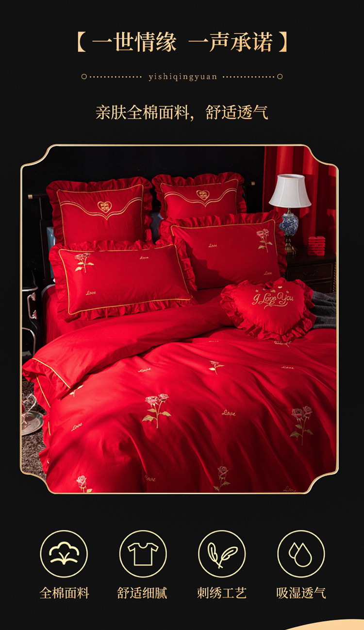 商品名称:慕她婚庆四件套大红色大花结婚全棉纯棉刺绣花多件套直播 玫瑰蜜语