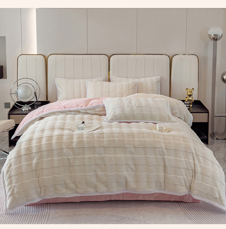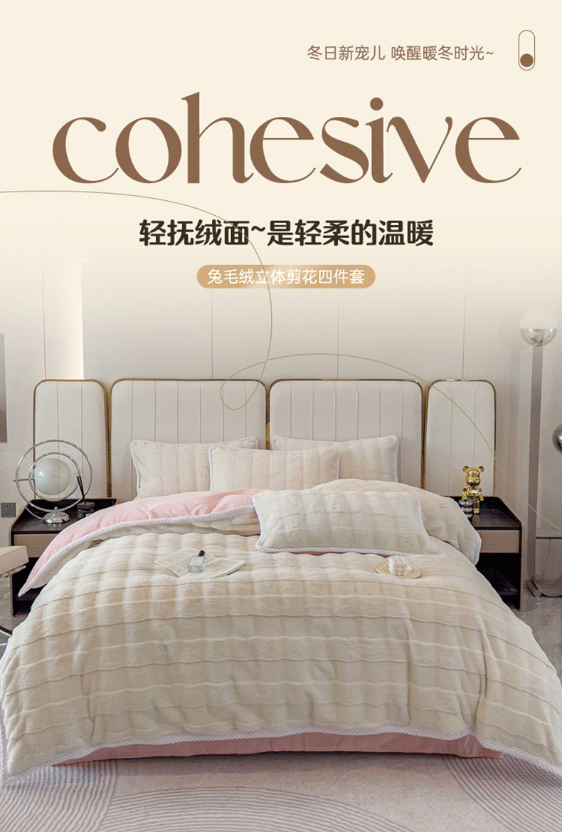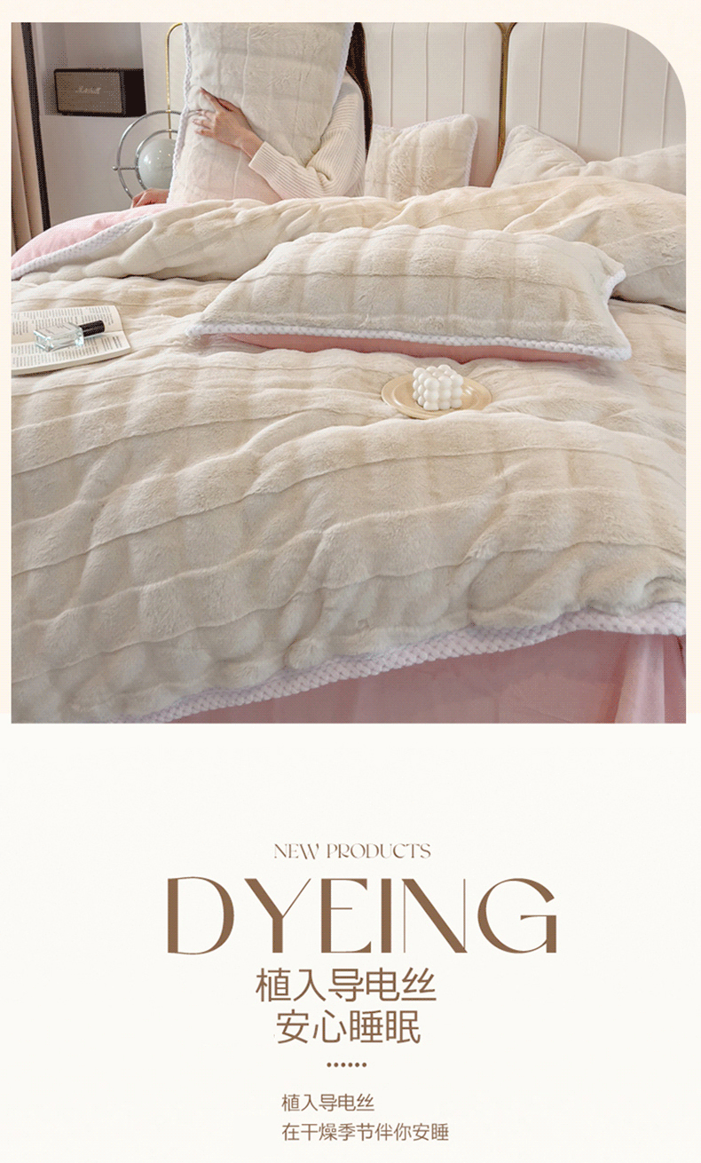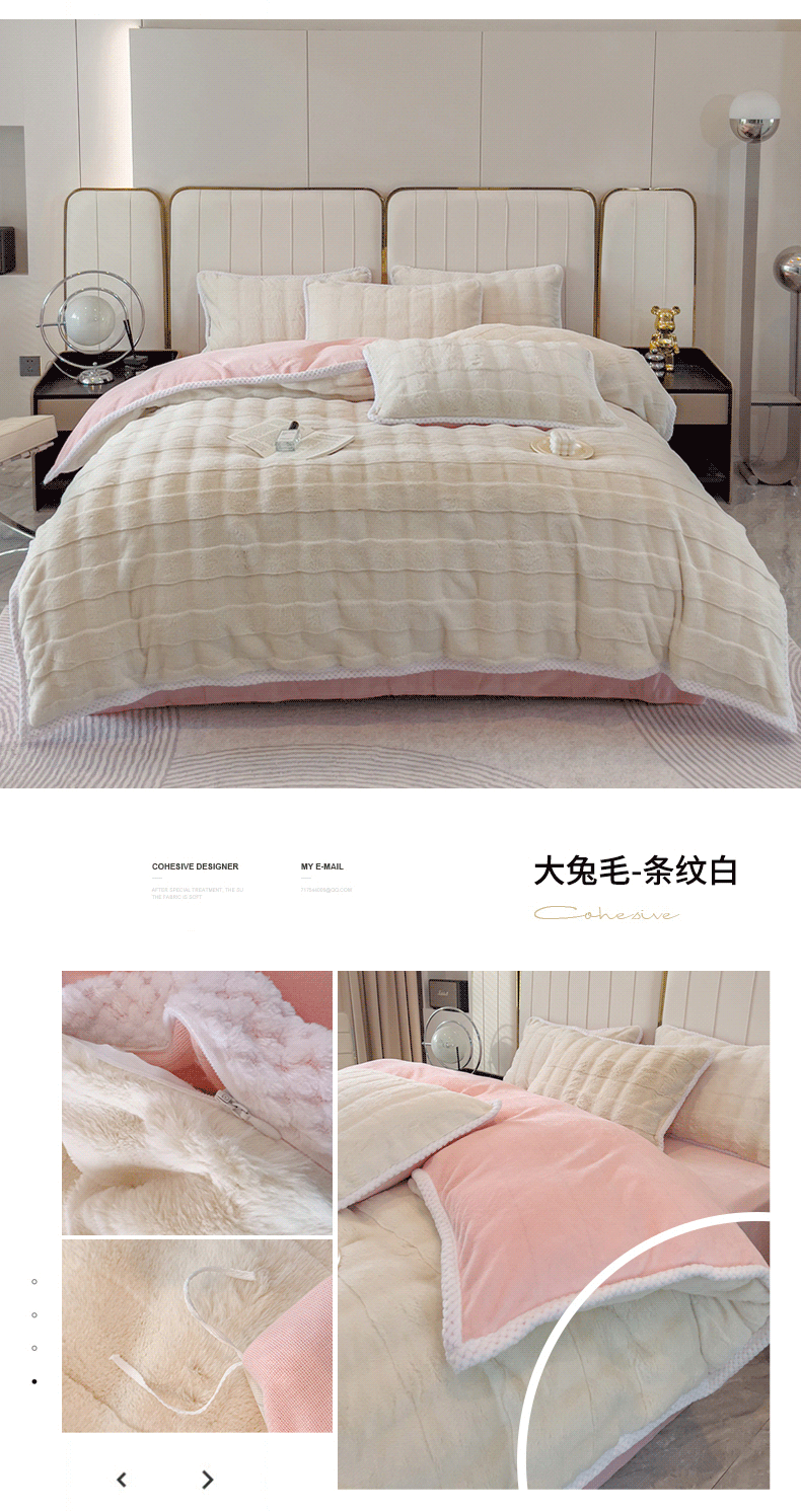 菲儿家纺 2023新款大兔毛绒立体剪花四件套 大兔毛-条纹白