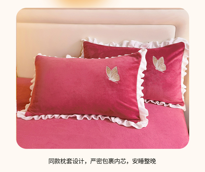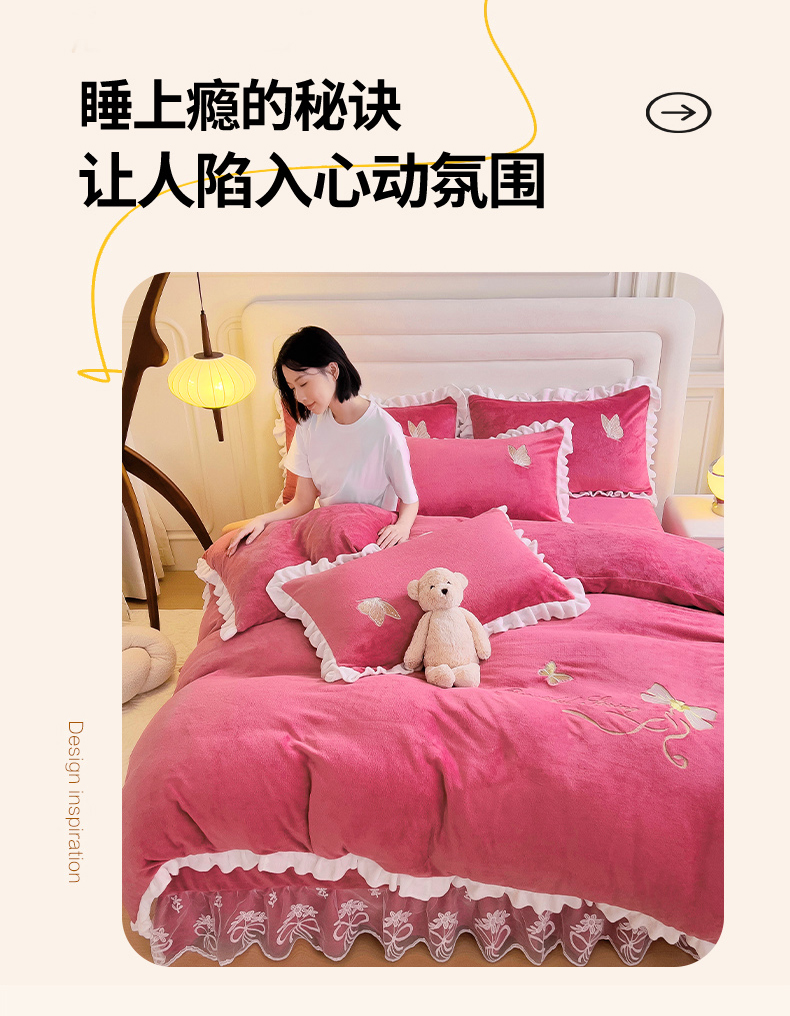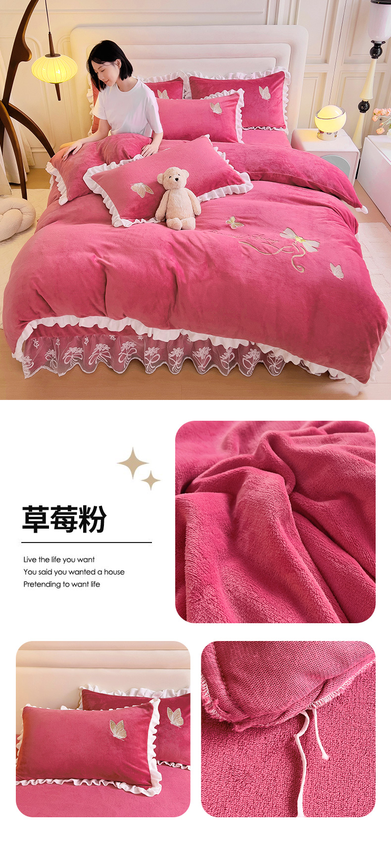 商品名称:找底底 2023新款牛奶绒花边床裙刺绣四件套 草莓粉