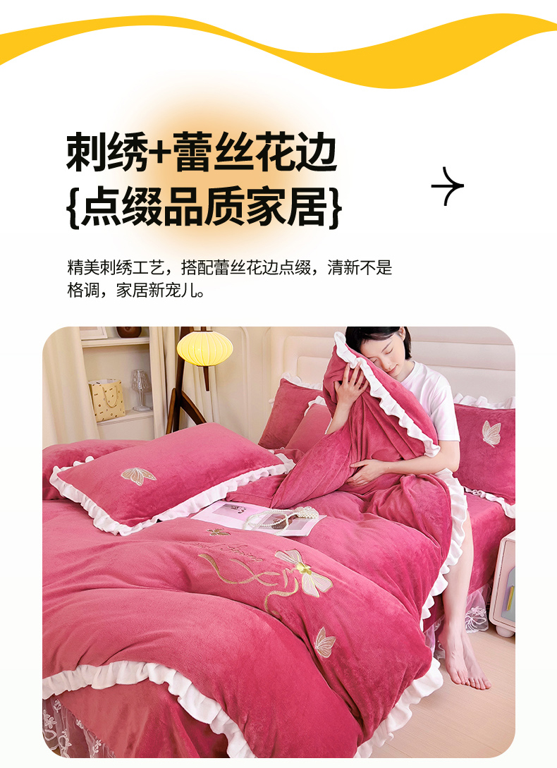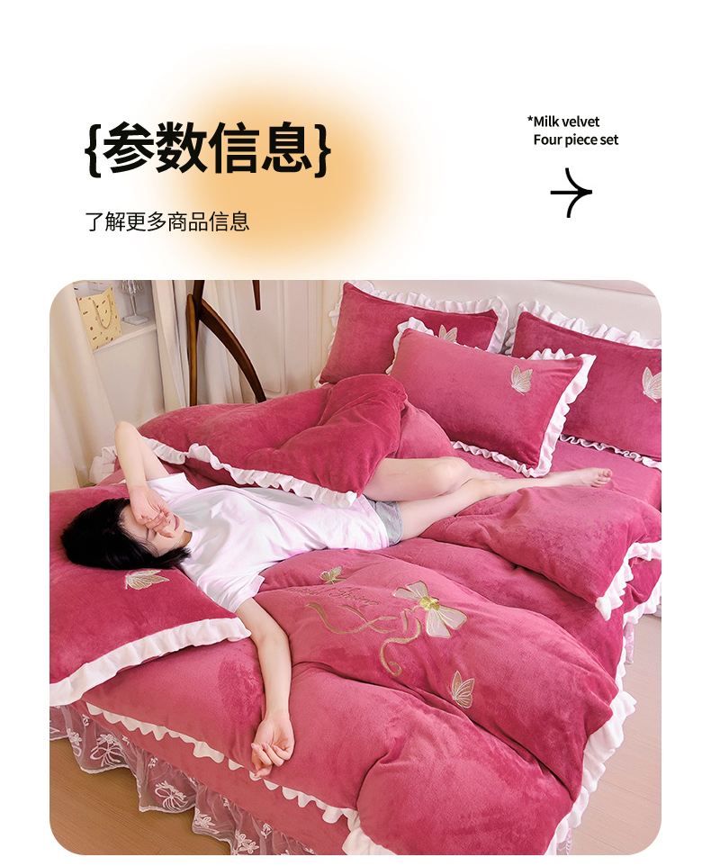 (总)找底底家纺 2025新款花边9-10斤牛奶绒床盖款四件套,花妖,梨花落,小樱桃,紫蔻