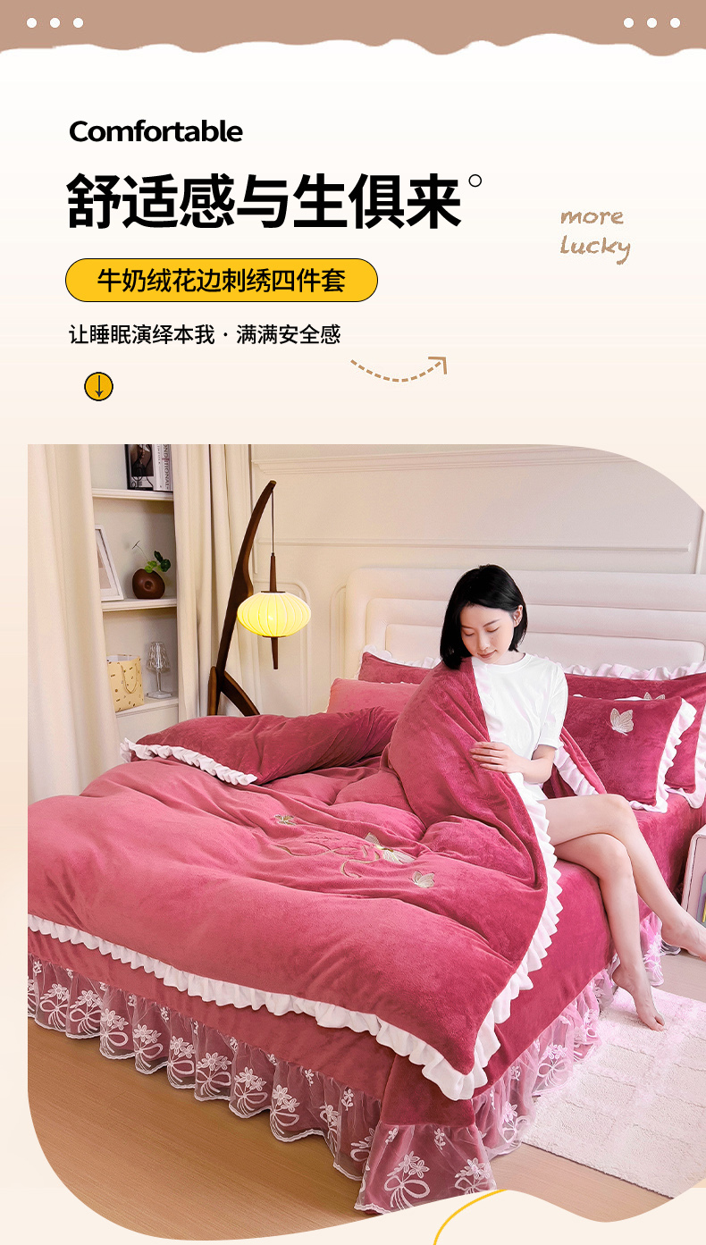 找底底2023新款230g牛奶绒法莱绒刺绣蕾丝边床裙款四件套,豆沙色,橘橙色,玛卡蓝,嫩黄,浅粉色,雾紫,质感灰