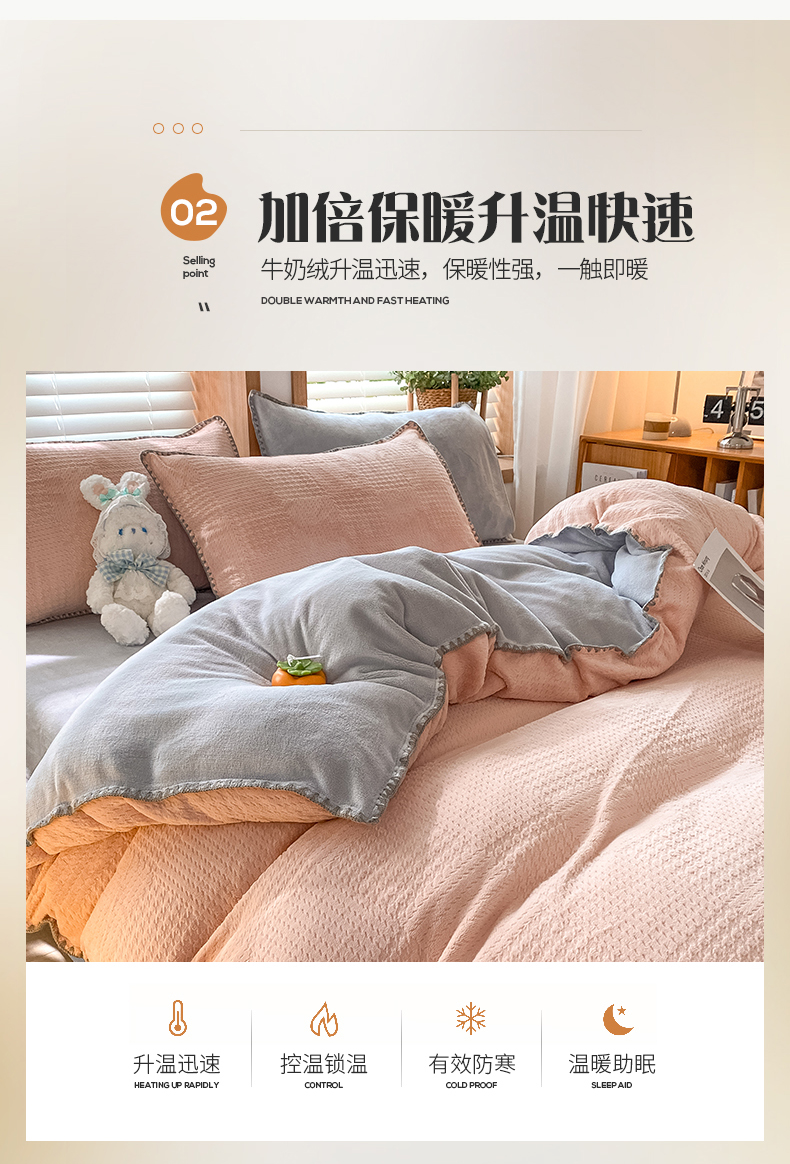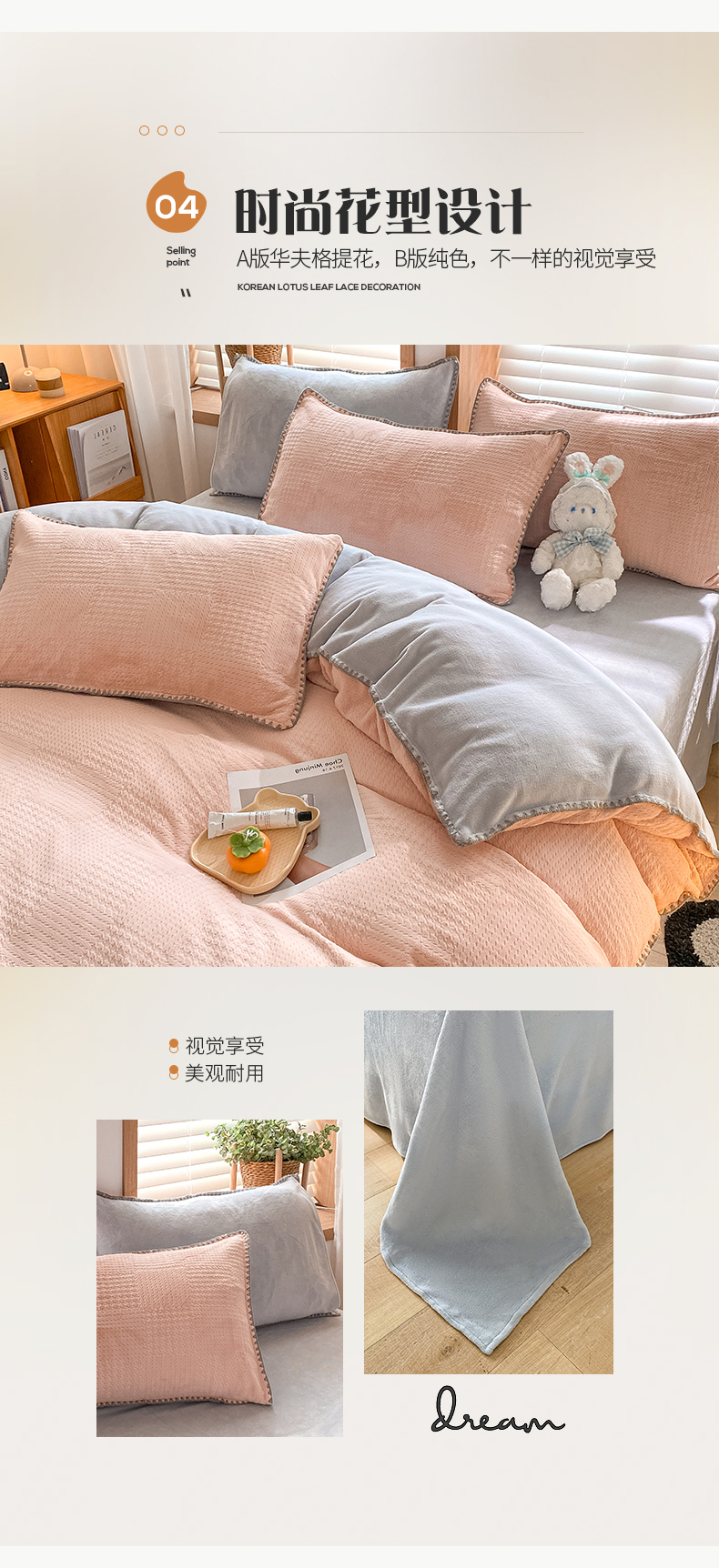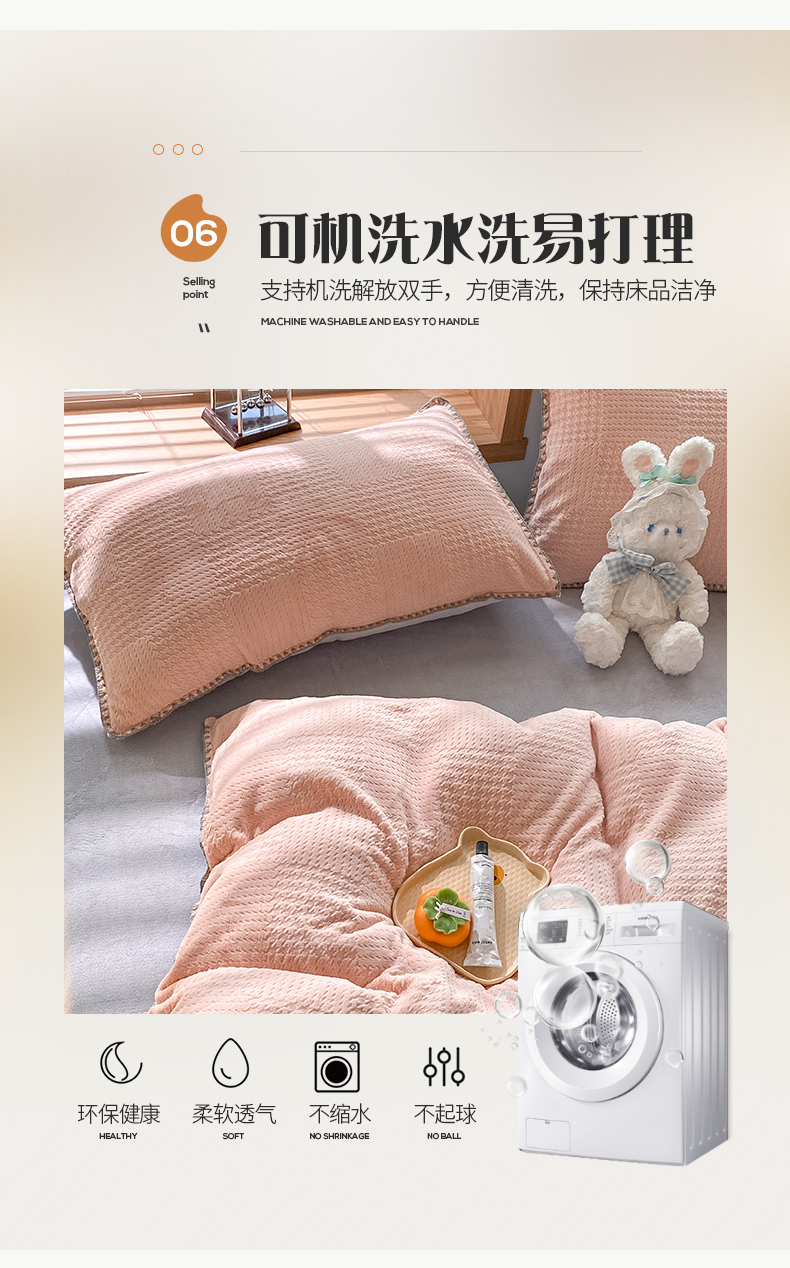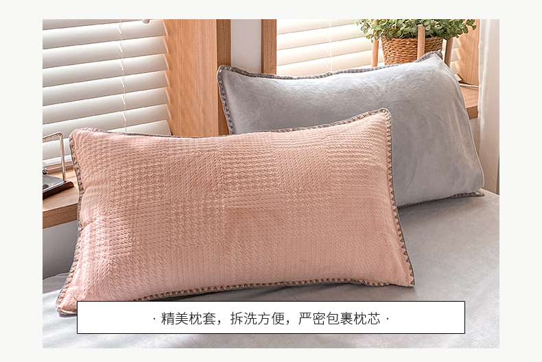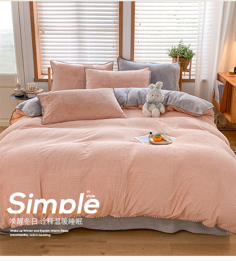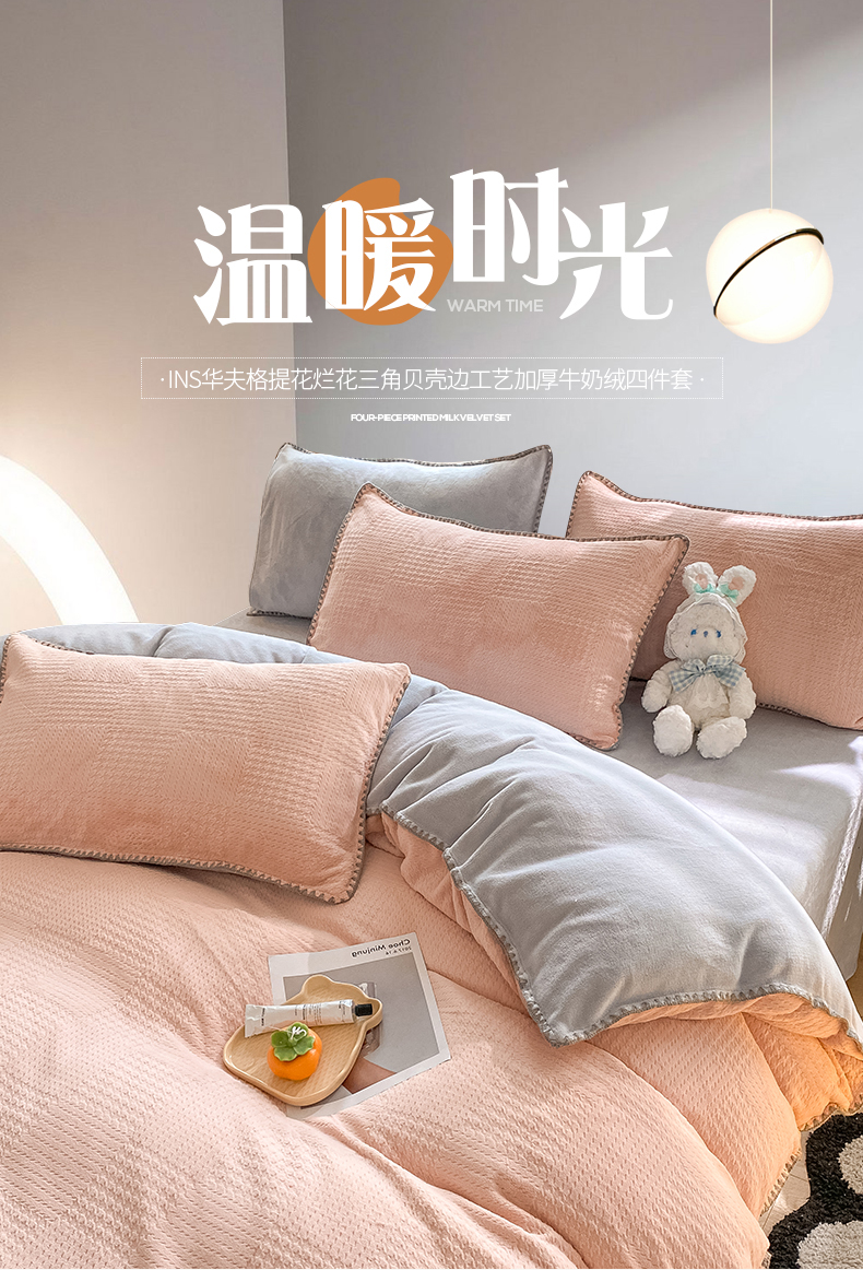商品名称:桃子家居 2023新款A类无印ins华夫格提花烂花雕花剪花三角贝壳边工艺加厚牛奶绒四件套 绒华夫格-豆粉