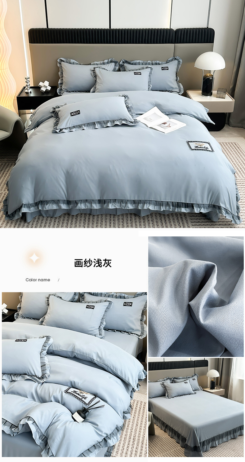 商品名称:小主驾到 2023新款韩版公主风荷叶边少女心四件套黑色蕾丝纱-画纱 画纱浅灰