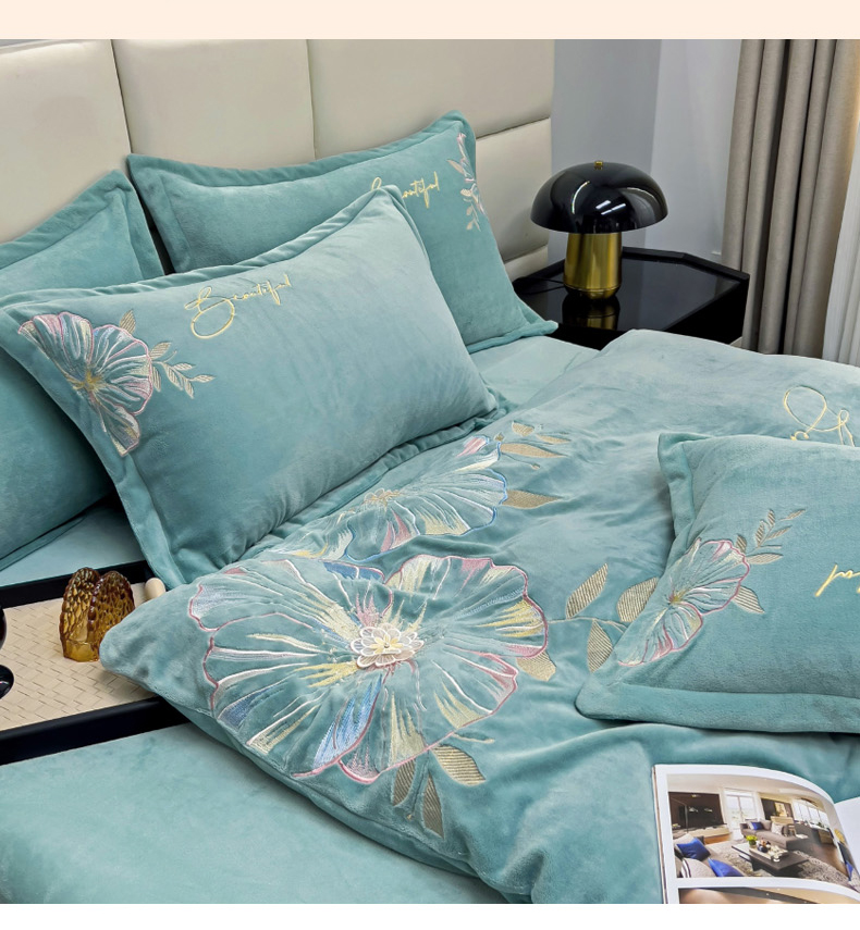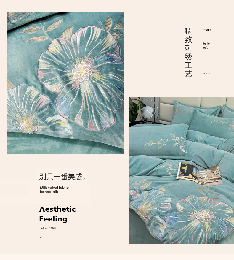 (总)星尚家纺 2024新款保暖全消光A类230g牛奶绒绣花绒四件套-曼妙花园,豆沙粉,孔雀蓝,清新绿,绅士灰,香芋紫,樱花粉