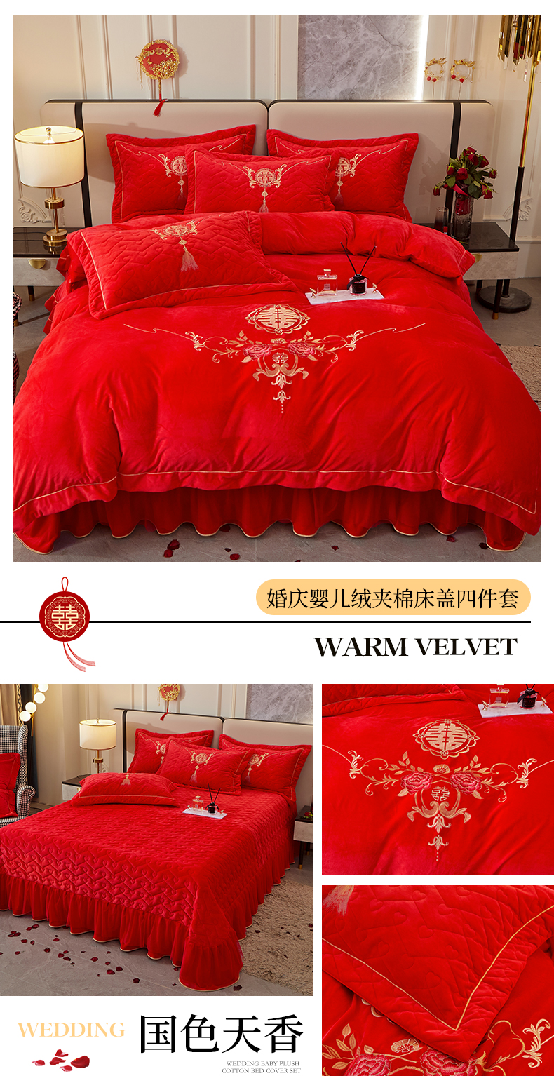 当前位置: 91家纺网 > 商品网购 > 床品套件 > 四件套 > 婚庆四件套 > 宜凡家纺 2023秋冬新品婴儿绒婚庆床盖四件套 国色天香