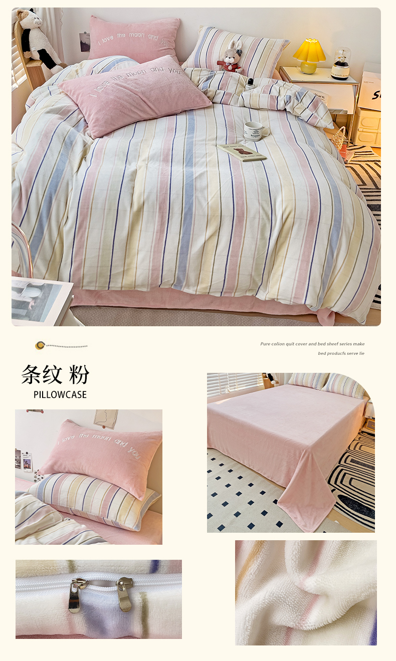 商品名称:山茶家纺 2023新款高克重牛奶绒印花四件套 条纹 粉