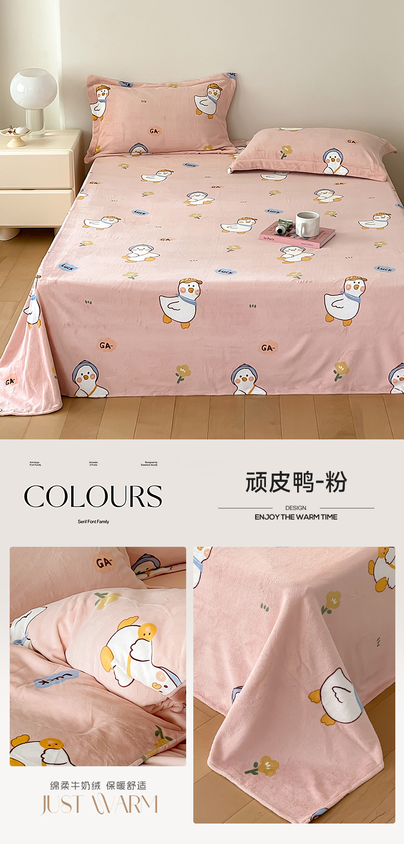 商品名称:时光里 2023新款全消光加厚牛奶绒印花单品单床单 顽皮鸭-粉