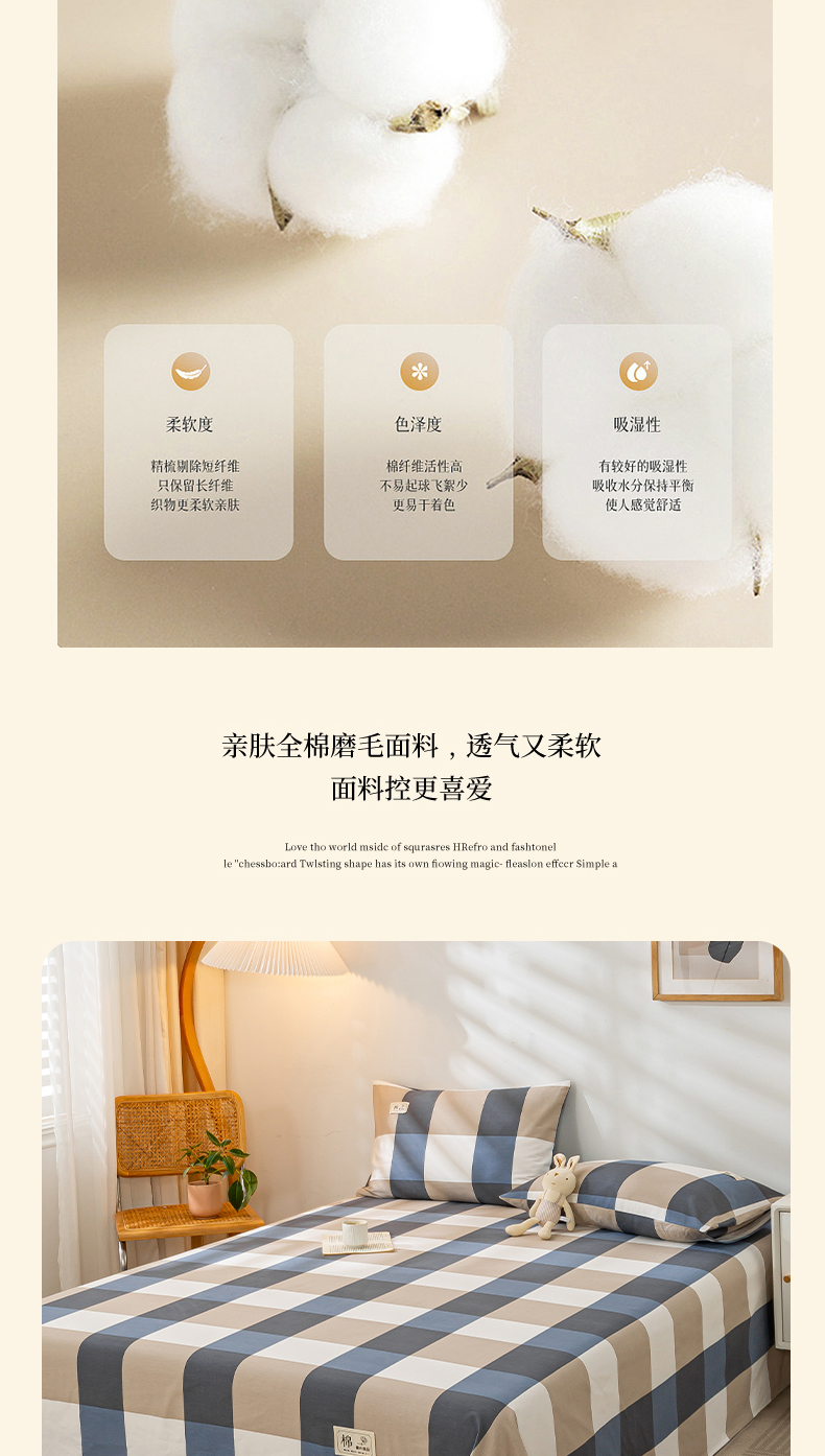 恋人优选 2023新款纯棉磨毛单品床单 蓝大格