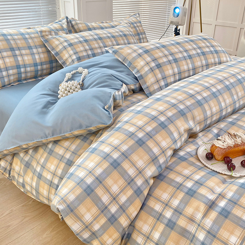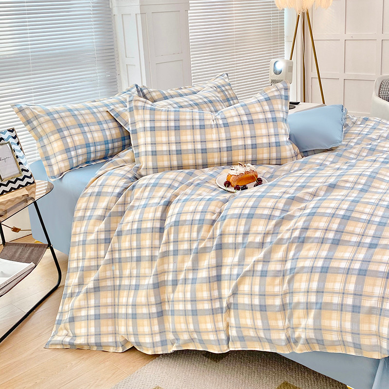 (总)楠沐家纺 2025年新款无印风学生印花四件套芦荟棉水洗棉,彩色波点,觅遇,晴空蓝格,亚麻灰格,烟雾灰格,英伦蓝格