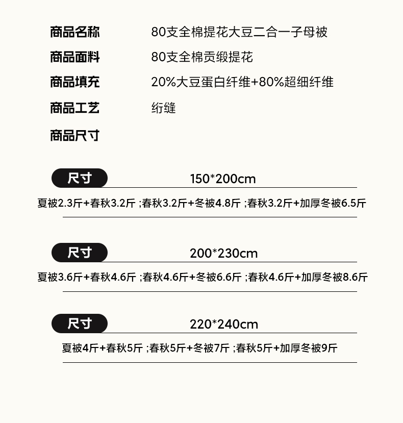 150x200cm夏被2.3斤+春秋被3.2斤 | ¥260.00 |