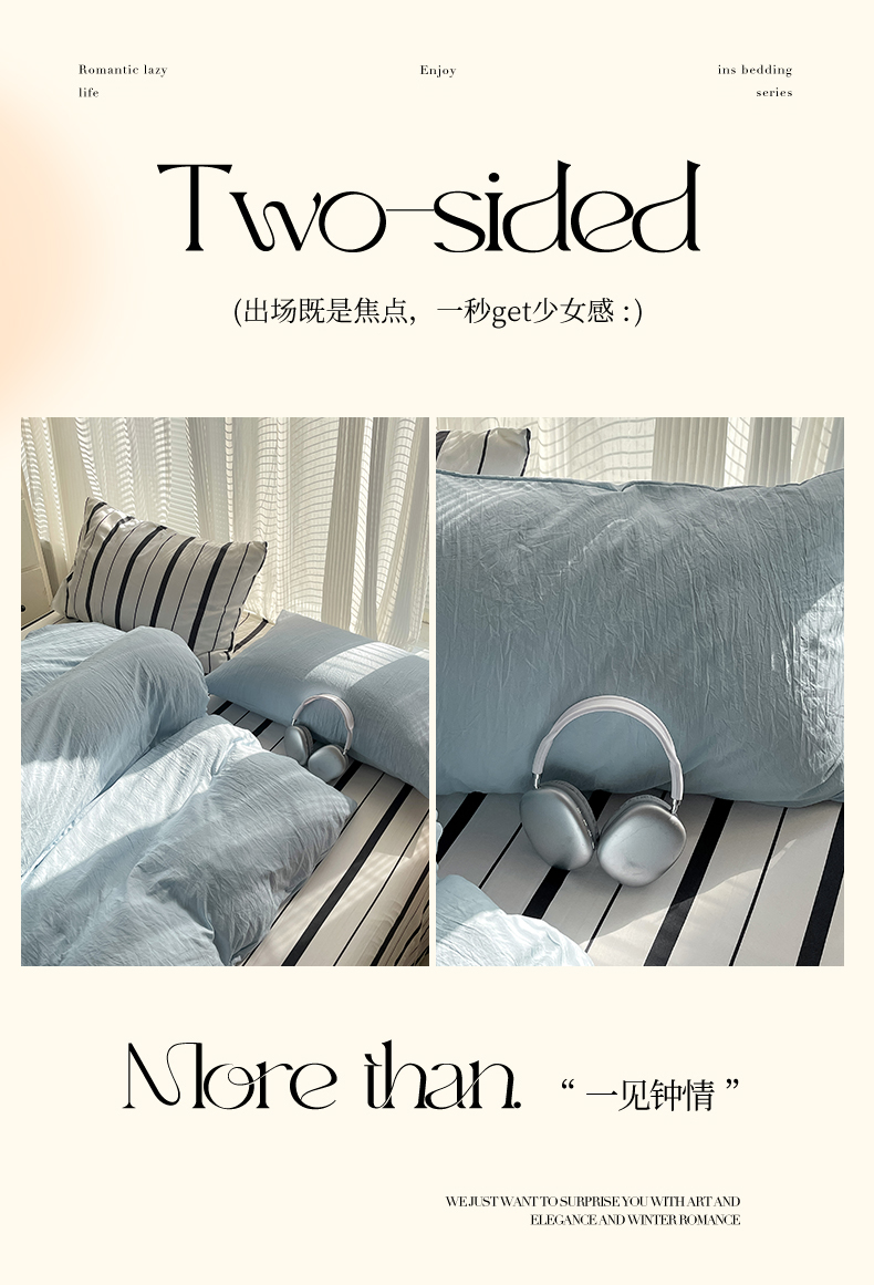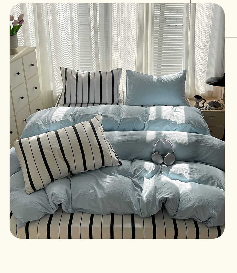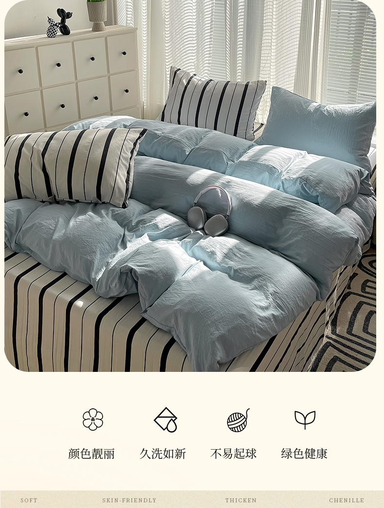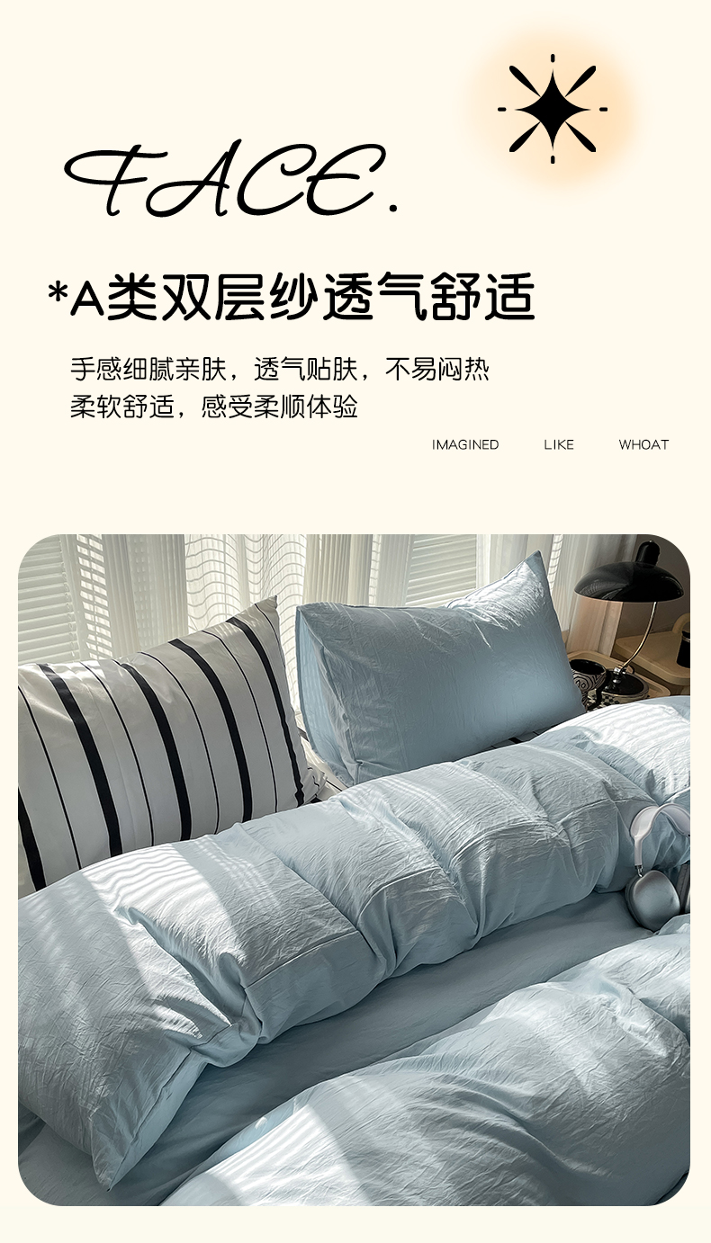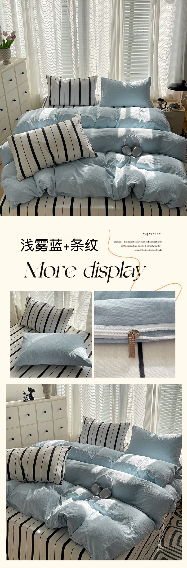 当前位置: 91家纺网 > 商品网购 > 床品套件 > 四件套 > 水洗棉四件套 > 奈颜 2024新款水洗双层纱爆款双拼条纹四件套 浅雾蓝+条纹