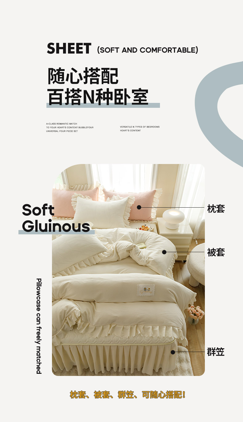 • 91家纺网 家纺一手货源 找家纺 (总)丝印良品 2025新款四季款夹棉泡泡纱床裙床笠被套四件套系列,浅灰,豆绿,米白,慕蓝,玉色,紫色