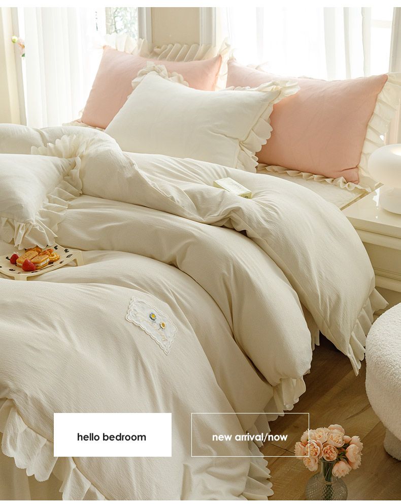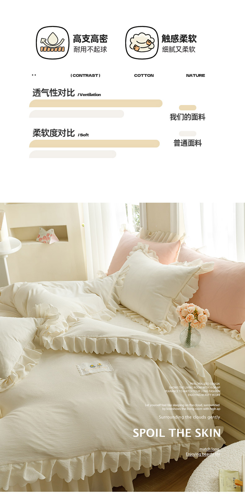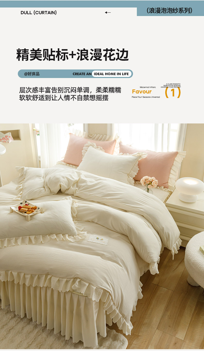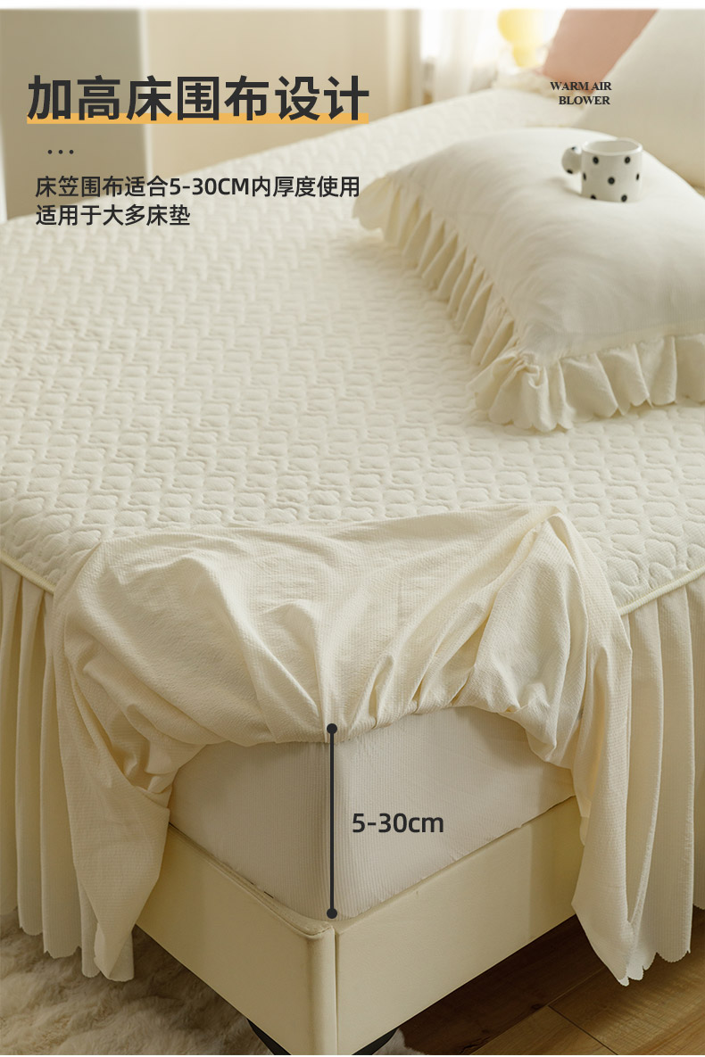 丝印良品 2024新款四季款夹棉泡泡纱床裙床笠被套四件套 米白