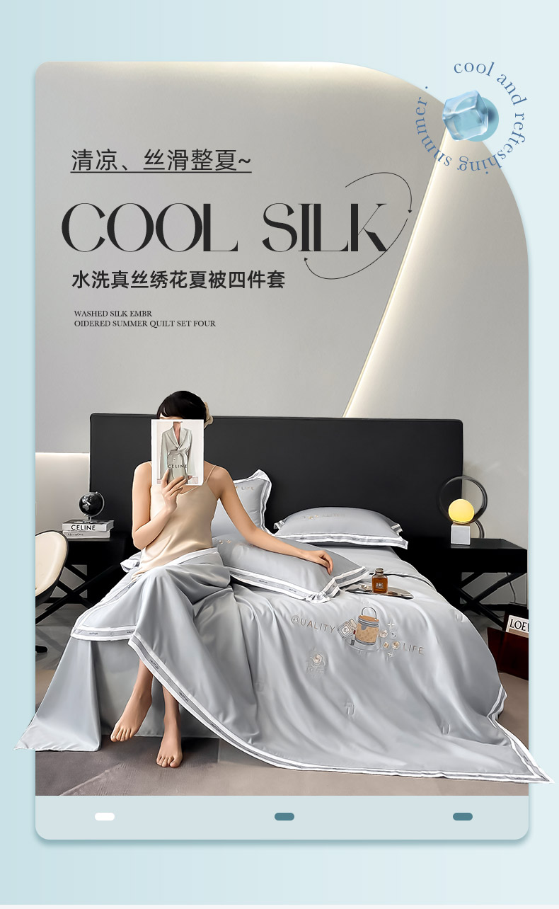 • 91家纺网 家纺一手货源 找家纺 丝印良品 2024新款大牌风水洗真丝绣花床笠被套夏被四件套路易系列 路易-山灰