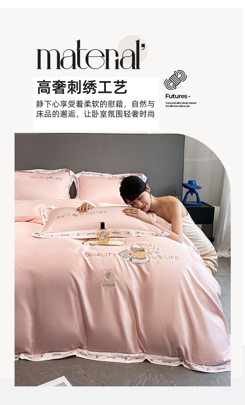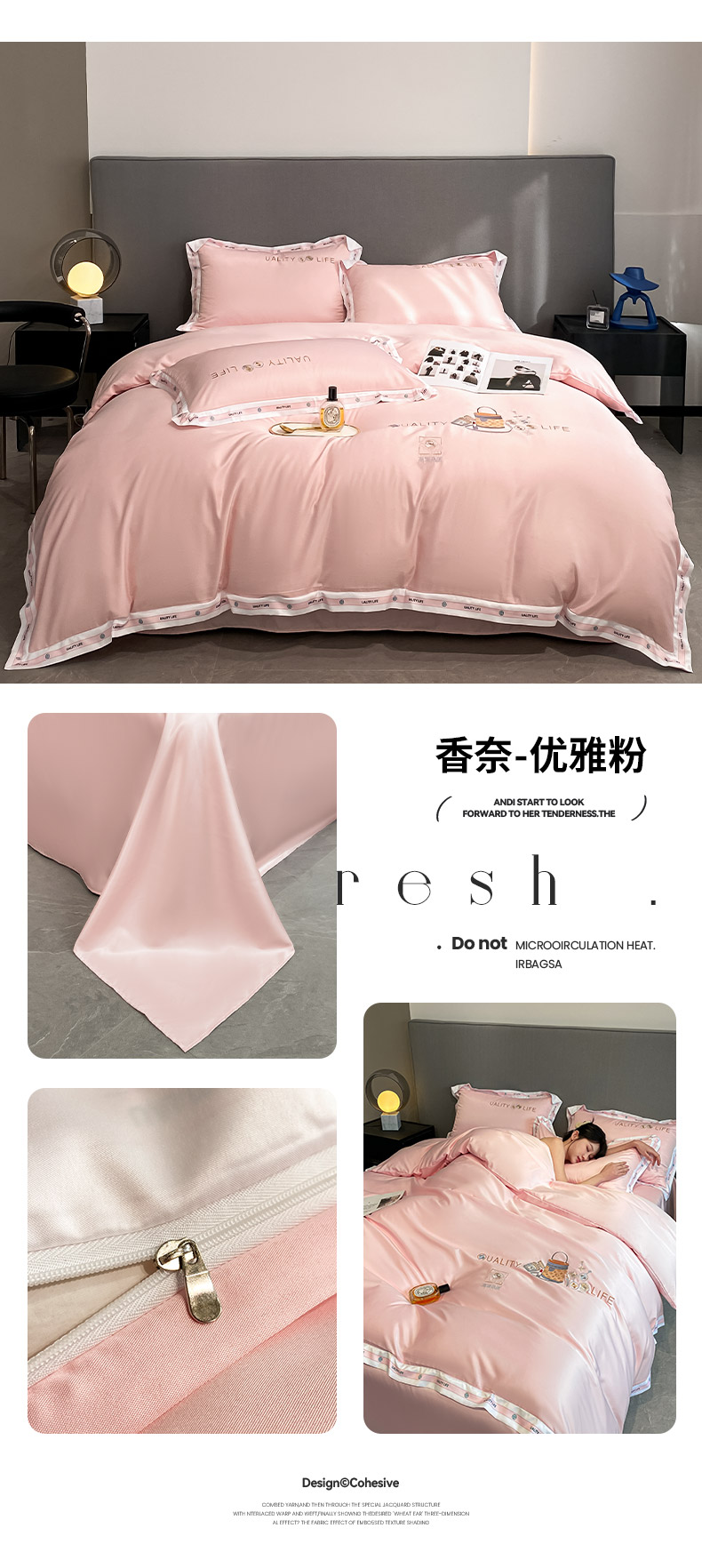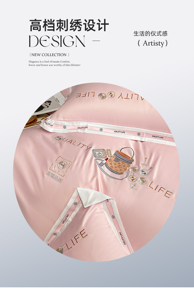 欧冠家纺 2024新款大牌风60S水洗真丝刺绣床笠被套四件套香奈系列 香奈-优雅粉