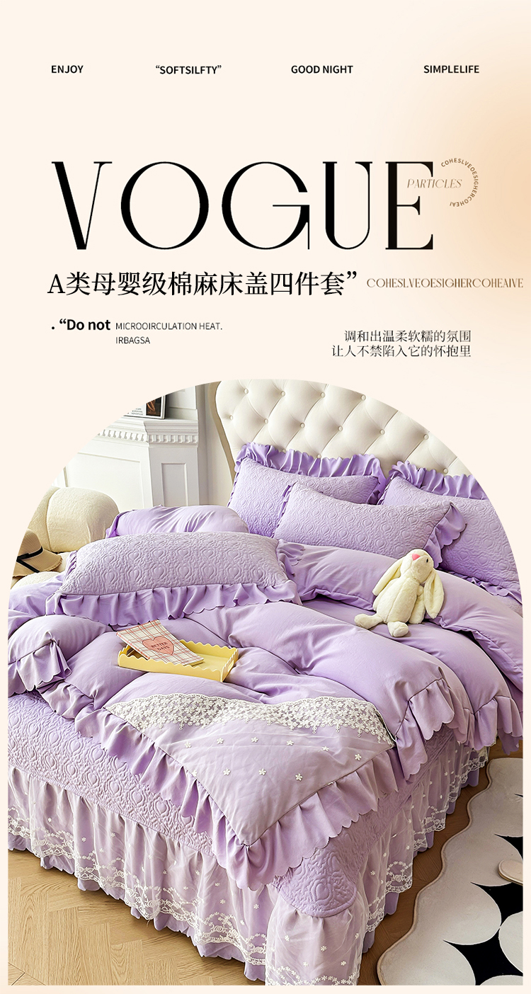 漫布云2025春夏新款A类母婴级双层纱棉麻蕾丝花边床盖四件套—安妮系列