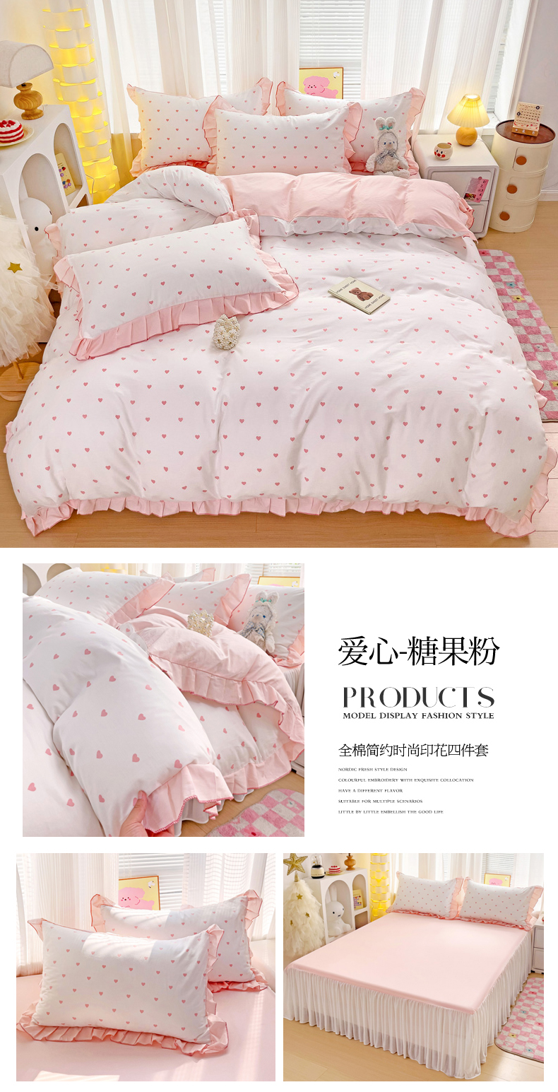 当前位置: 91家纺网 > 商品网购 > 床品套件 > 四件套 > 全棉普通四件套 > 麦朵家居 2024新款床裙款爱心全棉花边四件套 爱心-糖果粉