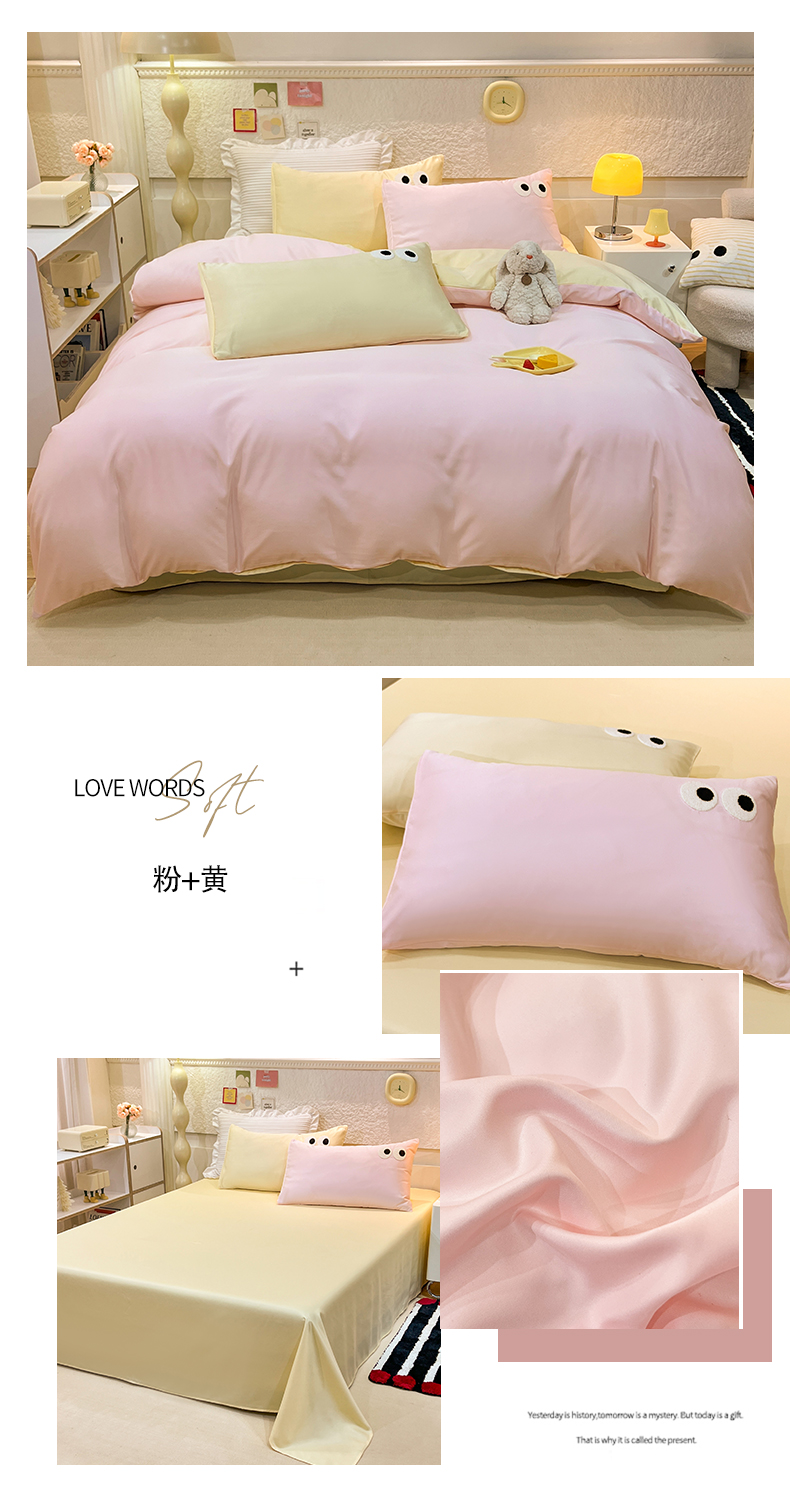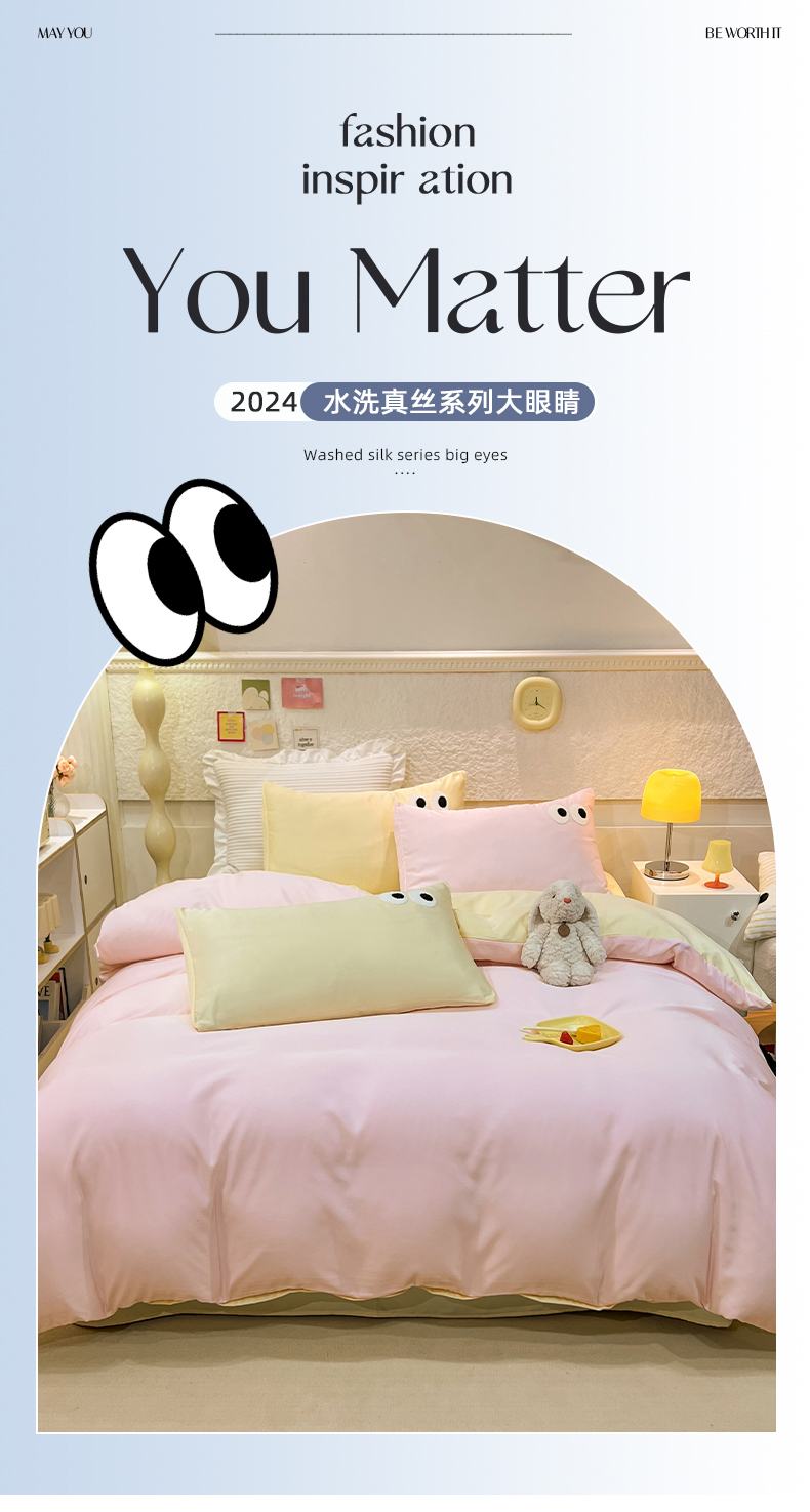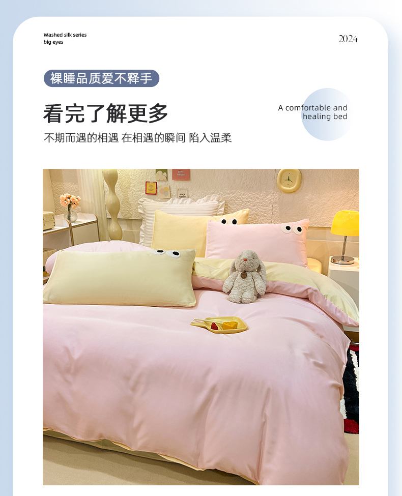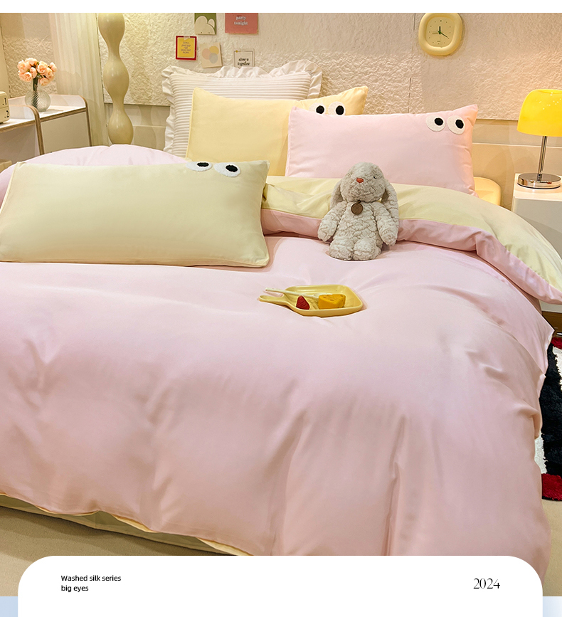 商品名称:艾米家居 2025新款水洗真丝大眼睛系列四件套 粉+黄