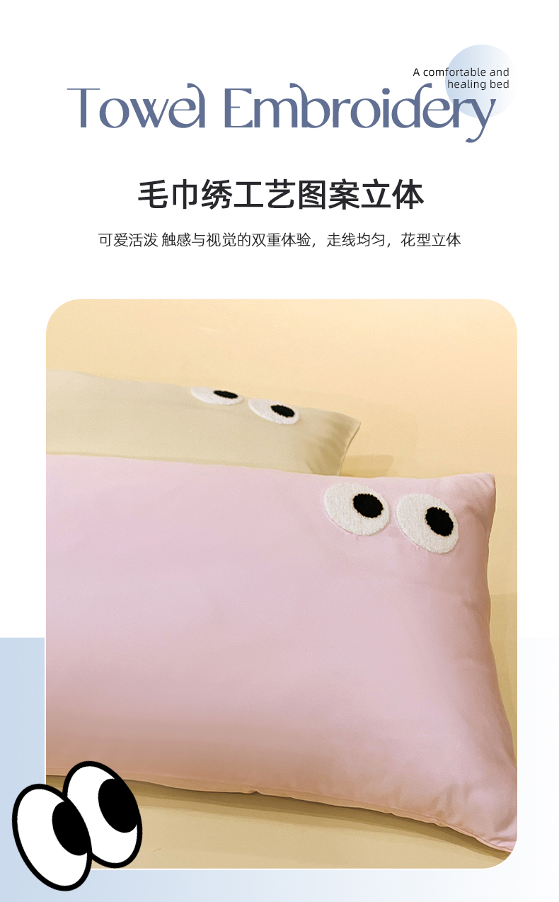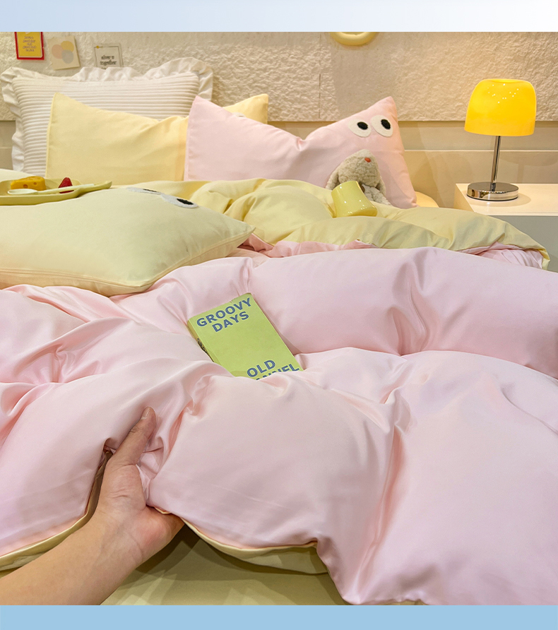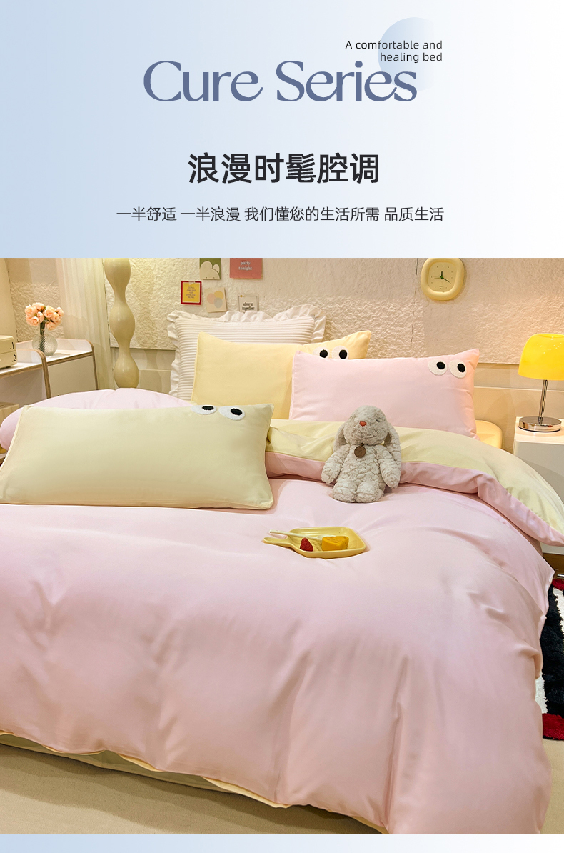 艾米家居 2025新款水洗真丝大眼睛系列四件套 粉+黄