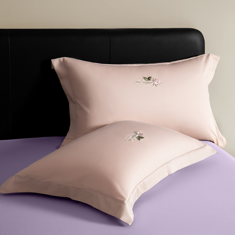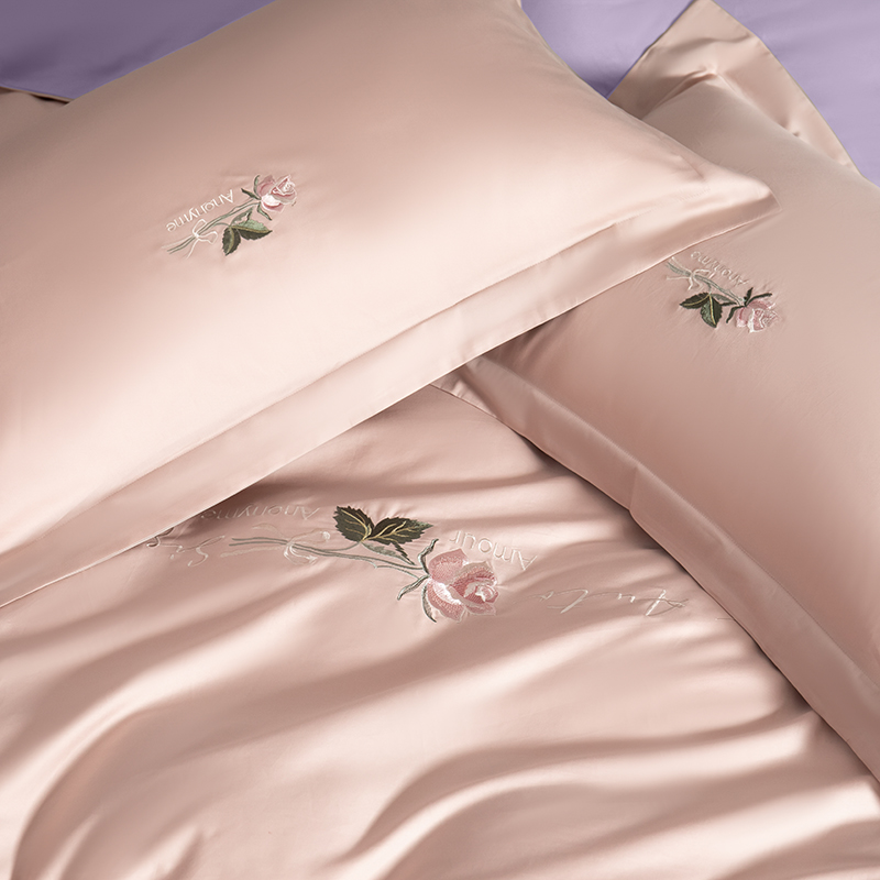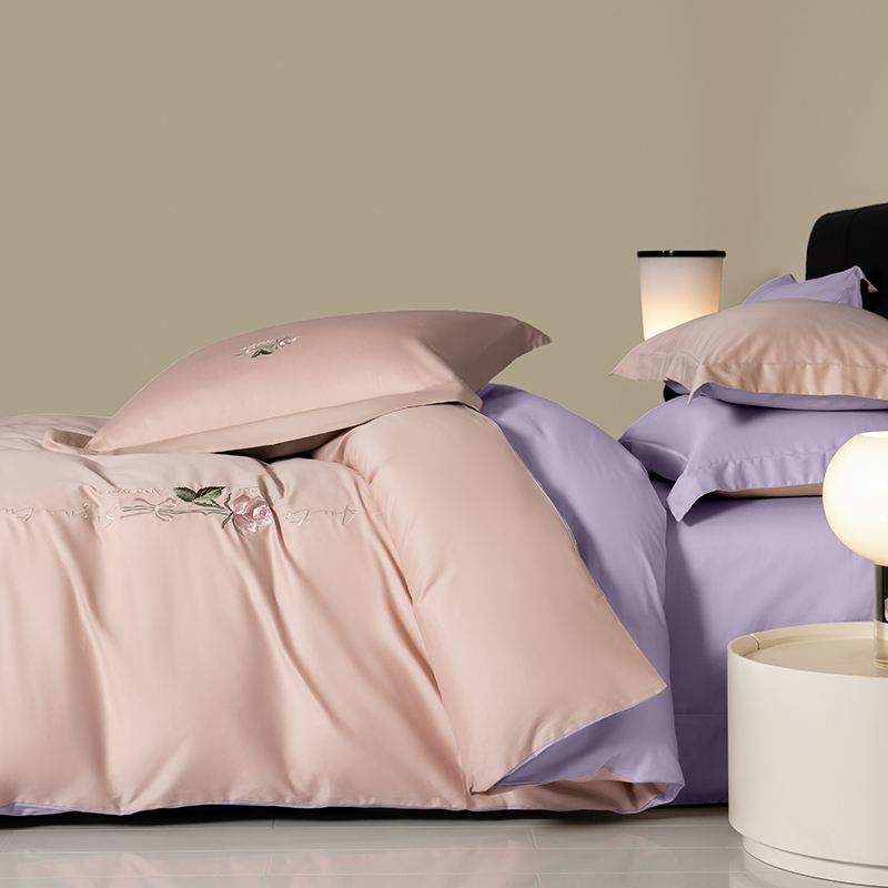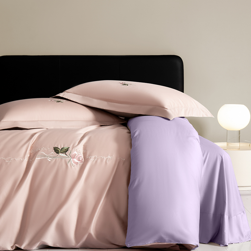 商品名称:秀色家纺 2025新款轻奢60支贡缎长绒纯棉四件套全棉简约清新刺绣花被套床单高级感 茱萸粉+丁香