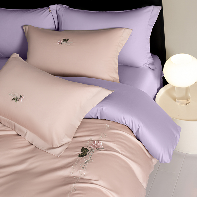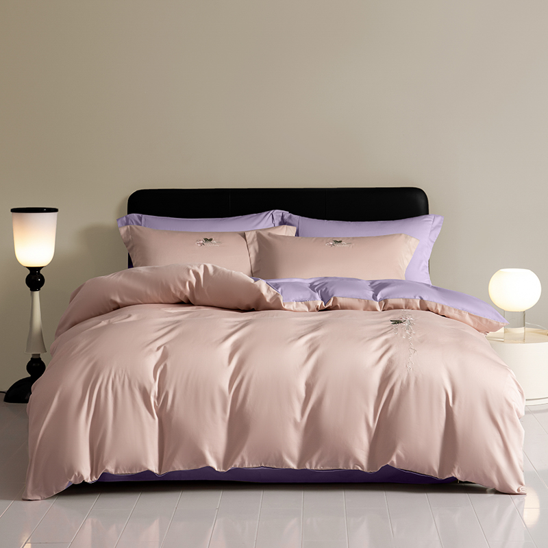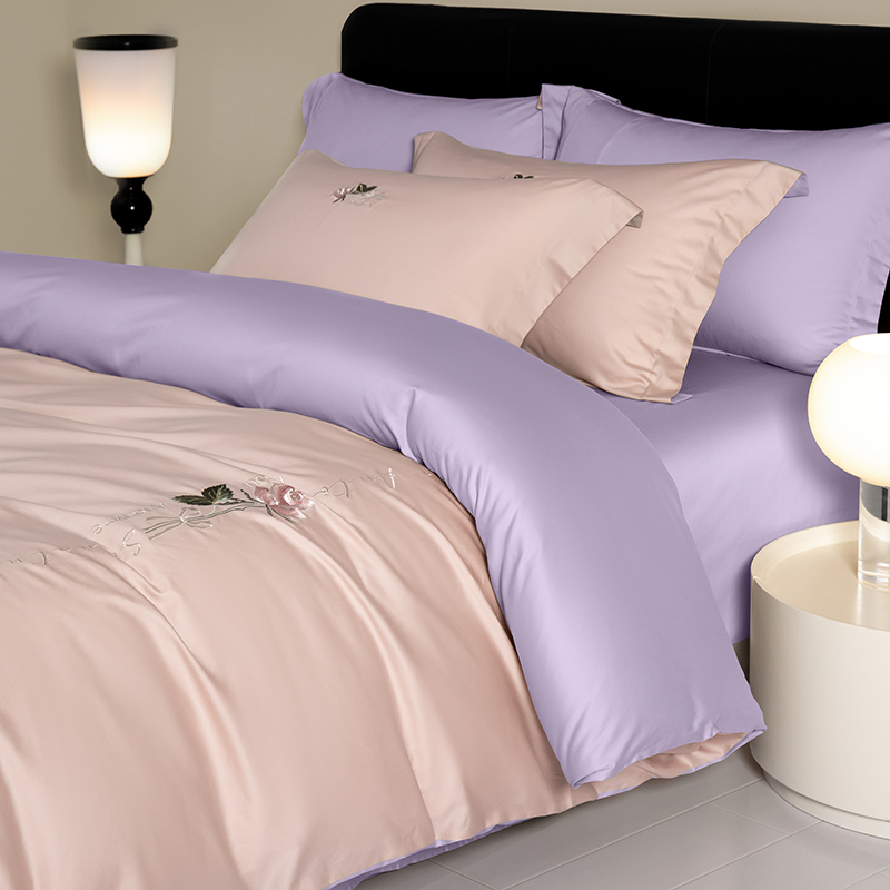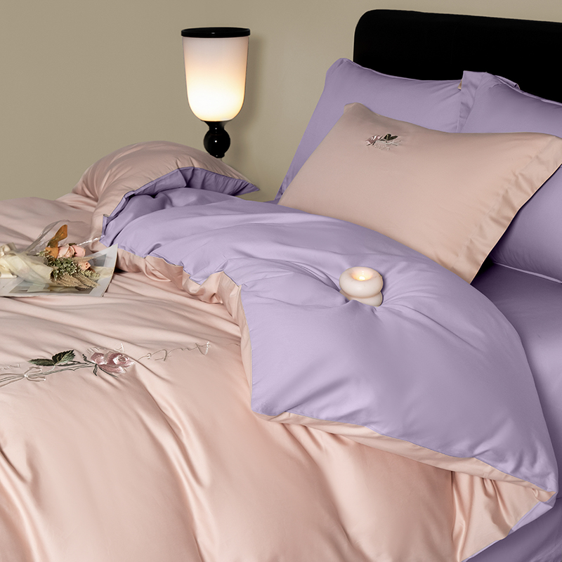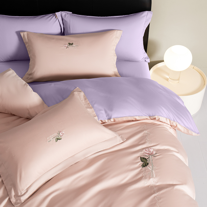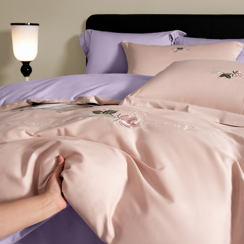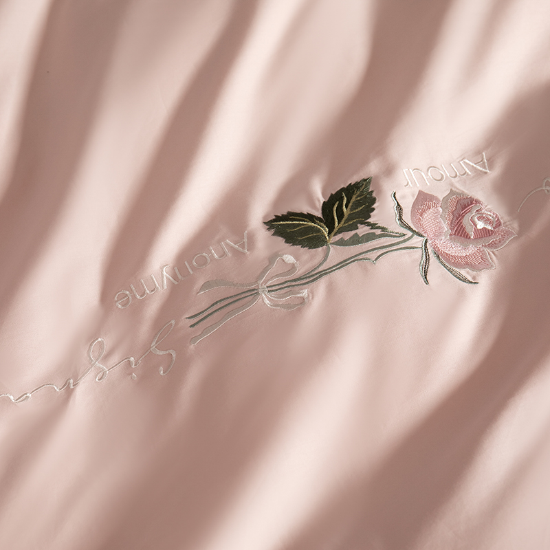 秀色家纺 2025新款轻奢60支贡缎长绒纯棉四件套全棉简约清新刺绣花被套床单高级感 茱萸粉+丁香