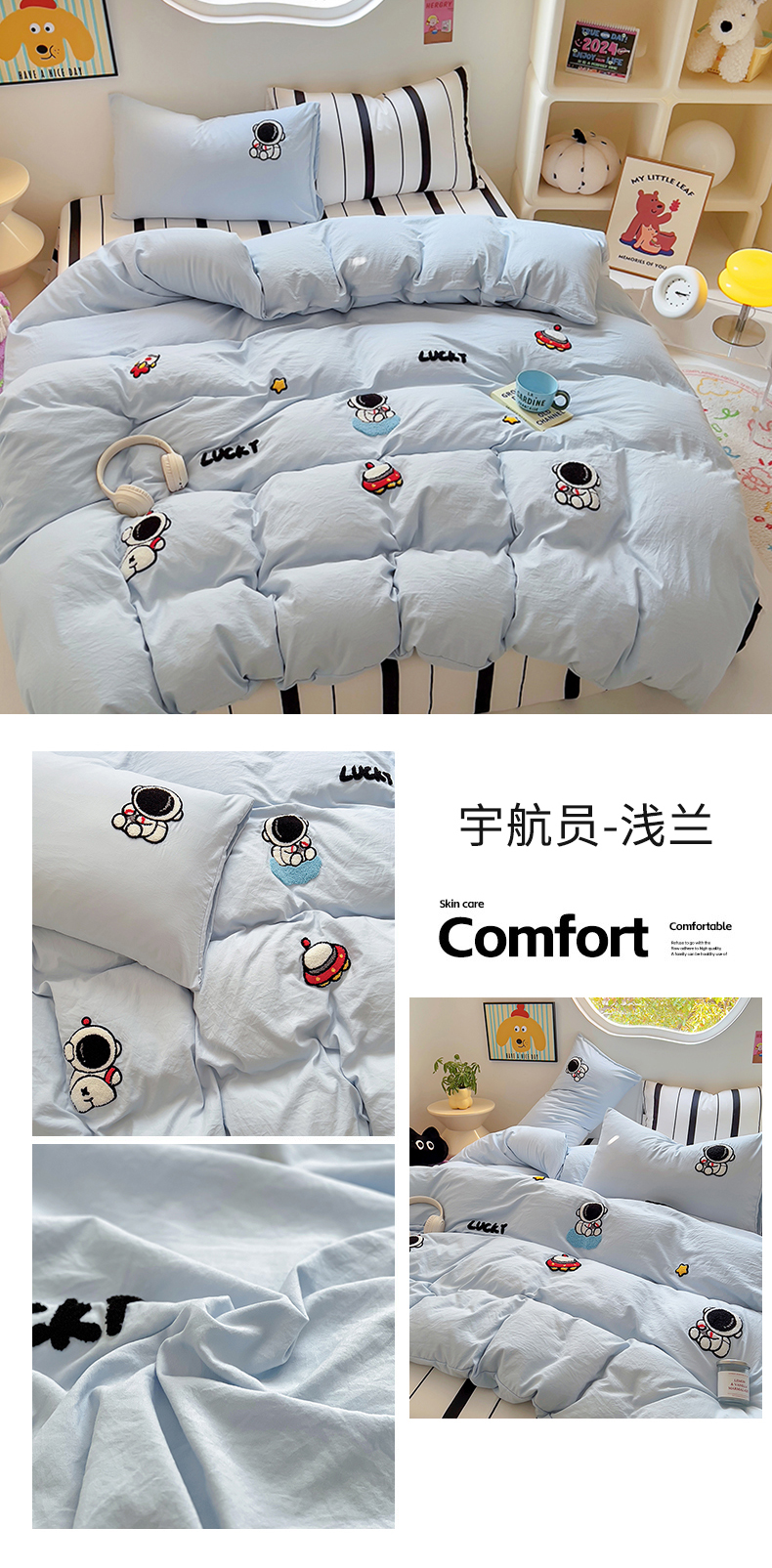 当前位置: 91家纺网 > 商品网购 > 床品套件 > 四件套 > 水洗棉四件套 > 易辰美 2024新款条纹水洗棉毛巾绣四件套(专版) 宇航员-浅兰