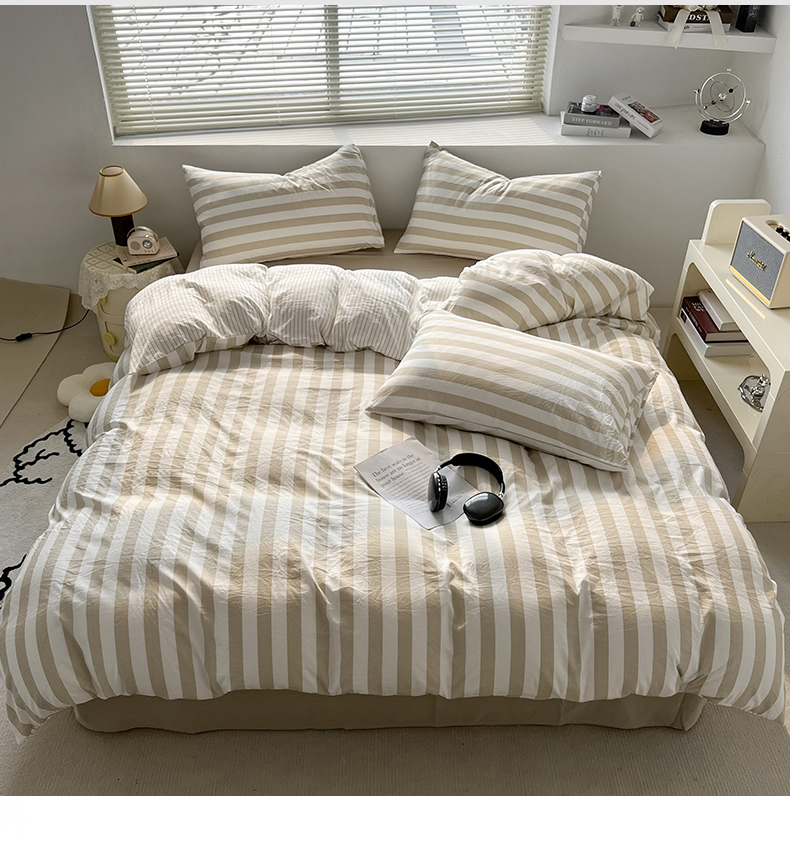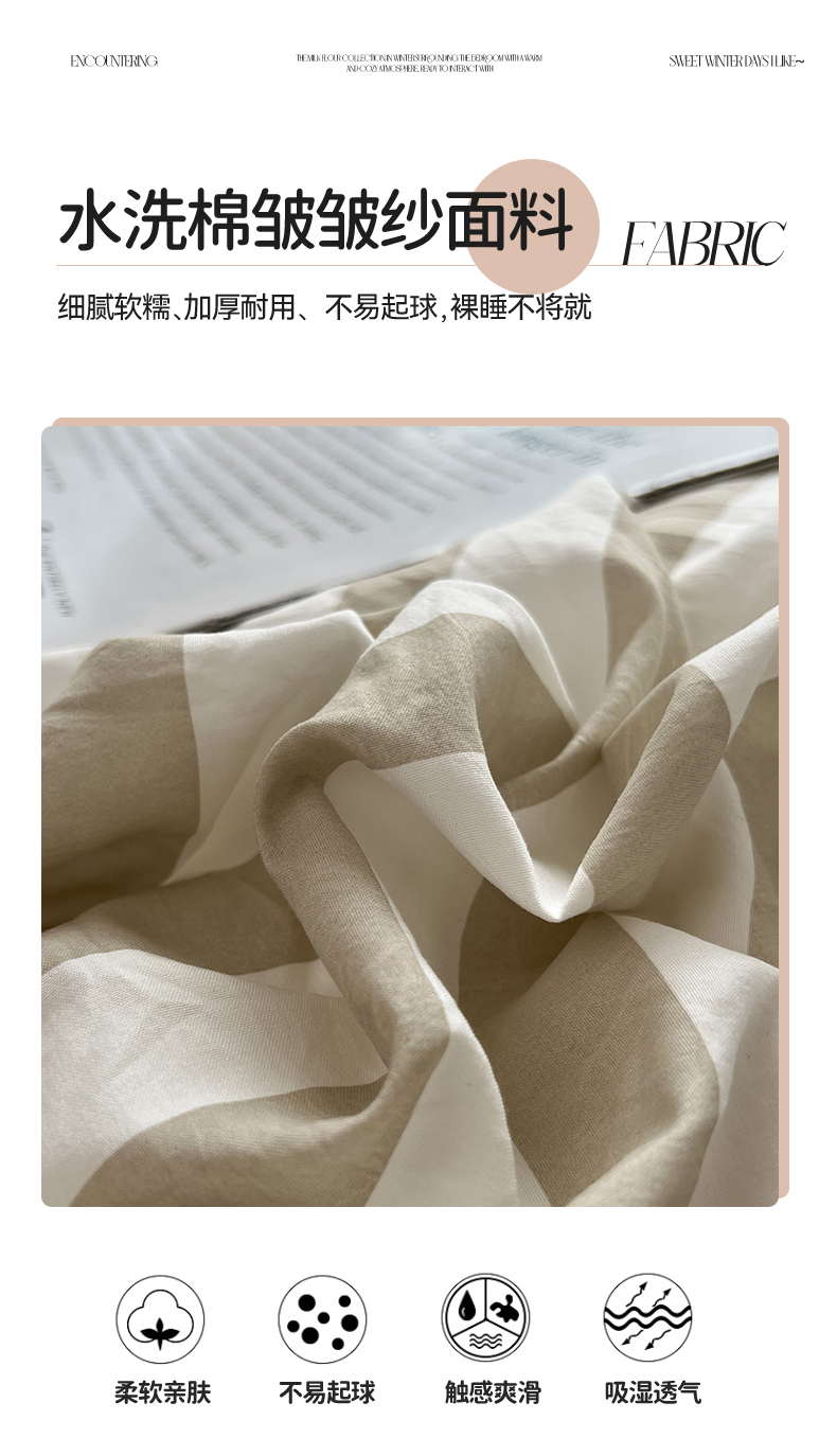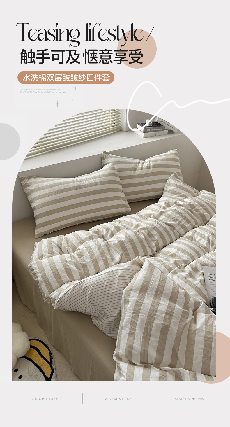 当前位置: 91家纺网 > 商品网购 > 床品套件 > 四件套 > 全棉普通四件套 > 多品 2024新款高克重水洗棉双层纱皱皱纱四件套 暮落浅咖