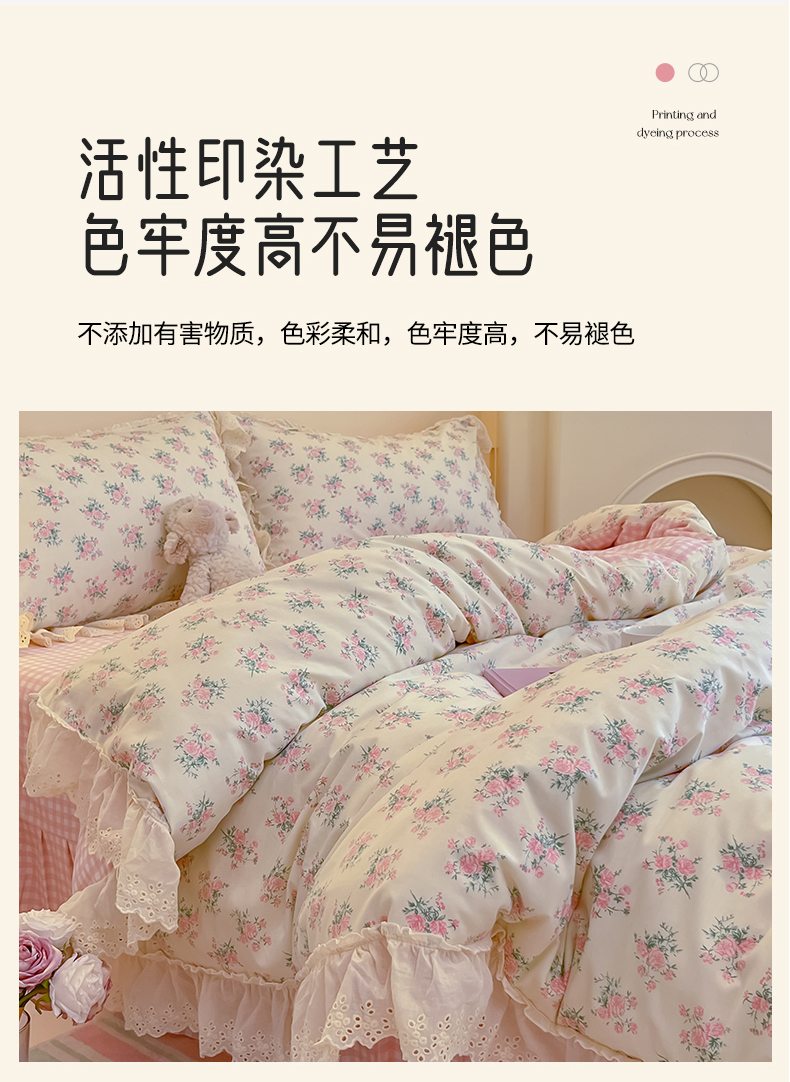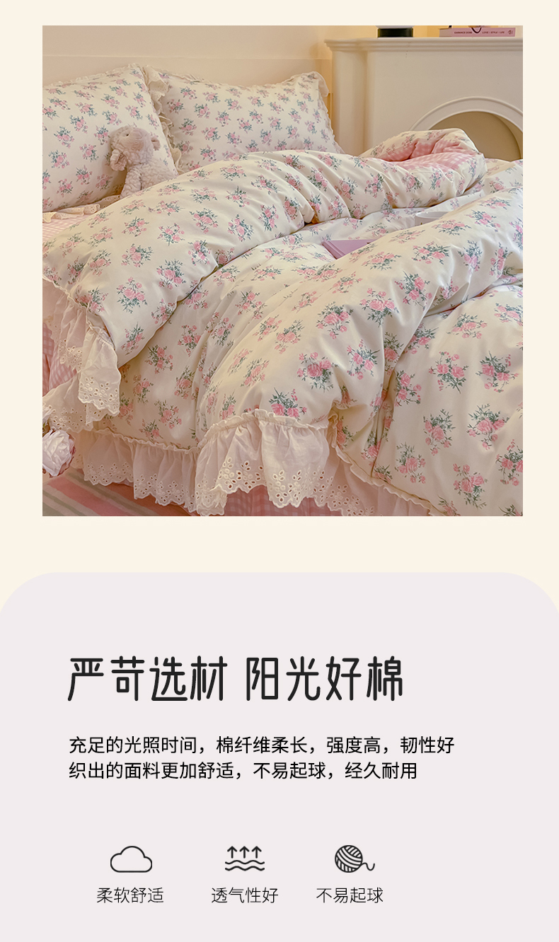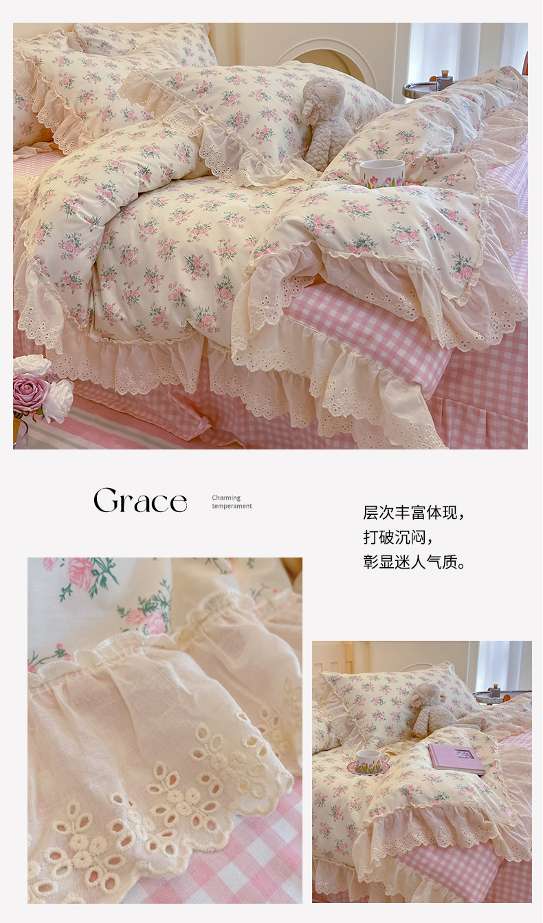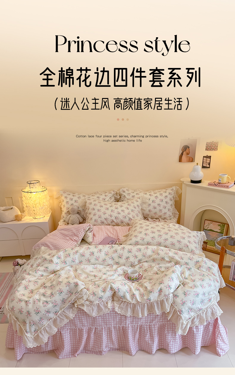 商品名称:金丝鸟家纺 2024新款韩式全棉镂空大花边公主风花卉系列四件套 花韵
