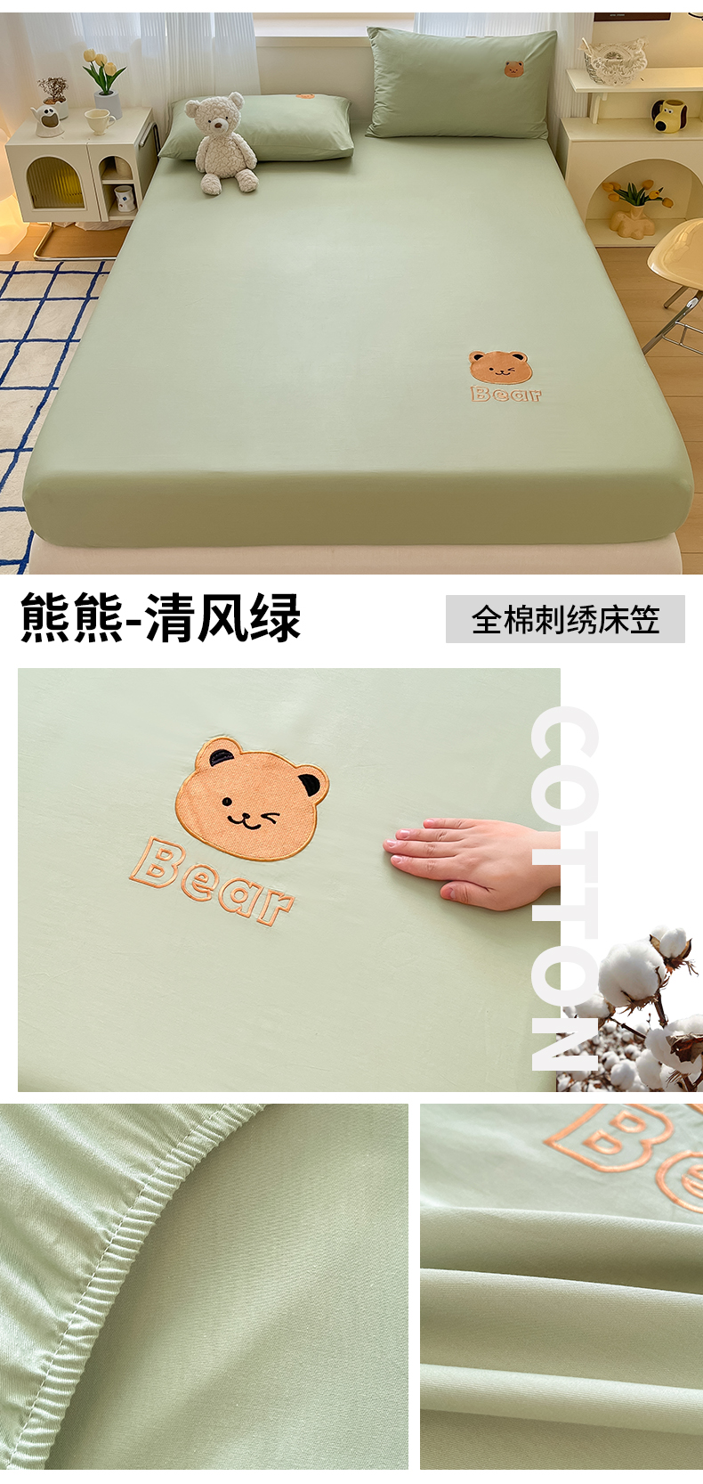 九亭家纺 2024新款熊熊系列全棉刺绣单层床笠 熊熊-清风绿