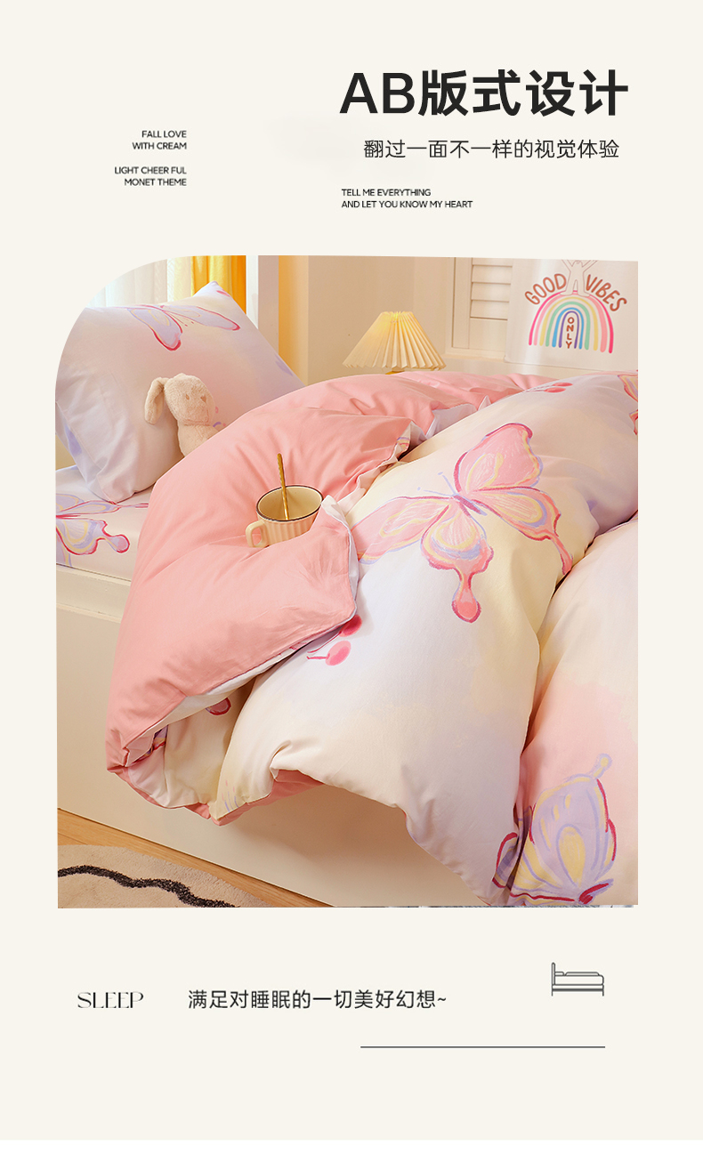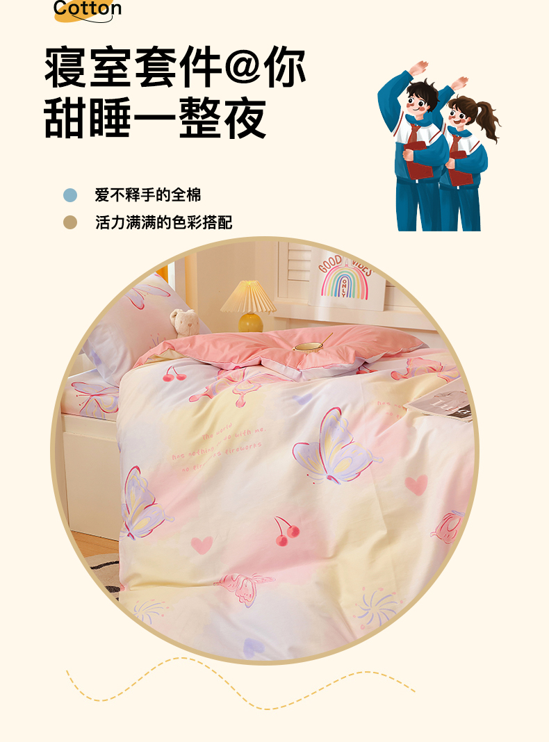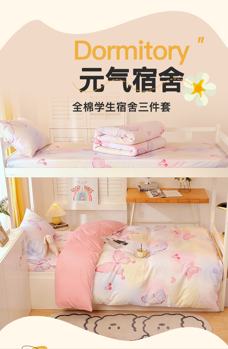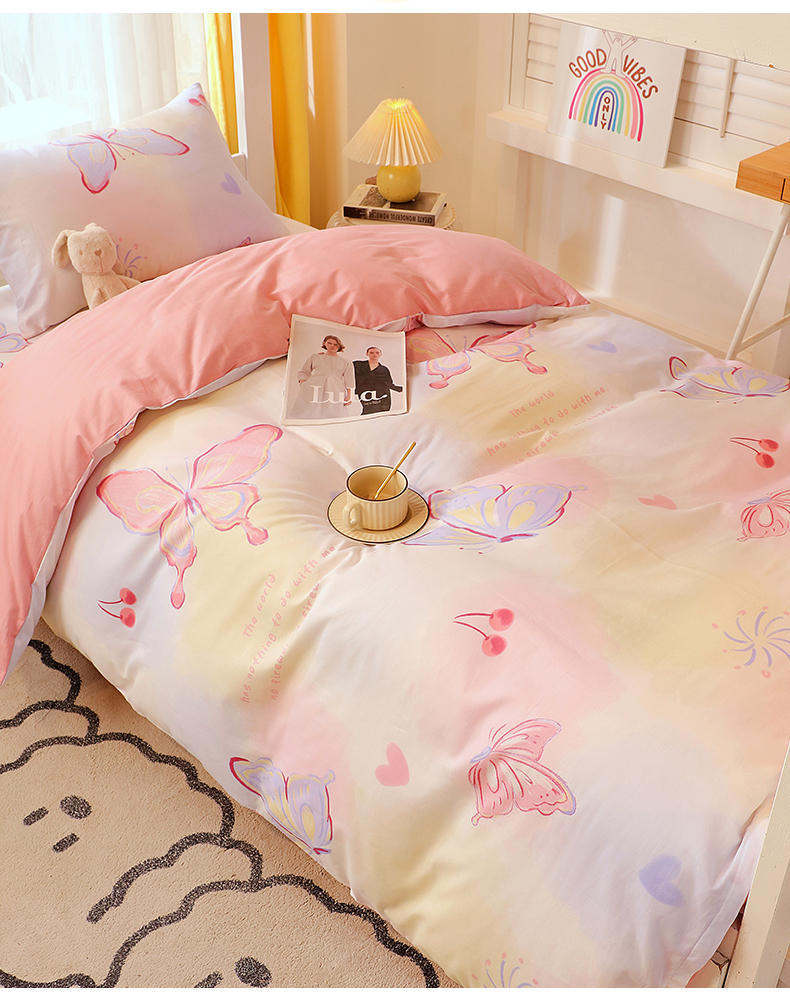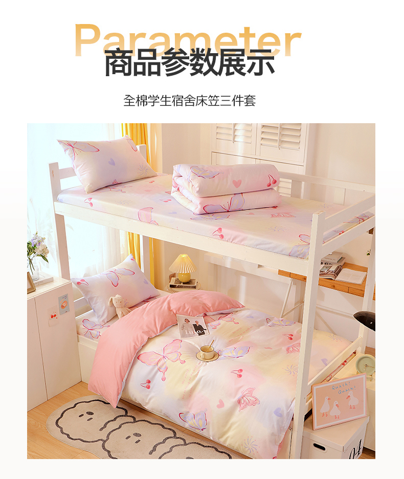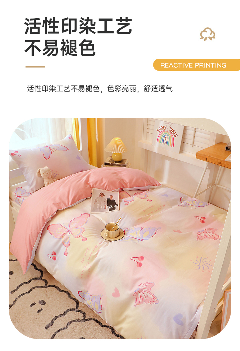 当前位置: 91家纺网 > 商品网购 > 床品套件 > 三件套 > 金鑫汇家纺 2024新款全棉宿舍印花三件套第三批 彩蝶飞舞