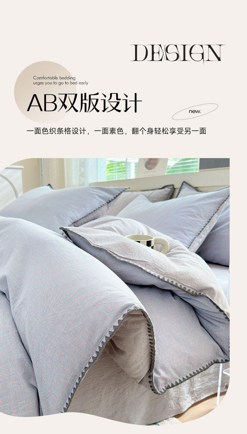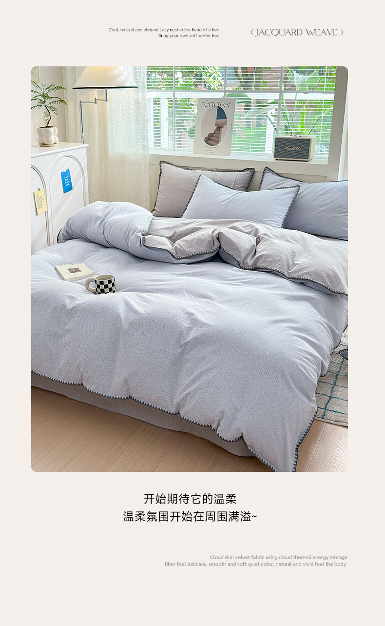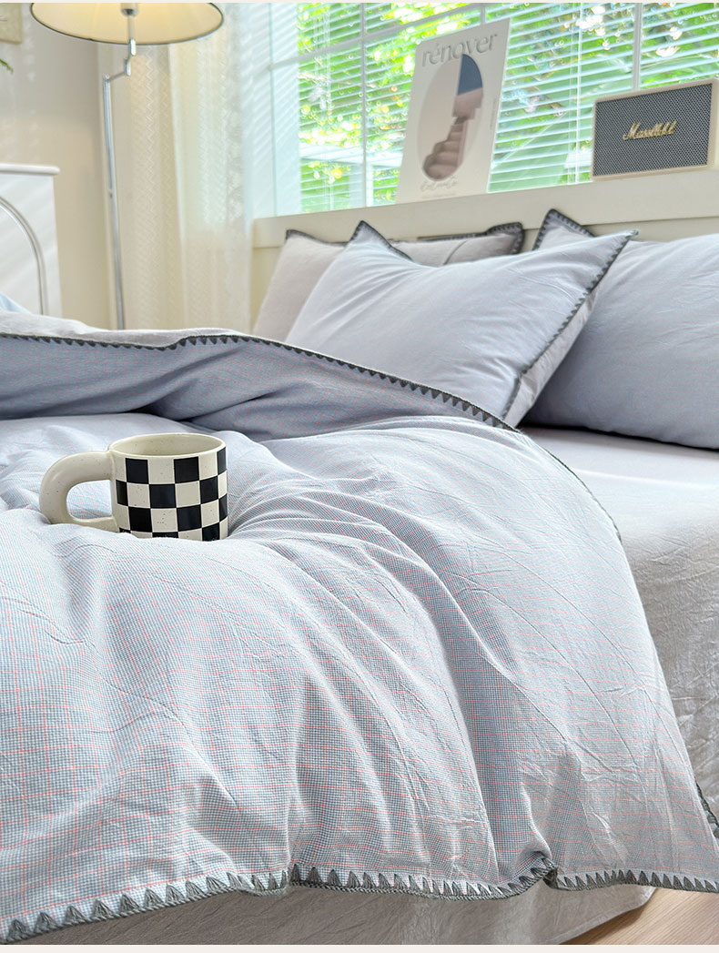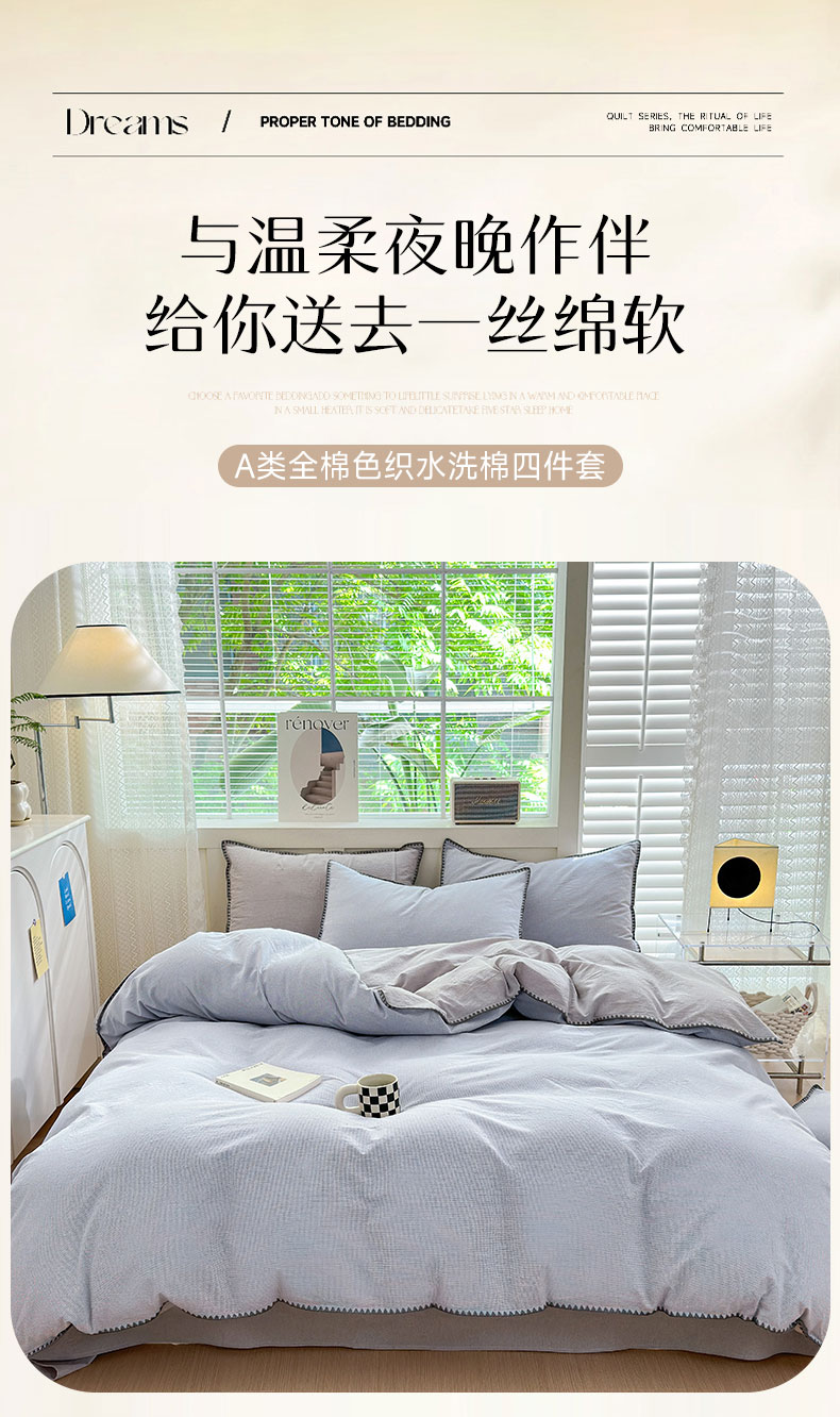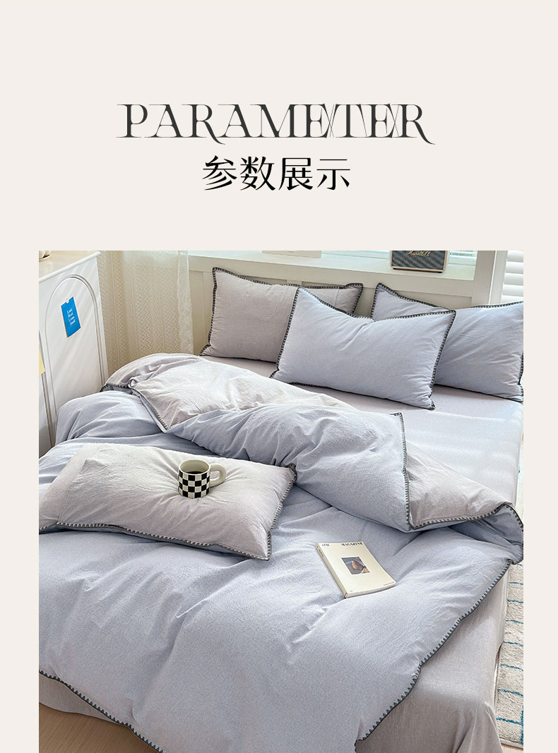 当前位置: 91家纺网 > 商品网购 > 床品套件 > 四件套 > 全棉普通四件套 > 宜家坊 2024新款A类全棉色织水洗棉贝壳边绣三角针工艺四件套可定制 星语-浅灰
