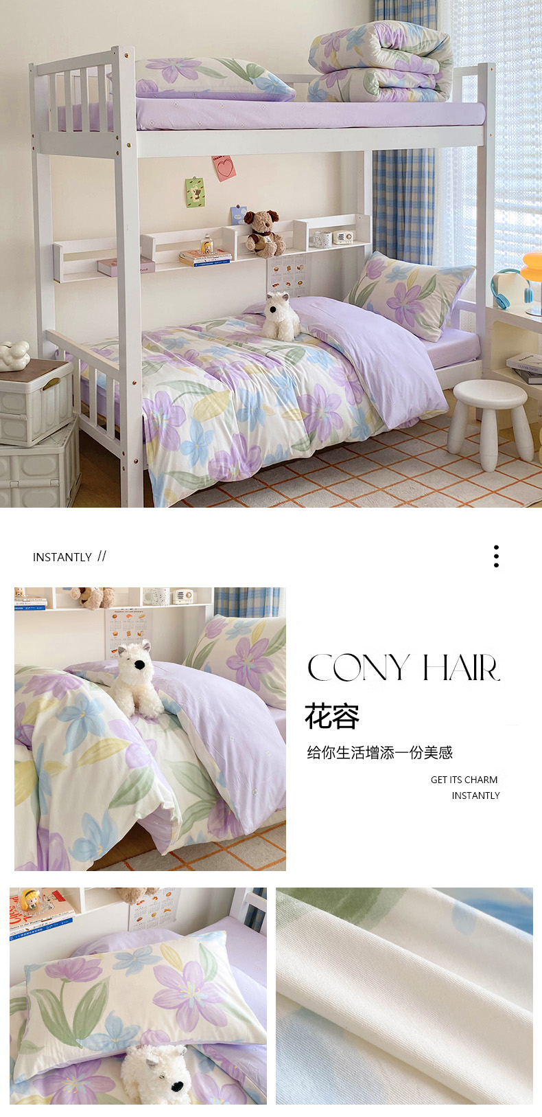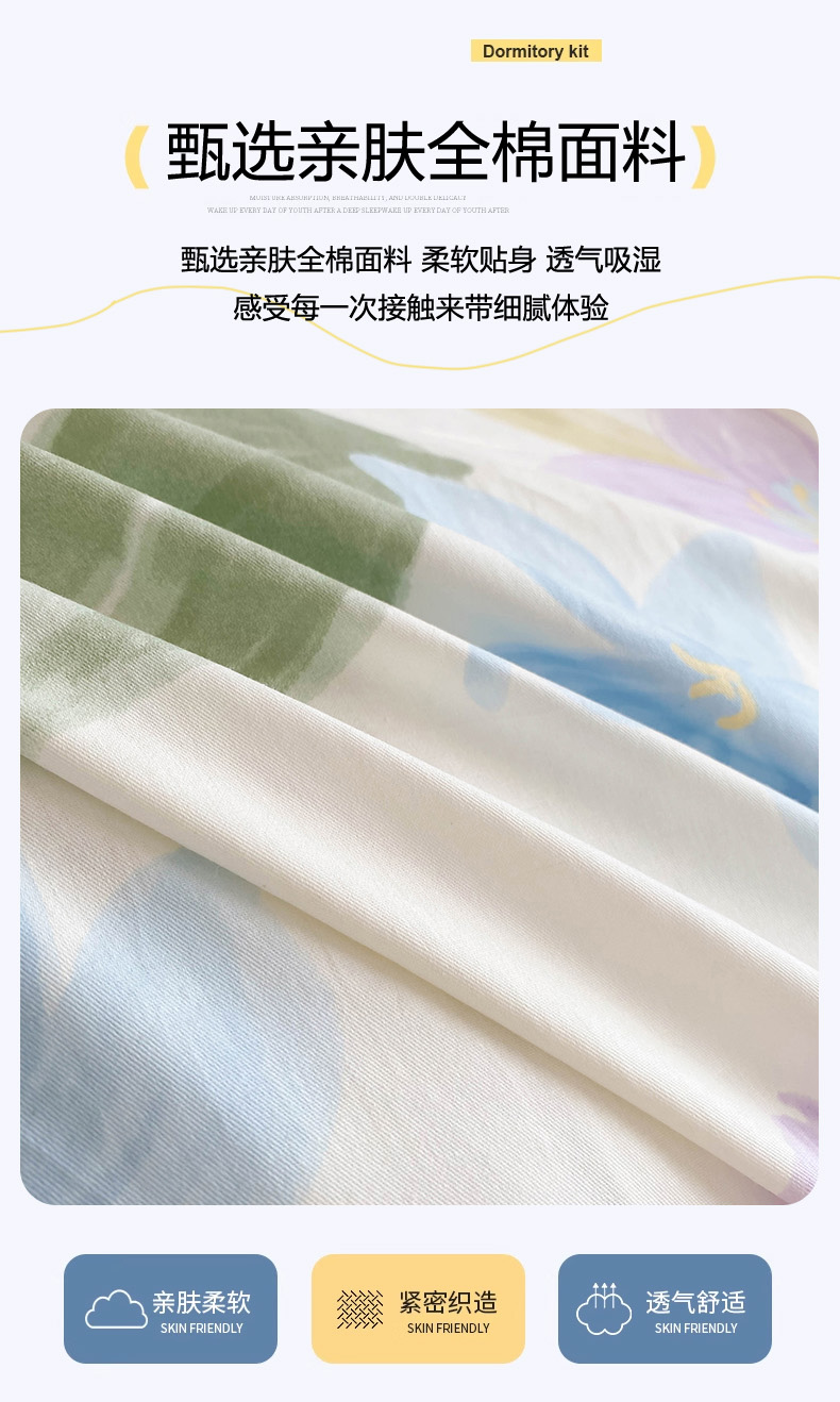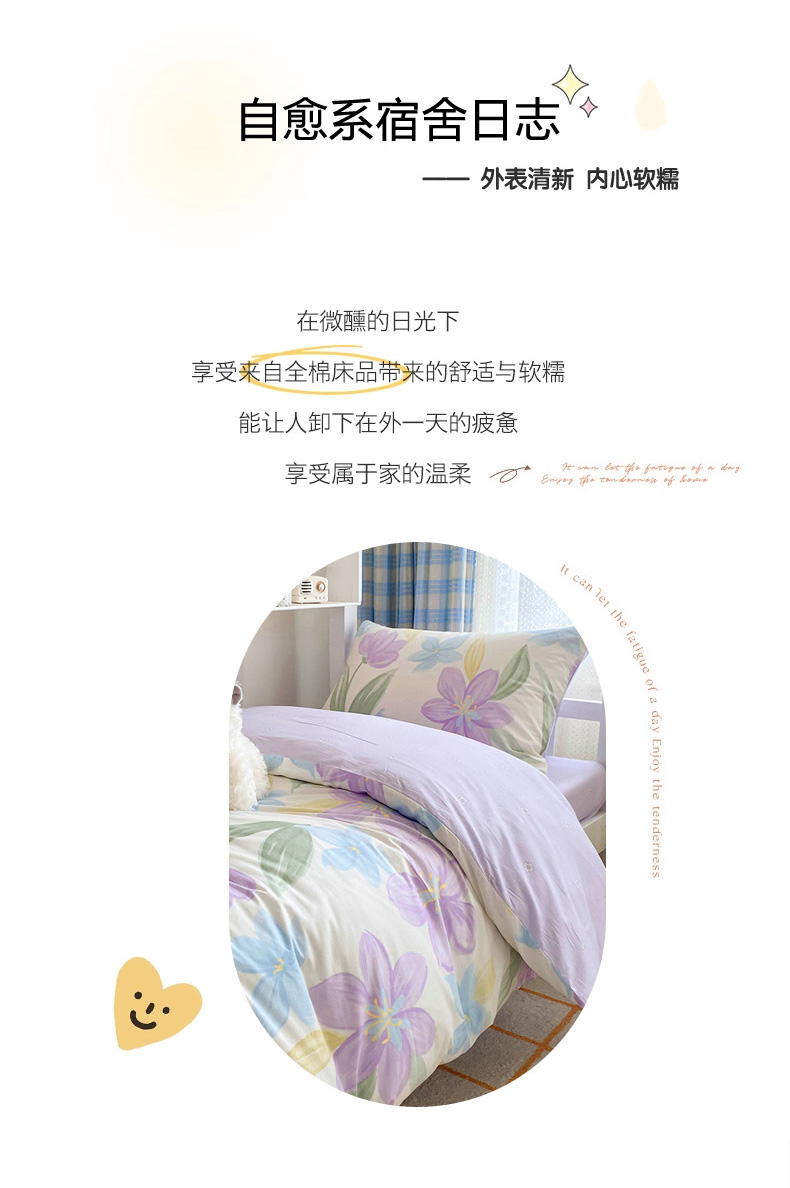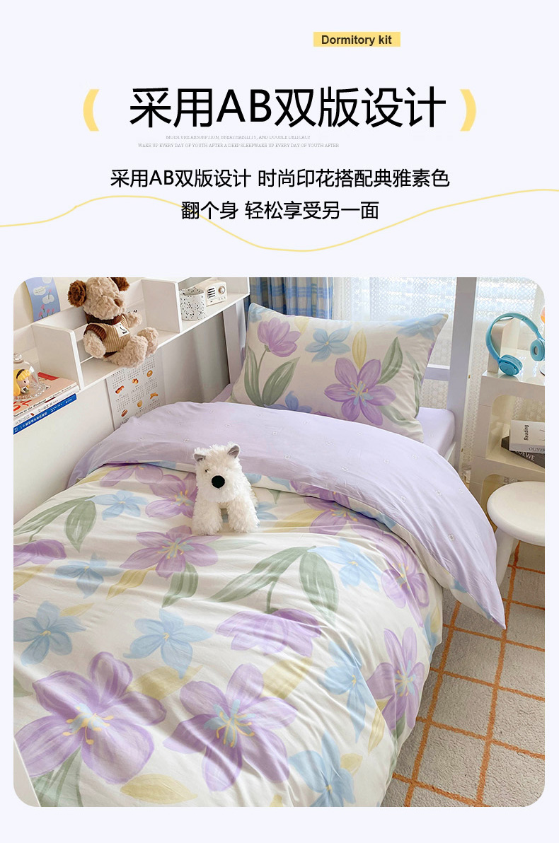 商品名称:倾慕家纺 2024新款清新风纯棉印花学生套件系列 花容