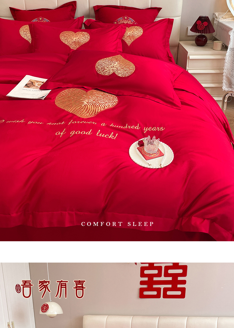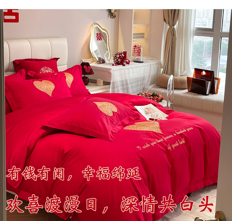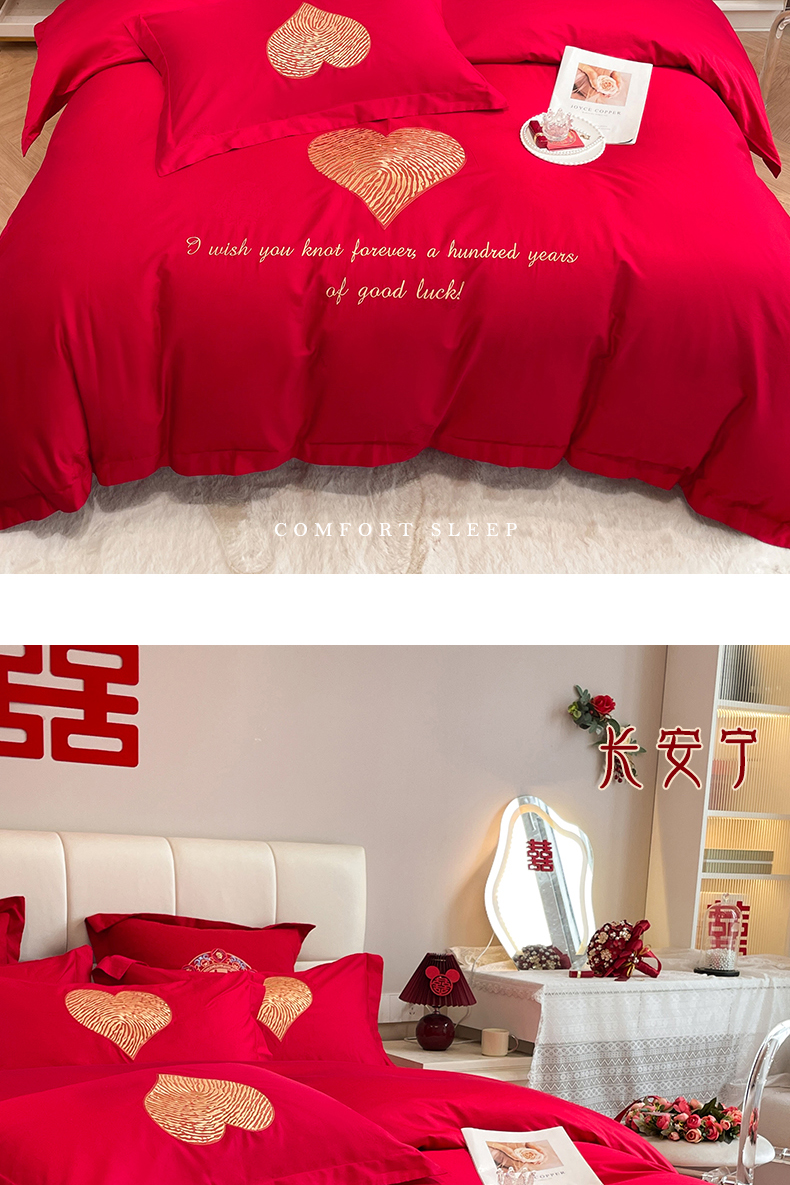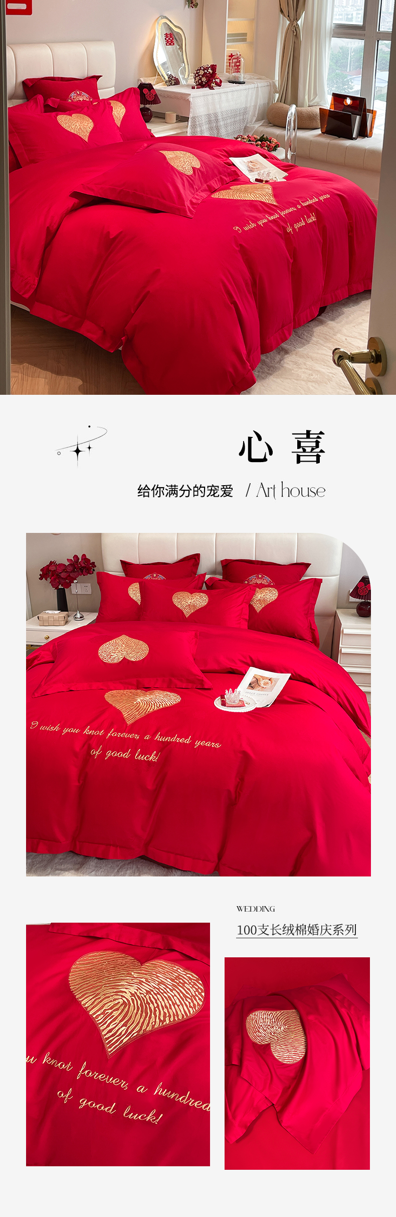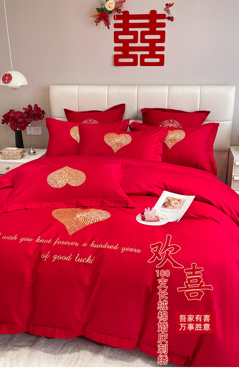 当前位置: 91家纺网 > 商品网购 > 床品套件 > 四件套 > 婚庆四件套 > 玉雅家纺 2025新款100支长绒棉高档提花刺绣婚庆四件套 心喜