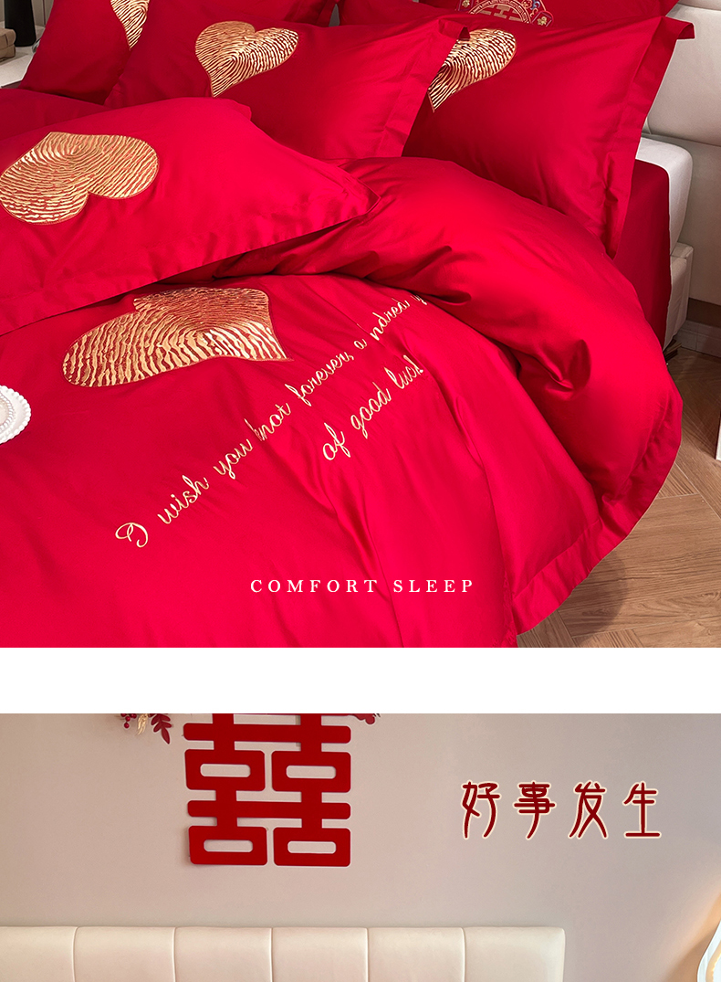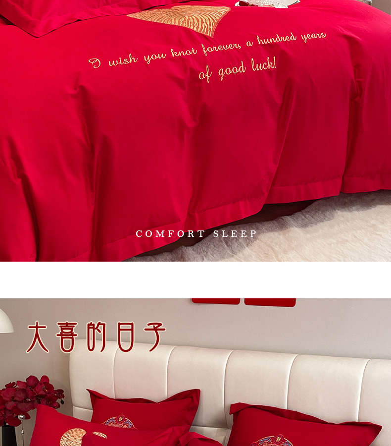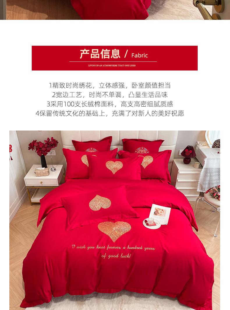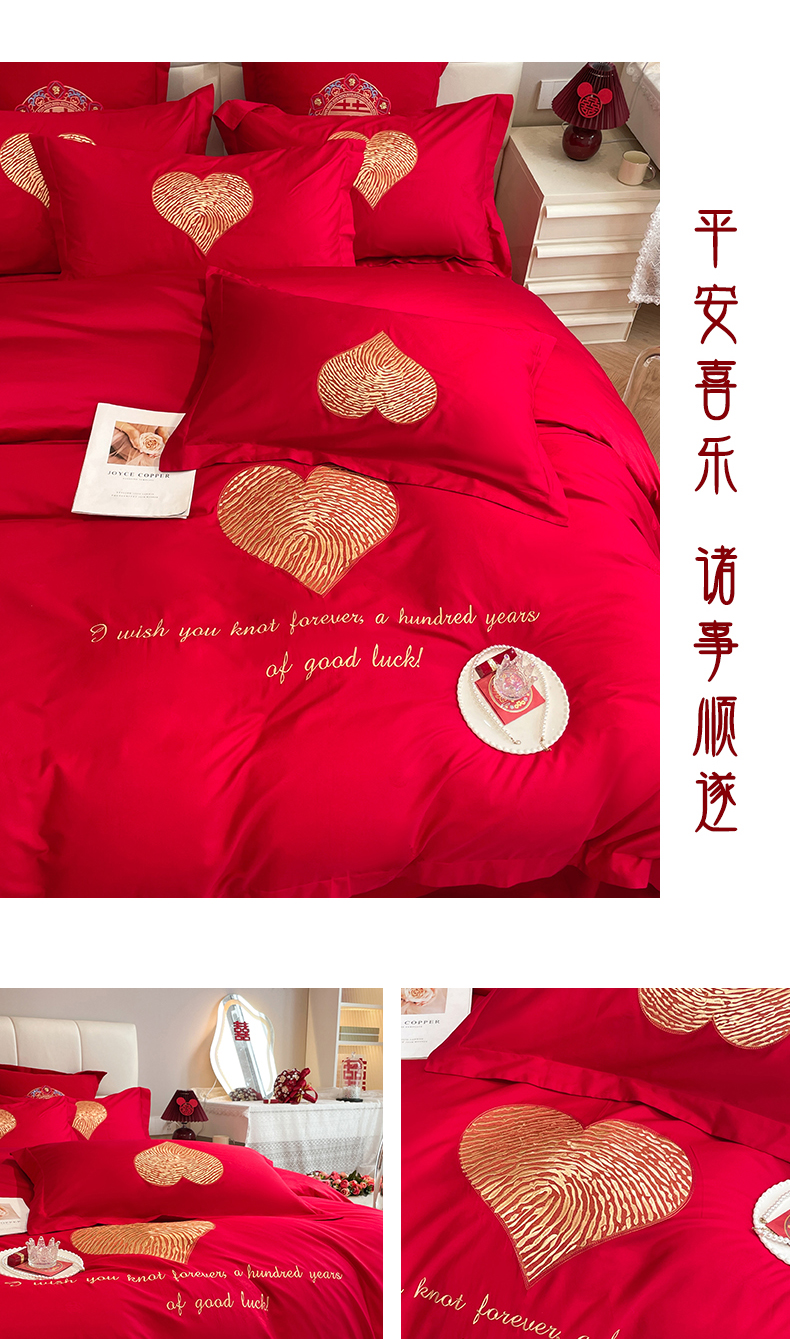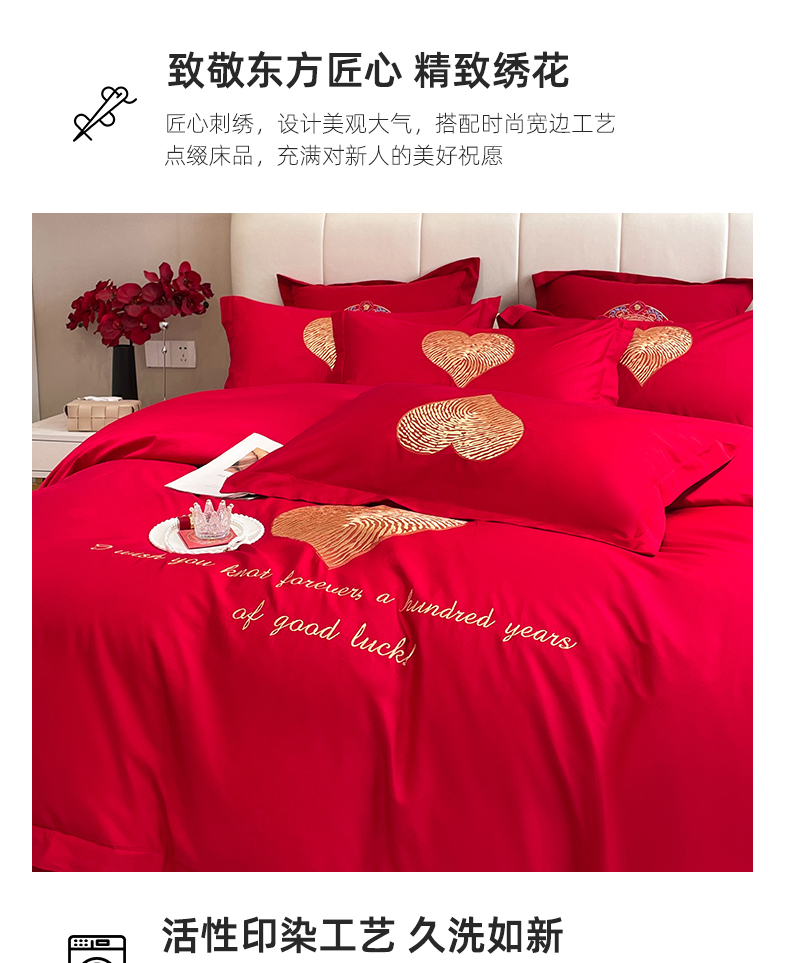 当前位置: 91家纺网 > 商品网购 > 床品套件 > 四件套 > 婚庆四件套 > 玉雅家纺 2025新款100支长绒棉高档提花刺绣婚庆四件套 心喜